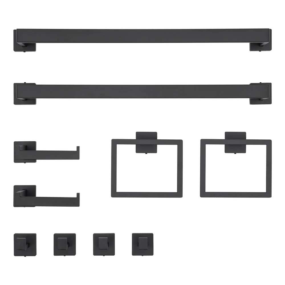 10-piece Matte Black Bathroom Accessories Set Wall Mounted Bathroom Towel Bars Description This 10-piece matte black bathroom accessories set, with elegant lines in your bathroom space, is not only a practical choice for daily use but also a delicate display of home taste. Selected 201 stainless steel material, it is durable and easy to maintain, so that every touch becomes enjoyable, adding a calm and cozy to your life. Key Features Premium Material: They are made of high-quality 201 stainless steel with a spray coating surface, which can prevent rust and corrosion, and can guarantee performance and aesthetics when placed in the bathroom for a long time. 10 Pieces Combination: The set includes 2 x 15.75in towel bars, 2 x towel rings, 2 x toilet paper holders, and 4 x towel hooks, which can effectively meet the needs of towels and toilet paper in your bathroom, and reduce the necessity for you to buy extra. Understated Beauty: The classic black color can be adapted to a variety of bathroom styles, in addition to the unique matte surface can also add a sense of understated luxury to the bathroom. Stable Support: 1.97*1.97in base and perforated mounting allows our towel bar, towel ring, toilet paper holder, and towel hook to hold a stable 22.05lbs each, so you can use it with peace of mind. Life Assistant: With this bathroom set, you and your family can conveniently access towels, washcloths, toilet paper, etc. while keeping items hygienic and tidy. Easy to Clean: The smooth, matte surface can greatly reduce the traces of fingerprints and water stains, and the simple structure is also convenient for you to remove dust and stains with a damp rag. Simple to Install: We provide complete screw fittings and an installation instruction for installation, so you can complete the installation quickly and independently. Customer Service: We aim to provide quality products and services. If you have any problems, please feel free to contact us. We will reply and solve the problem for you as soon as possible. Details Thoughtful Grooves: The toilet paper holders are specially designed with grooves to hold the toilet paper in place better and allow for smoother access. Rounded Corners: Smooth and burr-free corners can greatly enhance safety and aesthetics during installation and use. Application It can be installed in bathrooms, homes, hotels, restrooms, shopping malls, etc. to hold towels, toilet paper, and other household items. Specification Material: 201 Stainless Steel Process: Spray Coating Color: Matte Black Assembly Required: Yes Mount Type: Wall Mounted Installation Method: Perforated Installation Each Load Capacity: 10kg/22.05lbs Each Towel Bar Size: 40*8.2cm/15.75*3.23in Each Toilet Paper Holder Size: 15.8*8.5*5cm/6.22*3.35*1.97inch Each Towel Hook Size: 5*5*5.2cm/1.97*1.97*2.05in Each Towel Ring Size: 16*13*6.4cm/6.3*5.12*2.52in Each Base Size: 5*5cm/1.97*1.97in Package Size: 62.5*25.5*7.5cm/24.61*10.04*2.95in Gross Weight: 2kg/4.41lbs Package Included 2* Towel Bars 2* Toilet Paper Holders 2* Towel Rings 4* Towel Hooks 1* English Instruction All Accessories for Use Notes Please check the style and size before purchasing. Please follow the diagram for installation. Please use a drill bit that matches the size of the screw to drill the hole. Otherwise, it will result in failure to fix the base. Please note that this product does not contain towels, toilet paper, etc. Please allow the slight color difference caused by the shooting light and 1-3cm error due to manual measurement and make sure you do not mind before ordering. Payment Delivery details Terms of sales About us Contact us Payment We accept ebay payment 。 Fees such as import duties, taxes are not included in the item price or shipping costs. These charges are the buyer's responsibility. Delivery details Shipping: 2-9 working days to: USA Terms of sales We maintain high standards of excellence and strive for hundred percent customer satisfaction. Feedback is very important to us. We hope that you contact us immediately before you give neutral or negative feedback, so that we can address your concerns. It is impossible to address issues if we do not know about them! About us Your satis faction is our ultimate goal. We work hard to earn your trust and future business. Our certified technicians have tested each item before shipping. The unit comes with 1 year limited warranty on all manufacturing defects. a) If you receive a defective item, you may return it or ask for a discount. Please contact us within 14 days after you receive the package. b) What you returned must be intact and in its original packaging as re? u. Customer is responsible for shipping costs of the returned item. c) We will cover the cost of shipping back t with the shipping rate indicated in the registration page. We will send you a new unit or refund the full payment you paid. Thank you. Contact us Business Hour Business Hour: Monday To Friday: 8:30 AM to 5:00 PM (Beijing China time) Due to time zones, our reply to your questions may not be immediately. But within above working time, we will reply your email within 24 hours. If it's non-workdays, please kindly be patient and wait till Monday. Please contact us with ebay message. Please feel free to contact us if you have any questions. Monday To Friday: 8:30 AM to 5:00 PM (Beijing China time) Due to time zones, our reply to your questions may not be immediately. But within above working time, we will reply your email within 24 hours. If it's non-workdays, please kindly be patient and wait till Monday. Please contact us with ebay message. Please feel free to contact us if you have any questions. Color Matte Black Brand Unbranded Material 201 Stainless Steel Process Spray Coating Assembly Required Yes Mount Type Wall Mounted Installation Method Perforated Installation Each Load Capacity 10kg/22.05lbs Each Towel Bar Size 40*8.2cm/15.75*3.23in Each Toilet Paper Holder Size 15.8*8.5*5cm/6.22*3.35*1.97inch Each Towel Hook 