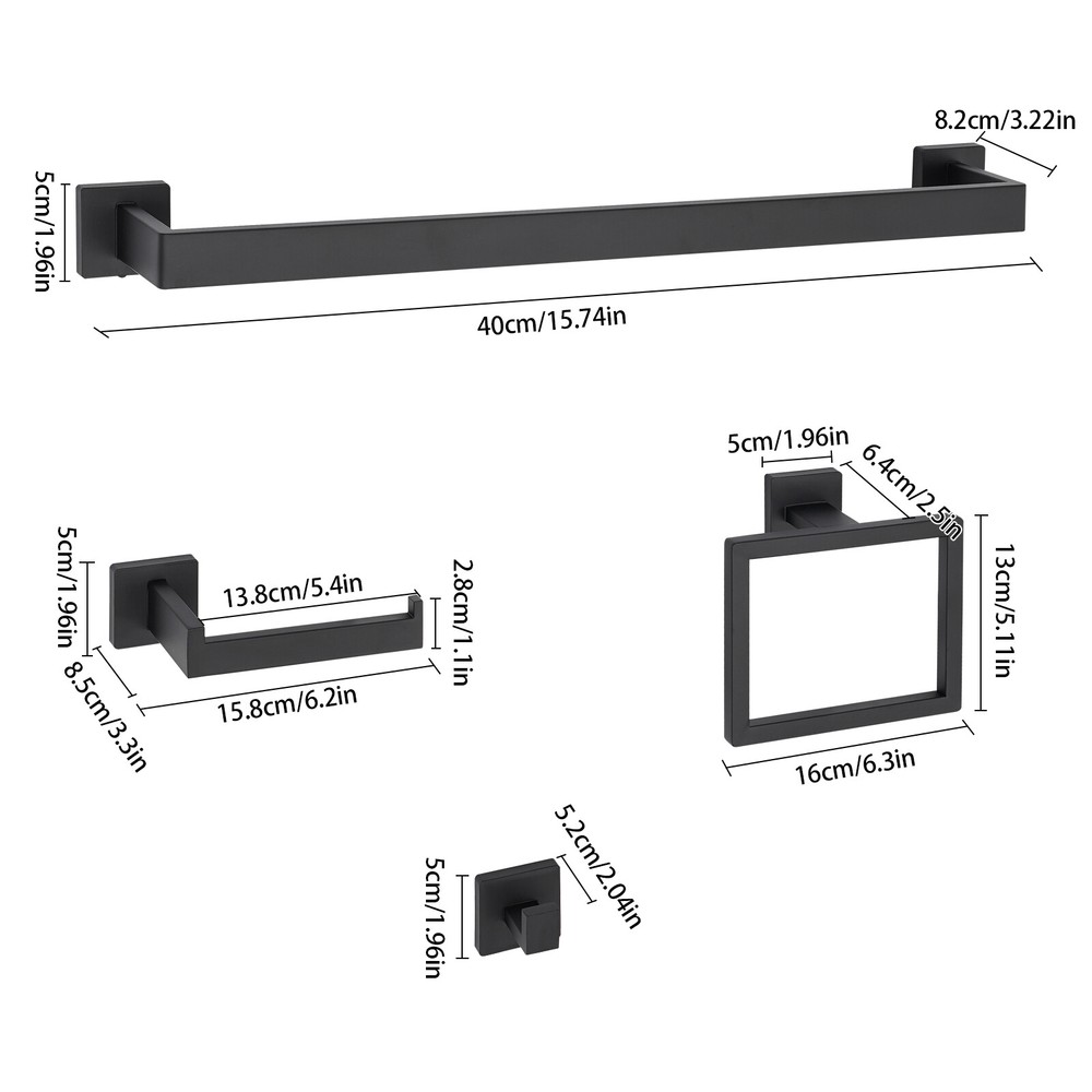 Specification Material: 201 Stainless Steel Color: Matte Black Process: Spray Coating Assembly Required: Yes Mount Type: Wall Mounted Installation Method: Perforated Installation Each Load Capacity: 10kg/22.05lbs Each Towel Bar Size: 40*8.2cm/15.75*3.23in Each Toilet Paper Holder Size: 15.8*8.5*5cm/6.22*3.35*1.97inch Each Towel Hook Size: 5*5*5.2cm/1.97*1.97*2.05in Each Towel Ring Size: 16*13*6.4cm/6.3*5.12*2.52in Each Base Size: 5*5cm/1.97*1.97in Package Size: 62.5*25.5*7.5cm/24.61*10.04*2.95in Gross Weight: 2kg/4.41lbs Package Included 2* Towel Bars 2* Toilet Paper Holders 2* Towel Rings 4* Towel Hooks 1* English Instruction All Accessories for Use 10-piece Matte Black Bathroom Accessories Set Wall Mounted Bathroom Towel Bars 10-Piece Matte Black Bathroom Accessories Set Wall Mounted Bathroom Towel Bars Description This 10-Piece Matte Black Bathroom Accessories Set, with Elegant Lines in Your Bathroom Space, Is Not Only a Practical Choice for Daily Use but Also a Delicate Display of Home Taste. Selected 201 Stainless Steel Material, It Is Durable and Easy to Maintain, so That Every Touch Becomes Enjoyable, Adding a Calm and Cozy to Your Life. Key Features Premium Material: They Are Made of High-quality 201 Stainless Steel with a Spray Coating Surface, Which Can Prevent Rust and Corrosion, and Can Guarantee Performance and Aesthetics When Placed in the Bathroom for a Long Time. 10 Pieces Combination: the Set Includes 2 X 15.75in Towel Bars, 2 X Towel Rings, 2 X Toilet Paper Holders, and 4 X Towel Hooks, Which Can Effectively Meet the Needs of Towels and Toilet Paper in Your Bathroom, and Reduce the Necessity for You to Buy Extra. Understated Beauty: the Classic Black Color Can Be Adapted to a Variety of Bathroom Styles, in Addition to the Unique Matte Surface Can Also Add a Sense of Understated Luxury to the Bathroom. Stable Support: 1.97*1.97in Base and Perforated Mounting Allows Our Towel bar, Towel Ring, Toilet Paper Holder, and Towel Hook to Hold a Stable 22.05lbs Each, so You Can Use It with Peace of Mind. Specification Material: 201 Stainless Steel Process: Spray Coating Color: Matte Black Assembly Required: Yes Mount Type: Wall Mounted Installation Method: Perforated Installation Each Load Capacity: 10kg/22.05lbs Each Towel bar Size: 40*8.2cm/15.75*3.23in Each Toilet Paper Holder Size: 15.8*8.5*5cm/6.22*3.35*1.97inch Each Towel Hook Size: 5*5*5.2cm/1.97*1.97*2.05in Each Towel Ring Size: 16*13*6.4cm/6.3*5.12*2.52in Each Base Size: 5*5cm/1.97*1.97in Package Size: 62.5*25.5*7.5cm/24.61*10.04*2.95in Gross Weight: 2kg/4.41lbs Package Included 2* Towel Bars 2* Toilet Paper Holders 2* Towel Rings 4* Towel Hooks 1* English Instruction All Accessories for Use Details Thoughtful Grooves: the Toilet Paper Holders Are Specially Designed with Grooves to Hold the Toilet Paper in Place Better and Allow for Smoother Access. Rounded Corners: Smooth and Burr-free Corners Can Greatly Enhance Safety and Aesthetics During Installation and Use. Application It Can Be Installed in Bathrooms, Homes, Hotels, Restrooms, Shopping Malls, Etc. to Hold Towels, Toilet Paper, and Other Household Items. Notes Please Check the Style and Size Before Purchasing. Please Follow the Diagram for Installation. Please Use a Drill Bit That Matches the Size of the Screw to Drill the Hole. Otherwise, It Will Result in Failure to Fix the Base. Please Note That This Product Does Not Contain Towels, Toilet Paper, Etc. Please Allow the Slight Color Difference Caused by the Shooting Light and 1-3cm Error Due to Manual Measurement and Make Sure You Do Not Mind Before Ordering. Payment Delivery details Terms of sales About us Contact us Payment We accept ebay payment 。 Fees such as import duties, taxes are not included in the item price or shipping costs. These charges are the buyer's responsibility. Delivery details Shipping: 2-9 working days to: USA Terms of sales We maintain high standards of excellence and strive for hundred percent customer satisfaction. Feedback is very important to us. We hope that you contact us immediately before you give neutral or negative feedback, so that we can address your concerns. It is impossible to address issues if we do not know about them! About us Your satis faction is our ultimate goal. We work hard to earn your trust and future business. Our certified technicians have tested each item before shipping. The unit comes with 1 year limited warranty on all manufacturing defects. a) If you receive a defective item, you may return it or ask for a discount. Please contact us within 14 days after you receive the package. b) What you returned must be intact and in its original packaging as re? u. Customer is responsible for shipping costs of the returned item. c) We will cover the cost of shipping back t with the shipping rate indicated in the registration page. We will send you a new unit or refund the full payment you paid. Thank you. Contact us Business Hour Business Hour: Monday To Friday: 8:30 AM to 5:00 PM (Beijing China time) Due to time zones, our reply to your questions may not be immediately. But within above working time, we will reply your email within 24 hours. If it's non-workdays, please kindly be patient and wait till Monday. Please contact us with ebay message. Please feel free to contact us if you have any questions. Monday To Friday: 8:30 AM to 5:00 PM (Beijing China time) Due to time zones, our reply to your questions may not be immediately. But within above working time, we will reply your email within 24 hours. If it's non-workdays, please kindly be patient and wait till Monday. Please contact us with ebay message. Please feel free to contact us if you have any questions. On Jul 8, 2025 at 00:00:59 PDT, seller added the following information:
