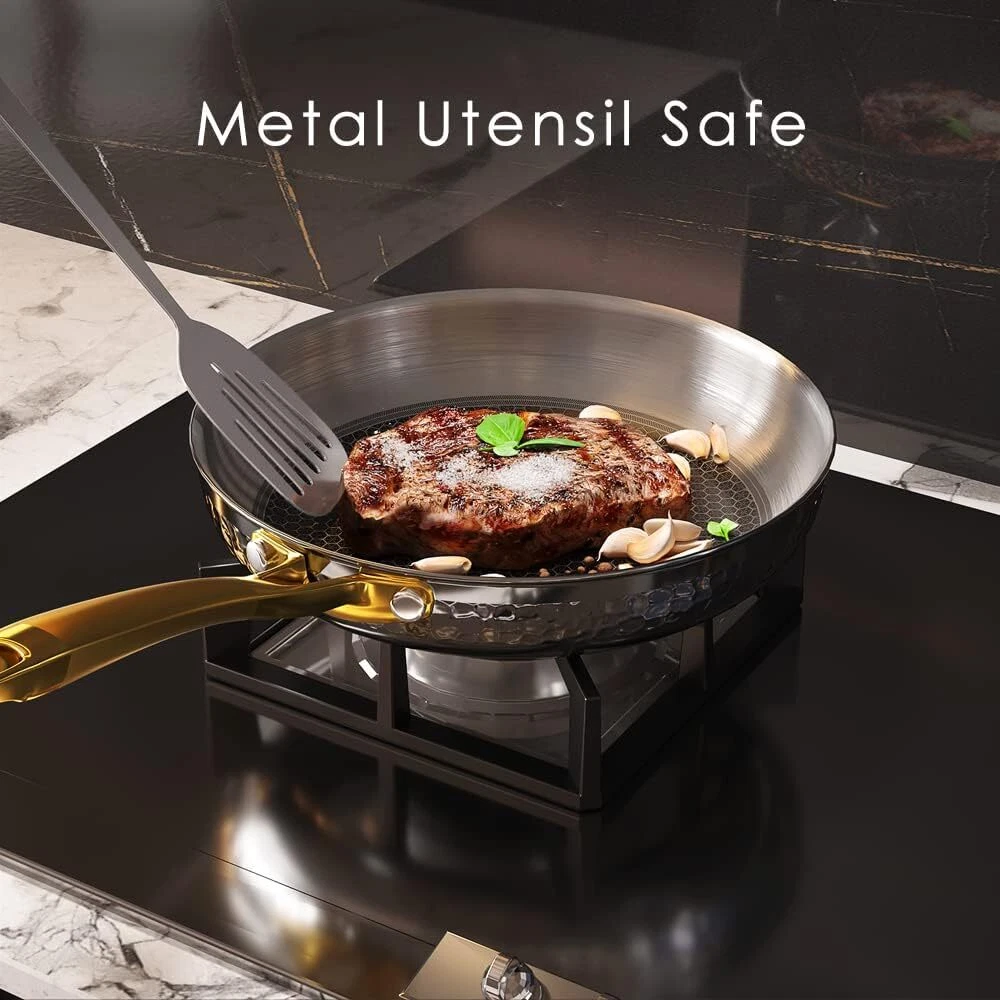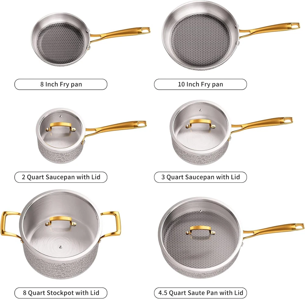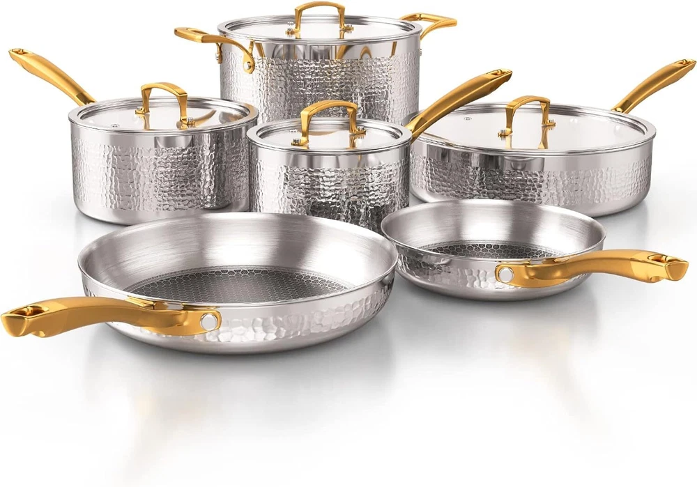 Material 18/8 Stainless Steel, Aluminum, Stainless Steel Color Silver and Gold Size 10-Piece Handle Material Stainless Steel About this item 【Durable for Life】- This set is an investment in quality cookware that will last a lifetime. It includes 8-inch frying pan, 10-inch frying pan, 2-quart sauce pan with lid, 3-quart sauce pan with lid, 4.5-quart sauté pan with lid, and 8-quart stockpot with lid. 【Classic Tri-Ply Construction】- Unlike other brands' impact-bonded aluminum base, Homaz cookware features an entire pot or pan body made of responsive aluminum core bonded together with 2 layers of durable stainless steel for maximum durability and fast, even heat distribution. 【Stylish and Eye-Catching】- Elevate your kitchen with Homaz's stunning stainless steel hammered cookware. Its exquisite design features a unique and attention-grabbing gold handle that is sure to impress. 【Induction-Ready & Dishwasher-Safe】- Compatible with all cook stove tops, including induction, gas, electric, halogen, glass, and ceramic. They're also designed for hassle-free cleaning, with dishwasher-safe materials that are metal utensil safe and non-toxic, PFOA & PFOS free. Plus, oven and broiler safe up to 550°F. 【Cook Like A Pro】- Learn the essential techniques of proper heat control to avoid sticking. (Heat pan add oil and wait to sizzle before adding food.) With a little practice, you'll be able to master the art of cooking with stainless steel cookware and create perfect meals every time.