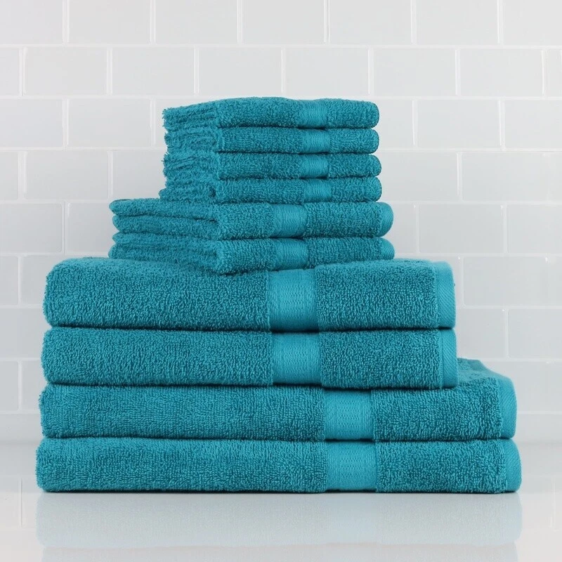 You may also like 10 Pc Towel Set Softness Absorbent Durable 100% Cotton Fade-resistant Bathroom 20.43 USD 21.5 USD Free shipping 5% off 18 Piece Soft Cotton Towel Set Bath Hand Washcloths Oeko-Tex Certified Spa Gym 36.01 USD 37.91 USD Free shipping 5% off Refresh your linen closet with the durable yet incredibly soft and absorbent Basic Solid 10-piece bath set. Crafted using quality yarns these linens are easy care machine washable and ideal for everyday use. The Basic Solid 10-piece bath sets are 100% cotton and are available in several colors. Each set is Oeko-Tex Standard 100 Certified and comes with (2) 30 in. by 60 in. bath sheets, (2) 27 in. by 52 in. bath towels, (2) 16 in. by 26 in. hand towels, and (4) 12 in. by 12 in. washcloths. Complete your collection with a coordinating stripe bath towel or mix and match your colors to create a different atmosphere and color pallet in your bathroom. Whichever look you prefer, the Basic Solid 10-piece bath set is sure to please. Solid Adult 10-Piece Bath Towel Set, Turquoise Machine Washable Oeko-Tex Standard 100 Certified Ultra soft and absorbent+ Fits any bathroom decor with a several mix and match colors to choose from. 100% Cotton Bath Towel Measures: 52 in. by 27 in; Bath Sheet Measures: 30 in. by 60 in. ; Hand Towel Measures: 16 in. by 26 in. ; Wash Cloth Measures: 12 in. by 12 in. For best use, wash separately before first use. Perfect for Hair/Pool/Gym Quick Drying Light and Soft Towels
