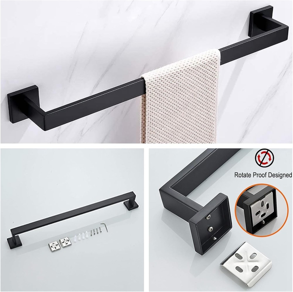 10-Pieces Bathroom Hardware Set Matte Black Accessories Product Details Color: Matte Black Material: Stainless Steel Product Dimensions: 23.6"L x 3.15"W x 2.17"H Finish Type: Powder Coated Brand: TAUN Installation Type: Screw-In Shape: Square Manufacturer: FENGZHUO Item Weight: 5.39 pounds Country of Origin: China Item model number: BN10 ▶【EASY TO INSTALL】: Using screw-mounting with stainless steel screws and anchors in package to make the towel bar set more stable. Screws are made from SUS 304 stainless steel and won't rust. ▶【RUSTPROOF】: The bathroom hardware set constructed of Type 304 premium grade stainless steel, with added 18/8 Chromium/Nickel content to protect against corrosion and rust, suitable for humid environments such as bathroom and kitchen. ▶【10 Piece Kit】: : A set of bathroom hardware includes 10 pieces useful accessories. 2 towel bars, 2 towel rings, 2 toilet paper holder and 4 robe hooks. Use square base, more durable,sturdy and fashion. Concealed screw towel hanger design makes the product look more beautiful and modern, hex screws are reinforced to prevent from rotation. ▶【NOTE】: We don't suggest using glue for install the towel bar, because it is easy to fall off, if you use screws to install, the bearing capacity can reach 20KG.