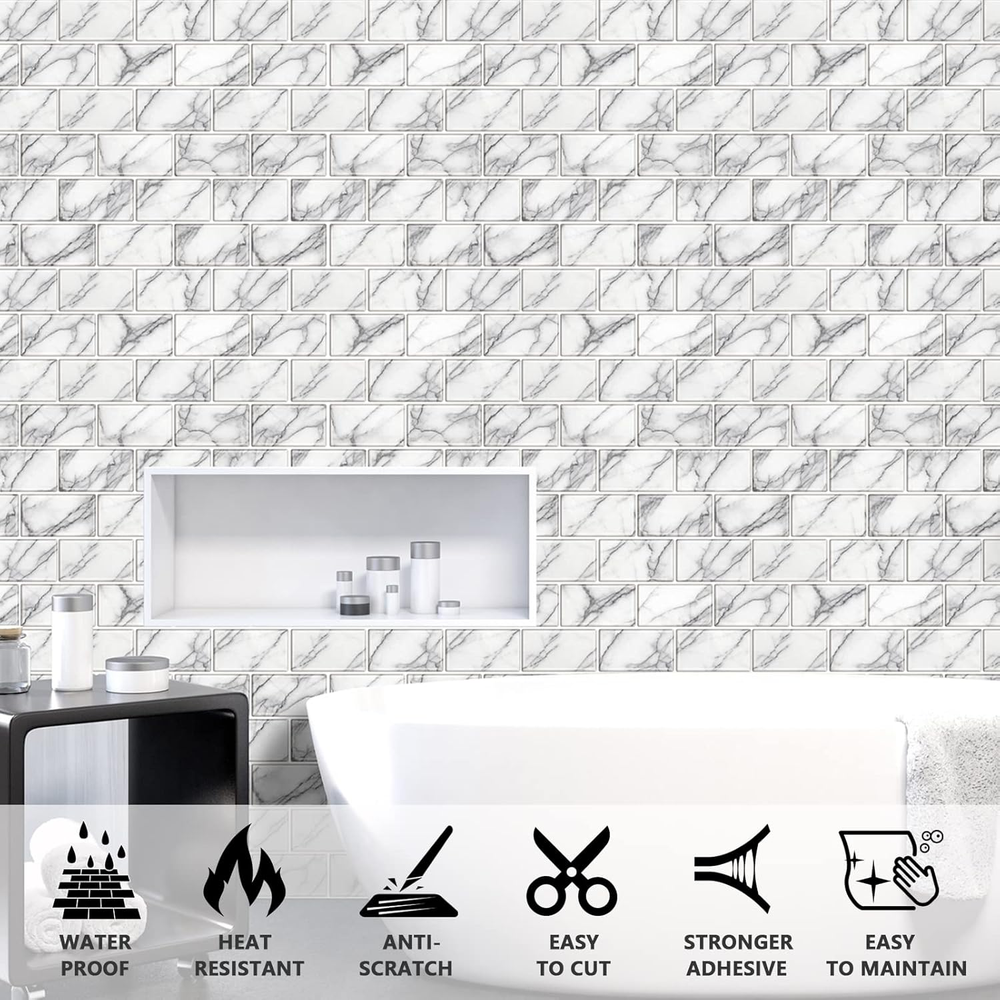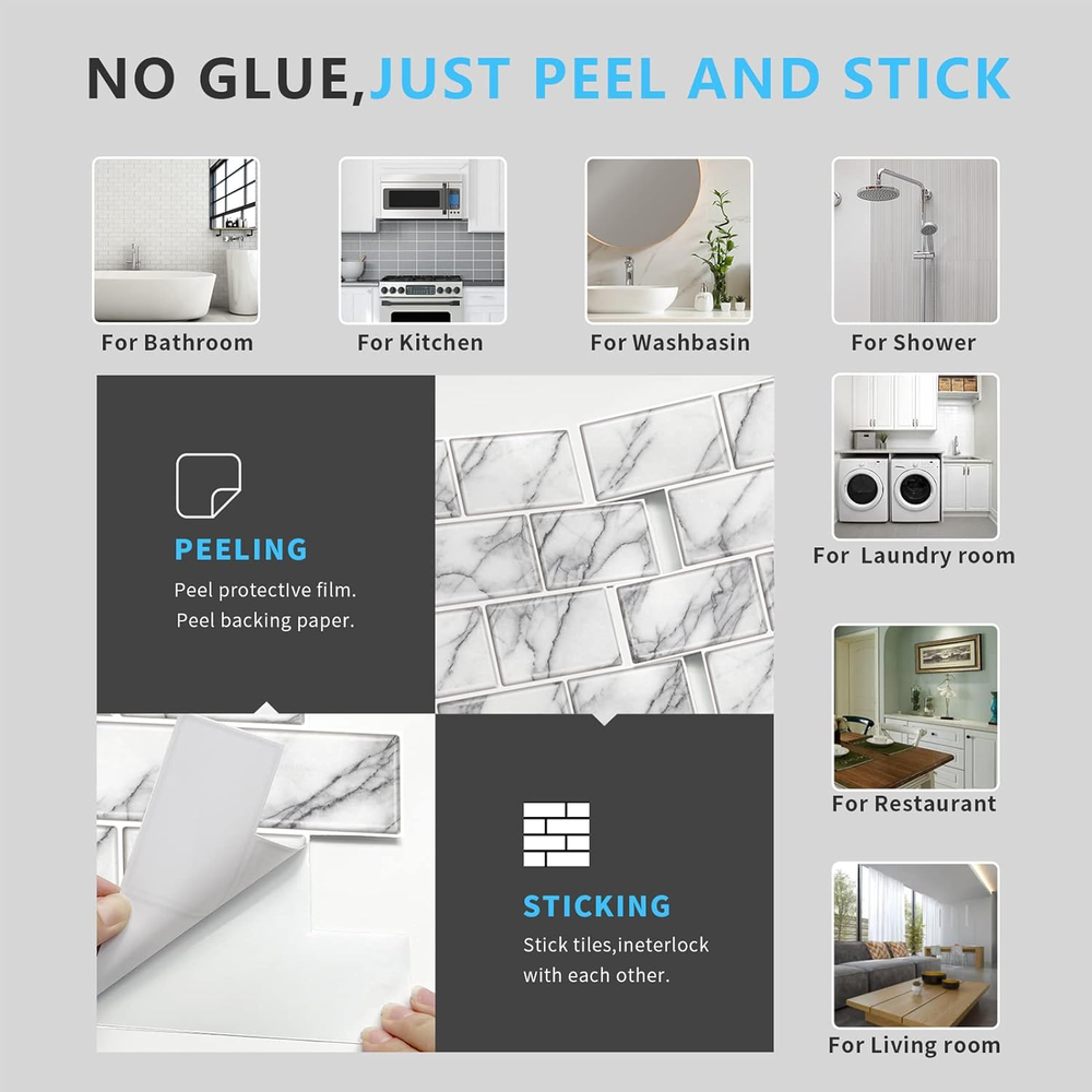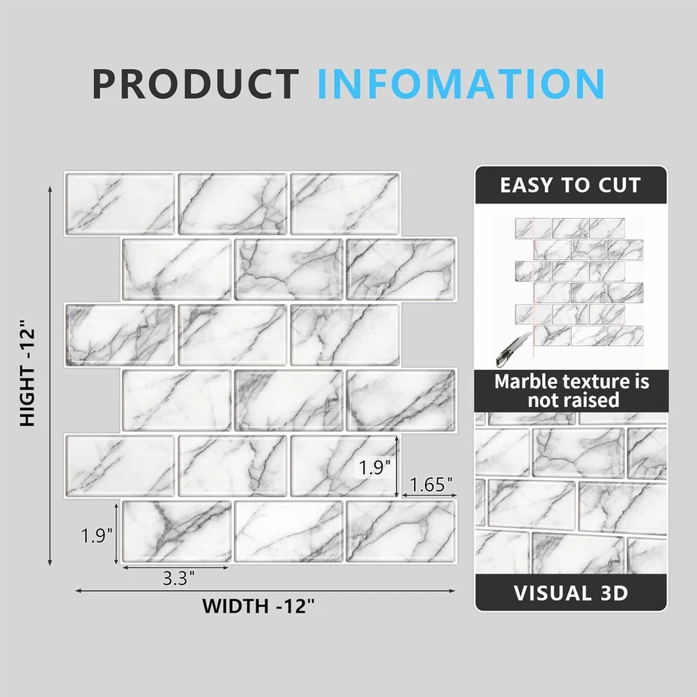 10 SHEETS PACKAGE : The durable tiles are made of eco-friendly material,come in one box of 10 sheets,12"x12" each.Not only cost-effective, but also has high-quality performance. WATERPROOF & HEAT RESISTANT : Resistant to heat of stovetops and humidity of bathrooms.Easy wipe to remove stains, protect the walls from splashes and oil. SUPER STRONG ADHESIVE : Don't worry falling off,not only stick firmly to the smooth and clean surface, but also available on lightly textured wall ! WIDELY USE RANGE : Most people used in kitchen island walls, bathroom backsplashes, shower, laundry rooms,living room etc. EASY DIY : Stick on backsplash tiles for kitchen or bathroom.No special tools and no experience needed, no grout, no glue.Removable ! Product description Make Your House Cleaner Within Budget Odor-free safety material.It is not only cost-effective, but also has high-quality performance, specially designed for kitchen and bathroom backsplash tiles , resistant to heat of stovetops and humidity.Easy to maintain,it can be removed,will not leave and debris. DIY at Will ! No glue,no specially tools. Some Features Waterproof & Heat Resistant Designed for Kitchen and Bathroom: resistant to heat of stovetops and humidity. Super Strong Adhesive Not only stick firmly to the smooth surface, but also available on lightly textured wall. Anti-scratch The patten will not fade and discoloration.