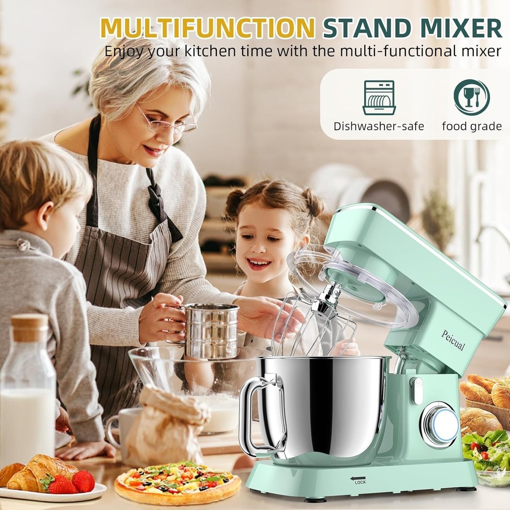 Ultra-Low Noise Design: with 380W high-performance motor, Peicual household stand mixer effortlessly and consistently to whip, beat, knead and mix ingredients thoroughly with low noise ≤75 dB (at Speed 10). This electric mixer minimizes the work noise, avoids disturbing your sleeping family members, and provides a comfortable and efficient baking environment Greater Control Over 10+P Speeds: Peicual electric stand mixer provides you with a superior mixing performance experience. 10 different speed options, make the blending action thorough and fast, easy to the various recipe such as cakes, bread, cookies, salads, muffins, etc. Use the PULSE function to provide precision control when required a quick burst of power or for quickly incorporations One-button Release Tilt-head: Compact design with tilt-head allows the attachments (dough hook, wire whip, flat beater) nicely reach the bottom of the bowl for mixing thoroughly. Adjustable arm lift button solid connecting design with safety switch for keeping the baking mixer stable Anti-slip Feet & Over-heating Protection Features: The specially designed silicone suction cups for more stability while mixing. Release your arm with this effective dough mixer while mixing dense, heavy bread doughs. Equipped with overheating detection function, when you lift the top half of the kitchen stand mixer, which will stop working to ensure your safety during the kneading process Multi-purpose & Easy Clean Accessories: The stainless steel bowl is 6-quart large enough to make various food, from pasta to your favorite cookie, egg whites to pans of birthday cake batter. All accessories are easily detachable and dishwasher-safe. Peicual kitchen mixer with stand provides 24H/7D customer online support
