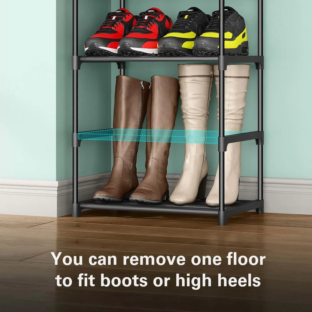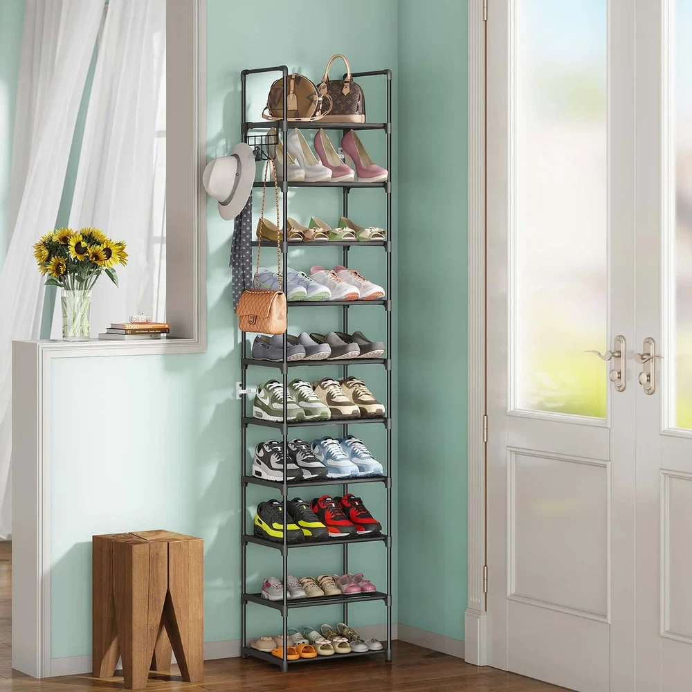 【Keep Your Shoes Neat and Tidy】: The BUG HULL 10-tier stackable shoe rack offers ample storage space for up to 24 pairs of shoes, making it the perfect solution for keeping your room organized and clutter-free. 【Built to Last】: Our shoe organizer is made with high-quality materials, including rust-proof metal tubes and a reinforced frame, ensuring that it remains stable and sturdy even when fully loaded with shoes. 【Fits Any Shoe Style】: Whether you're storing sneakers, boots, or high heels, our shoe rack can accommodate shoes of all sizes, up to US size 12. 【Maximizes Small Spaces】: The compact and narrow design of our shoe rack makes it the perfect solution for small spaces, such as closets, entryways, and apartments. 【Easy to Assemble】: With no tools required, our shoe rack is quick and easy to assemble, allowing you to start organizing your shoes in no time. Versatile Design: Our shoe rack can be used as a free-standing unit or split into two 5-tier racks, making it a versatile storage solution for any space. 【Hassle Free Customer Service】: We are committed to providing our customers with the highest level of service and support. If you encounter any issues with our product, our dedicated after-sales service team will promptly resolve them. Shoes Rack and Organizer 10 Tier Metal Shoes Rack Sturdy Construction Metal Tube Shoe Rack Perfect for 20-24 Pairs Shoes and Boots Convenient Hooks for Extra Storage Adjustable and Removable Shelves Easy To Assemble Easy Cleaning Perfect Size For Narrow Space Vertical Shoe Rack Organizer