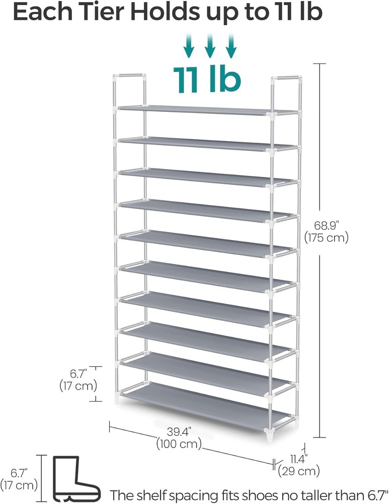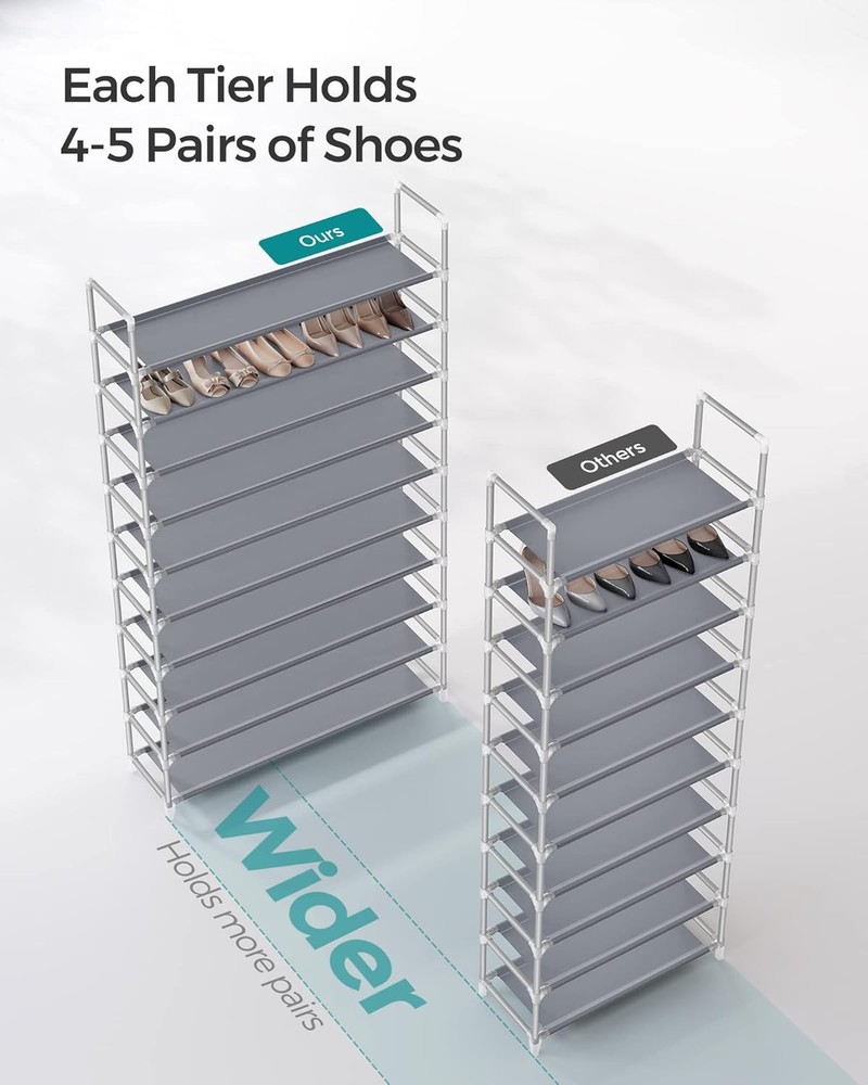 This shoe rack is a game-changer for small spaces! It holds up to 50 pairs without taking up much room, and the sturdy metal frame keeps everything neat. Assembly was a breeze with labeled parts and clear instructions. The non-woven fabric shelves are surprisingly strong, holding everything from flats to boots. Perfect for closets or hallways—highly recommend for anyone needing extra shoe storage!