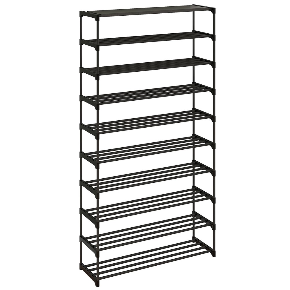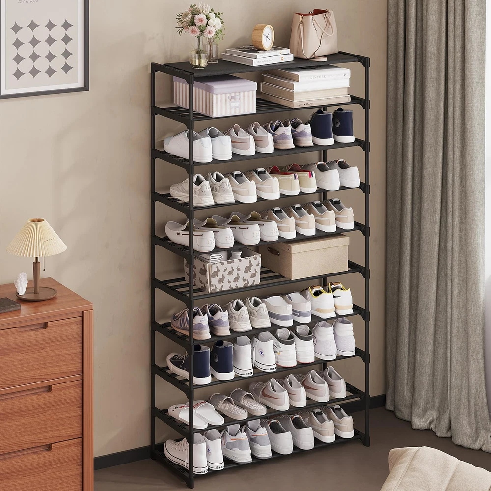 [ Stackable Shoe Rack] 10 tier shoe rack organizer for different spaces of the bedroom, entryway and garage. The shoe rack has a clean and simple design that not only provides ample shoes storage space also decorates your home corner. [Practical & Stable] Each shelf can hold 3 pairs of adult male shoes, or 4 pairs of adult female shoes, or even 5 to 6 pairs of children's shoes. The non-woven top shelf can hold lightweight items such as handbags, umbrellas or dolls. Fully meet the daily needs of a family. [Adjustable Shelf ] The height of each tier of this shoe rack can be adjusted to your personal preference. Metal shoe racks after stacking can disassemble one shelf to provide adequate storage space for taller boots. [High-quality Materials] Equipped with high-quality plastic connectors and a thickened metal frame, this shoe rack is more stable and sturdy than ordinary plastic shoe racks. The metal rods are painted, not easy to oxidize and firm. [Tips for Use] Install the shoes rack in minutes! We are equipped with the corresponding installation instructions, labeled pieces. For a more stable shoe rack, our recommendation is that you follow the principle of heavy weight below and light weight above.