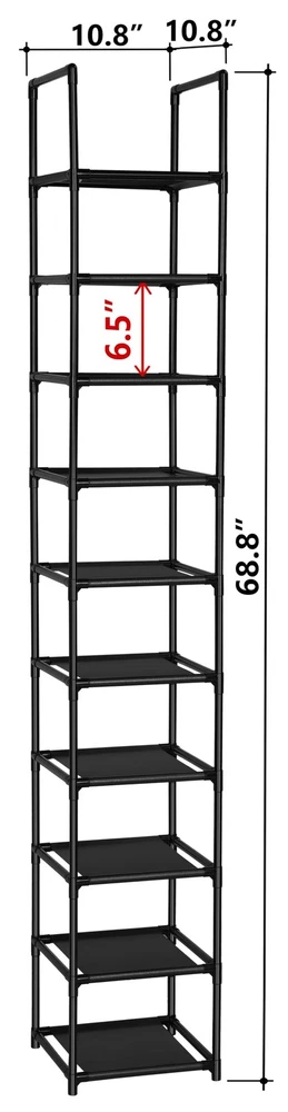 MATERIAL & STRUCTURE: Made from Durable waterproof non-woven fabric tiers , Strengthened plastic connectors and thickened iron pipes. Short design of shelf pipes are hard to bend even put larger & heavy objects, that makes this rack sturdier, stabler and longer lifetime. STORE CAPACITY: 10-tier rack can hold up 10 pairs of adult shoes, each shelf hold 1 pair, much more space saving. You can remove one layer to fit boots, high heels. This rack is not only for shoes, but also for tiny things, such as CD, toys, towel, sundries, books, plants and small accessories. MEASURES: 11 "L x 11"W x 68.8"H, perfectly storage for your closet, entryway, dormitory, apartments, garage, etc. EASY ASSEMBLY: No tools needed, simply assemble the unit by hand with provided parts, quickly and brings you great convenience. You can also separate it into 2 5-tier racks. MATERIAL & STRUCTURE: Made from Durable waterproof non-woven fabric tiers , Strengthened plastic connectors and thickened iron pipes. Short design of shelf pipes are hard to bend even put larger & heavy objects, that makes this rack sturdier, stabler and longer lifetime. STORE CAPACITY: 10-tier rack can hold up 10 pairs of adult shoes, each shelf hold 1 pair, much more space saving. You can remove one layer to fit boots, high heels. This rack is not only for shoes, but also for tiny things, such as CD, toys, towel, sundries, books, plants and small accessories. MEASURES: 11 "L x 11"W x 68.8"H, perfectly storage for your closet, entryway, dormitory, apartments, garage, etc. EASY ASSEMBLY: No tools needed, simply assemble the unit by hand with provided parts, quickly and brings you great convenience. You can also separate it into 2 5-tier racks. LIFE SPAN: more than 2 years, any quality issues and problems of this product, free to change new one, or money back.