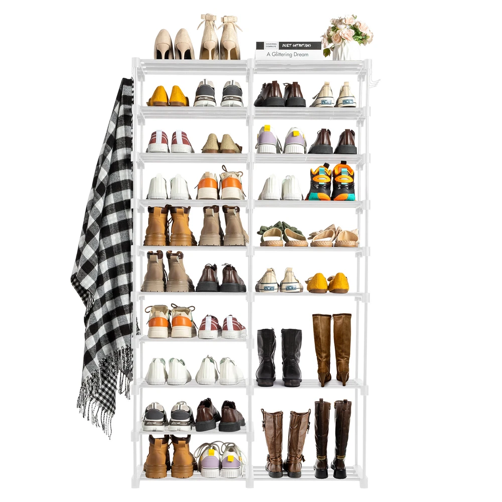 【Product Features】 • Storage and Placement: This shoe rack is designed with a double-row nine-layer structure, providing ample storage space for storing multiple pairs of shoes and boots, keeping the doorway tidy and orderly. • Design with handles: Each layer is equipped with handles, which is convenient for adjusting the position of shoes or taking out shoes, making it more convenient to use. • Non-woven material: Made of environmentally friendly non-woven material, it is soft and durable, effectively protecting shoes from scratches and easy to clean. • Black simple style: The overall black design has a simple and generous appearance and can be easily integrated into various home decoration styles. • Iron pipe frame: The main frame is made of sturdy iron pipes with a stable structure and strong load-bearing capacity, ensuring that it is not easily deformed during-term use. • PP pads: The bottom is equipped with PP pads to prevent scratches on the floor, while increasing stability and reducing noise during movement. [Specifications] • Dimensions: 85.7cm (width) * 29.8cm (depth) * 158cm (height) • Weight: 2.5kg 【Packing information】 • shoe rack*1