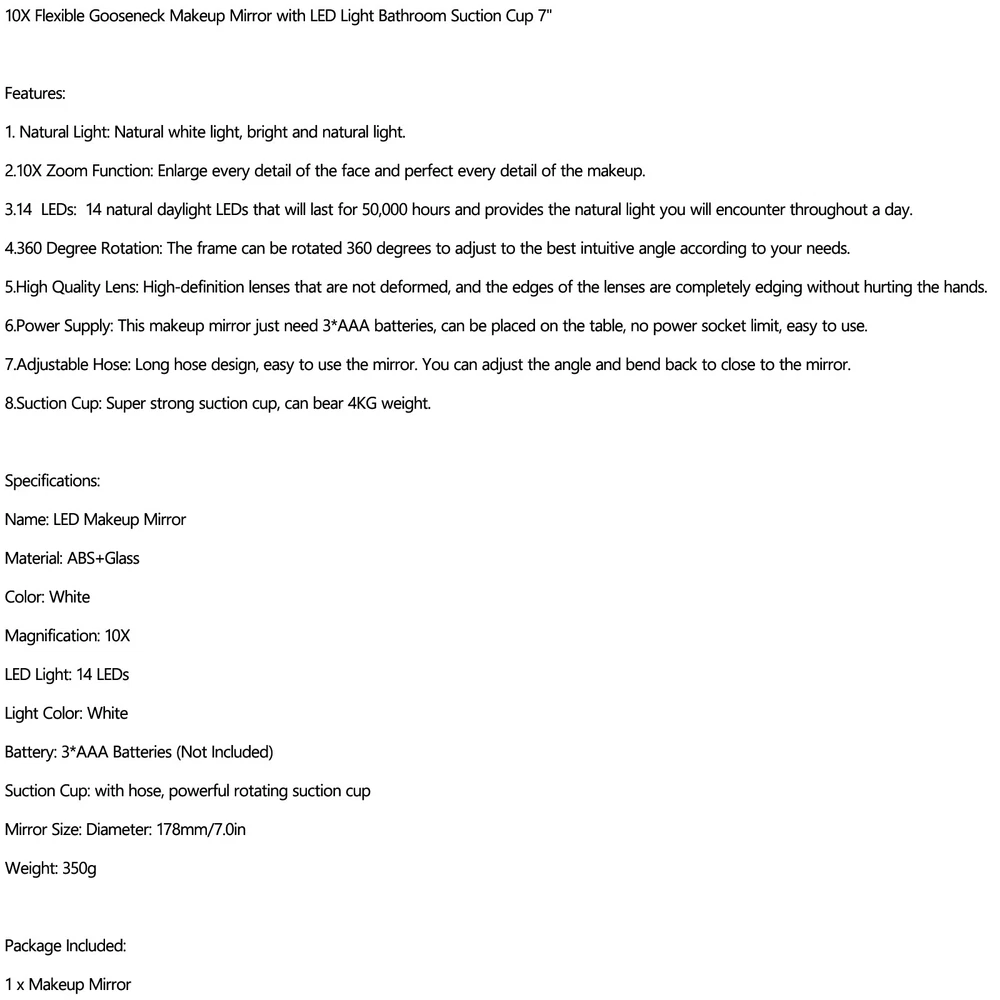 SAFE & SECURE SHOPPING 100% SATISFACTION GUARANTEED FAST SHIPPING Store Categories Store Categories Other eBay Motors Honda Toyota Ford Chevrolet Audi Mercedes-Benz Dodge Jeep You may also like 10X Flexible Gooseneck Makeup Mirror with LED Light Bathroom Suction Cup 7" Product Description 10X Flexible Gooseneck Makeup Mirror with LED Light Bathroom Suction Cup 7" Features: 1. Natural Light: Natural white light, bright and natural light. 2.10X Zoom Function: Enlarge every detail of the face and perfect every detail of the makeup. 3.14 LEDs: 14 natural daylight LEDs that will last for 50,000 hours and provides the natural light you will encounter throughout a day. 4.360 Degree Rotation: The frame can be rotated 360 degrees to adjust to the best intuitive angle according to your needs. 5.High Quality Lens: High-definition lenses that are not deformed, and the edges of the lenses are completely edging without hurting the hands. 6.Power Supply: This makeup mirror just need 3*AAA batteries, can be placed on the table, no power socket limit, easy to use. 7.Adjustable Hose: Long hose design, easy to use the mirror. You can adjust the angle and bend back to close to the mirror. 8.Suction Cup: Super strong suction cup, can bear 4KG weight. Specifications: Name: LED Makeup Mirror Material: ABS+Glass Color: White Magnification: 10X LED Light: 14 LEDs Light Color: White Battery: 3*AAA Batteries (Not Included) Suction Cup: with hose, powerful rotating suction cup Mirror Size: Diameter: 178mm/7.0in Weight: 350g Package Included: 1 x Makeup Mirror About Us Shipping Terms Returns Contact Us About Us VIPIH is one of the international leading distributors specialized in distribution of auto spare parts of the world’s prime auto part suppliers on a global scale with the full responsibility in procurement, shipping, sales and marketing and after sales service. VIPIH simultaneously selling daily necessities, such as Home necessities; Consumer Electronics products; Health & Beauty part and so on, we have almost every category you need, welcome to our store and hope you have a wonderful shopping experience VIPIH fulfills all needs of its clients completely and on a timely basis with the know-how it has built up since it was established and the comprehension knowledge of the sectors standards. The perfectionist approach in product quality, high service availability, strict principle of business follow-up, reliability and the good reputation which has gained strength as a result of customer satisfaction are the most striking components of VIPIH ’ s success. VIPIH is presently capable of supplying all demands for auto parts from the gear box to turbo hoses in a wide range. Free delivery with worldwide shipping options available. If can not locate what you need then please get in touch! Shipping United States Buyers Parcel will via USPS or UPS from us United States warehouse Shipping Time Usually , orders will take 3 days to handle and Parcel will be delivered 2-10 working day. Sometimes shiping time may has a little delay, such as Bad wether,Holidays Terms We stand behind everything that we sell and will do everything possible to assure you are satisfied. When you receive your purchase if you are not 100% satisfied, please sent me ebay message and we will do our best to make you happy. If you still want to return your purchase, simply ship the item(s) back to us and we will refund your original purchase price and the original shipping charge. Buyers are responsible for the postal cost of returning the items. We must be notified of the intent to return your item within 30 days of receiving the item. Items returned must be in the same condition that they were received. How to return 1,Please ask us for return address . 2,Shipping back the package . The RMA#(Return Merchant Authorization Number = Your ebay ID) must be clearly written on the return package ,Otherwise the package will be refused. 3,Sent us the return tracking number. 4,All returns will be inspected prior to a credit being issued. Returns 1:Returns are accepted within 60 days of purchase. 2:All returned items MUST BE in the original packaging. 3:We will be happy to assist you if if any item needs to be returned or replaced 4:Please don't open a return request before contacting us first to solve, many thanks. Contact Us If you have any questions, our Customer Service staffs welcome you to sent me ebay message. We strive to answer all questions and resolve any problems as quickly as possible. Business Hours: Monday-Saturday 9:00-17:00 Copyright © 2022 Tongtool