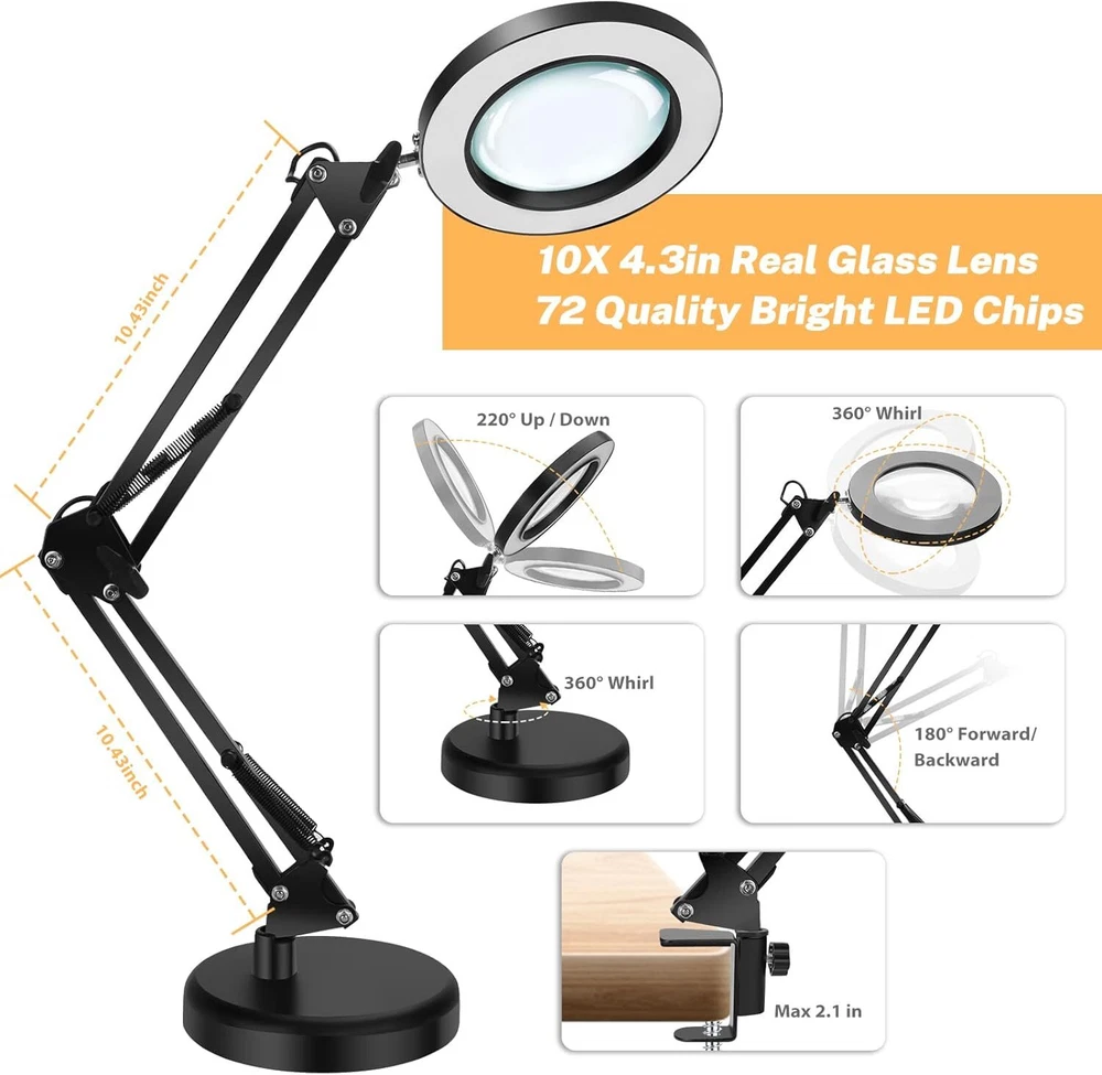 10X Magnifying Glass with Light and Stand, 2 in 1 black stand clamp Product Details Finish Type: Matte Base Material: Iron Bulb Base: Wedge Product Dimensions: 11.02"D x 3.23"W x 11.02"H Item Weight: 3.9 Pounds Lamp Type: Desk Lamp Shade Color: black Style: Modern Brand: YECERCAN Color: black with stand and clamp Special Feature: Dimmable, Adjustable Arm Light Source Type: LED Material: Glass, Iron Room Type: Bed, Table, Desk, Workbench Number of Light Sources: 1 Included Components: Clamp, 10X Magnifying glass, Base Number of Items: 1 Lighting Method: LED Indoor/Outdoor Usage: Indoor Is Cordless?: No Manufacturer: YECERCAN Part Number: 10Xblack01 Item Weight: 3.9 pounds Country of Origin: China Item model number: 10X Finish types: Matte Special Features: Dimmable, Adjustable Arm Batteries Included?: No Batteries Required?: No Product Dimensions : 11.02 x 3.23 x 11.02 inches; 3.9 Pounds Item model number : 10X Manufacturer : YECERCAN Country of Origin : China Finish Type: Matte Base Material: Iron Bulb Base: Wedge Product Dimensions: 11.02"D x 3.23"W x 11.02"H Item Weight: 3.9 Pounds 2-in-1 Standing Magnifying Glass with Light: We provide 2 kinds of base for your convenience:1,Heavy duty weighted base, so you can use it as desk lamp; 2,Metal clamp, so you can clip the magnifying light to a workbench,shelf, desktop,or anywhere is flat within 2.1”thickness to free your hands. 10X HD Magnification: The lighted magnifying glass lens is made of real glass, provides you a clear view without optical distortion. 10x magnification makes the detail works more easier, like soldering, cross stitch, electronics repairs, hobby observation, book reading for elderly. 3 Color Modes & 10 Brightness Levels: Equipped with 72pcs bright LED lamp head, the Led magnifying lamp provides uniformly illuminate, no flicker, no glare to protect your eyes. And there are 3 color modes(White, Warm, Cool) and 10 brightness levels(10%-100%)for your to choose based on your needs. 360°Flexible Adjustment: Our magnifier with light and stand has 2 metal swivel arms, the long arms which can be extended to 20”,they can be adjusted to any angle view you need, and the light head can be turned 360°to meet your needs. 100% Satisfaction: YECERCAN lighted magnifying glass with stand is a perfect gift on father's day for elderly,people with low vision or those who needs to do the close works/ hobbies constantly, tool free to assembly and easy to use, brings light to your life.