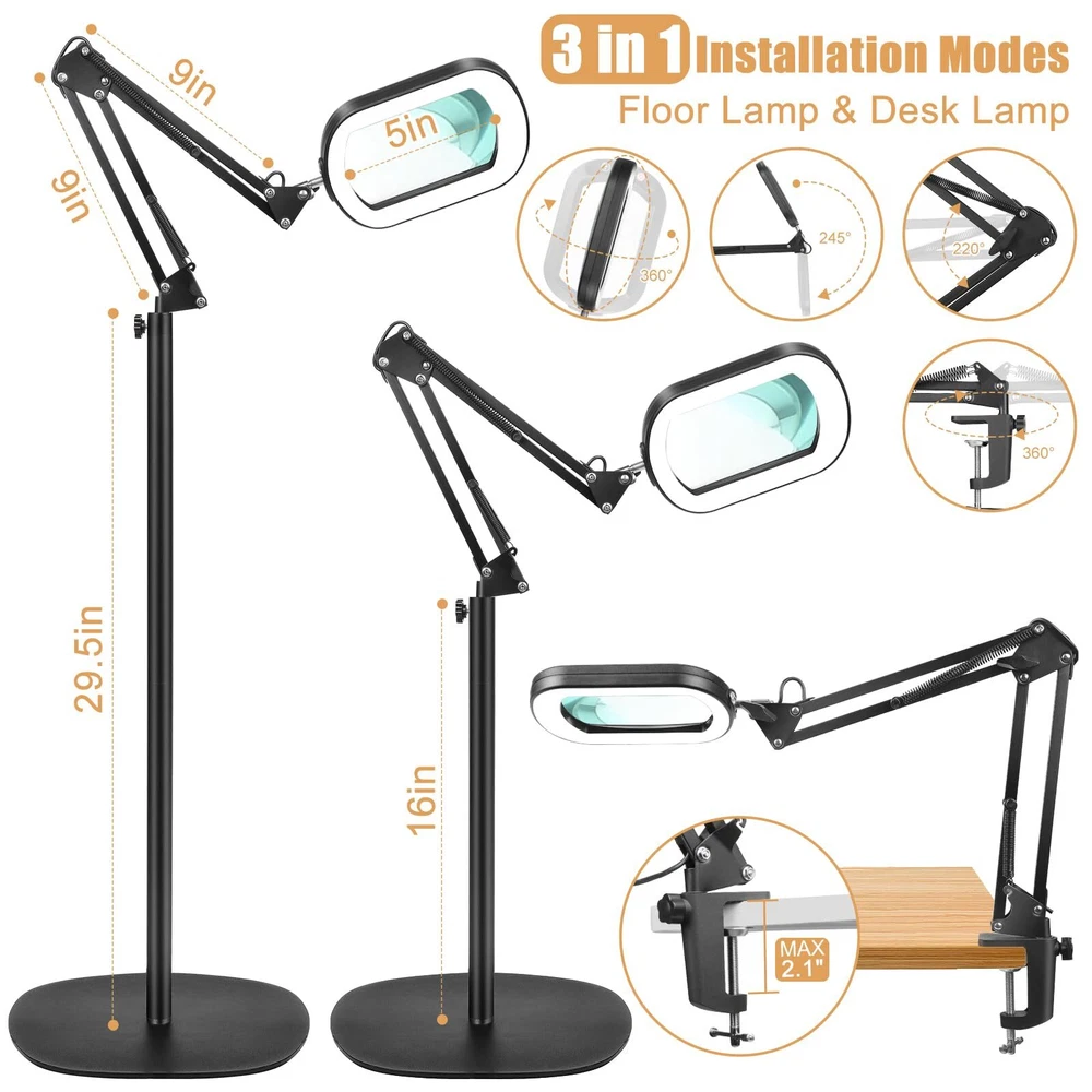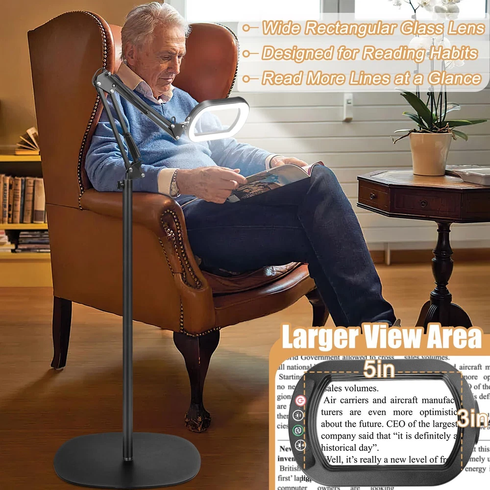 3-in-1 Magnifying Floor Lamp & Clip-On Desk Lamp: This magnifying lamp features a heavy-duty metal base, a metal clamp, detachable rods, and a swing arm magnifier. You can adjust the height by combining the rods or convert it into a clip-on desk lamp by attaching it to tables or desktops, freeing up your hands and ensuring comfortable use in any workspace. Whether you're working on intricate tasks or just need hands-free lighting, this floor magnifying lamp adapts to your needs. 5-Inch 10X Rectangular Real Glass Lens: The large rectangular lens provides a wider viewing area, perfect for reading or detailed tasks. The high-definition, distortion-free glass lens eliminates dizziness and eye strain, giving you clear 10x magnification that’s gentle on your eyes even after extended use. This feature is especially beneficial for seniors, hobbyists, and professionals who require a clear and unobstructed view of their work, making every task more comfortable and efficient. 5 Color Modes & 10 Brightness Levels: Customise your lighting with 5 different color temperatures and 10 brightness options. The memory function remembers your last setting, so it’s ready just the way you like it every time. This versatility makes it perfect for crafts, esthetician, aesthetic, , hobby, puzzles, needlework, embroidery, and other close work. Whether you need a bright white light for focus-intensive tasks or a softer, warmer light for relaxed reading, this floor lamp covers all bases. Head Button Design for Easy Light Adjustment: The button is conveniently located on the lamp head, so you can adjust the light settings without searching for a switch, making it effortless to use. This user-friendly feature is especially useful for reading books, sewing, painting, cross stitching, crafting, knitting, drafting, etc. Flexible and Stable Adjustable Arm: The magnifying floor lamp’s adjustable arm allows for easy positioning at various angles, and it stays firmly in place once adjusted. Whether you’re working on detailed tasks or need to direct light at a specific area, this magnifying light provides a stable, hands-free experience. The durable and adjustable design ensures that the lamp stays in the desired position without drooping, giving you the confidence that your workspace will always be well-lit and your hands free to focus on what matters.