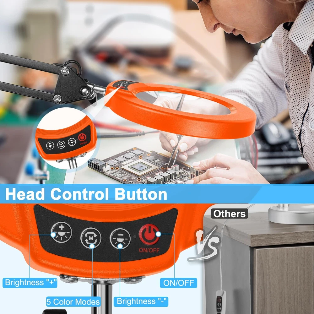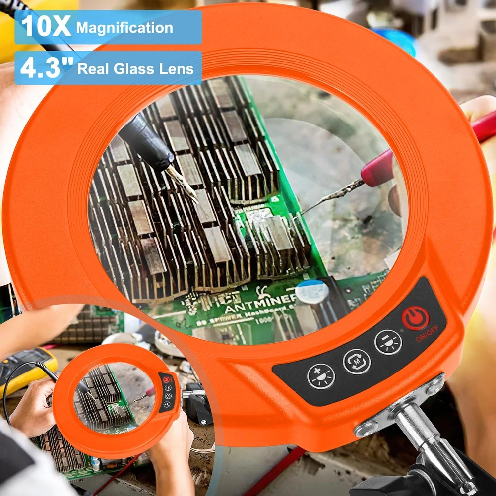 Multifunctional desk lamp with magnifying glass and light Free your hands, Eye protection and energy saving Craft magnifying glass with light hands free is designed with a 4.3" real glass lens for a clearer view. 2-in-1 desk lamp & clamp light design meets more usage needs. It's great for people who need to work continuously at close range or who need visual aids. 10X magnifying work light & Real Glass Lens High-Quality 4.3" real glass lens can provide you clear, undistorted, and realistic visual effects. There is no dizziness even if use it for a long time. 72Pcs LED Beads Light with magnifying glass adopts a ring design with 72pcs built-in super brightness LED provides you with an even, soft light and a large area of illumination. Without glare and flicker. 2-in-1 Desk Lamps & Clamp Light Led magnifying lamp come with a weighted base and clamp, You can easily switch to a desktop standing magnifier or clip light without any tools. Memory Function Desktop magnifying glass with light has memory function, your lighting preferences are conveniently stored, ensuring a consistent and personalized lighting experience every time you use it. Give the best gifts to the seniors We have launched a unique desk light with magnifying glass: it can be applied to welding, crafts, reading, miniature painting, read, sewing, hobbies, mini tasks, jewelry, soldering, beading, fly tying, etc. The lighted magnifier with stand will be your best choice. Specifications: Lens Material: Real Glass Type: Base and Clamp Switch Mode: Button Switch Package Includes: 1 * Magnifying Lamp 1 * Metal Clamp 1 * Desktop Base 1 * Adapter 1 * User manual 【10X Magnification & Real Glass Magnifier】Magnifying glass with light features a 4.3" real glass lens that provides a clear and distortion free view. The 10X magnifying lamp is especially suitable for crafts, reading, miniature painting, sewing, cross stitch, mini tasks, diamond painting, puzzle, jewelry, hobbies, manicure, soldering, repair, nails tech, needlework, beading, fly tying, needlepoint, drawing, book, knitting, solder, etc. Our magnifier with light is designed to meet your needs. 【Upgraded 2-in-1 Desk Lamp & Clamp Light】Magnifying light for crafts hands free come with a weighted base and clamp. You can use the base as a table lamp, which is heavy enough to support a magnifying lamp with light. It also comes with a metal clip that easily attach them to flat surfaces up to 2.1 inches thick, more firm and stable mounted to the desktop, tabletop or workbench. Handsfree lighted magnifying glass with stand to free your hands can point glass and light to the location you need. 【Upgraded Head Button】The desk magnifying glass with light features an upgraded head button to experience hassle-free operation. Unlike other magnifying desk lamps with switches on the power cord, our head button allows for easy and intuitive control. And adjustable swing arm allows you to choose the angle you want. The magnifying glasses with light for close work make it easier to operate the buttons to adjust the 5 color modes and stepless dimming brightness. 【5 Color Modes & Stepless Dimmable】Magnifier with light and stand offers 5 color modes and 10 dimmable brightness to suit your needs. High-Quality ring LED lights provide you with even, flicker-free light, giving you a clearer view and reducing eye fatigue caused by prolonged observation. The table magnifying glass with light has a memory function can keep the mode and brightness last used.