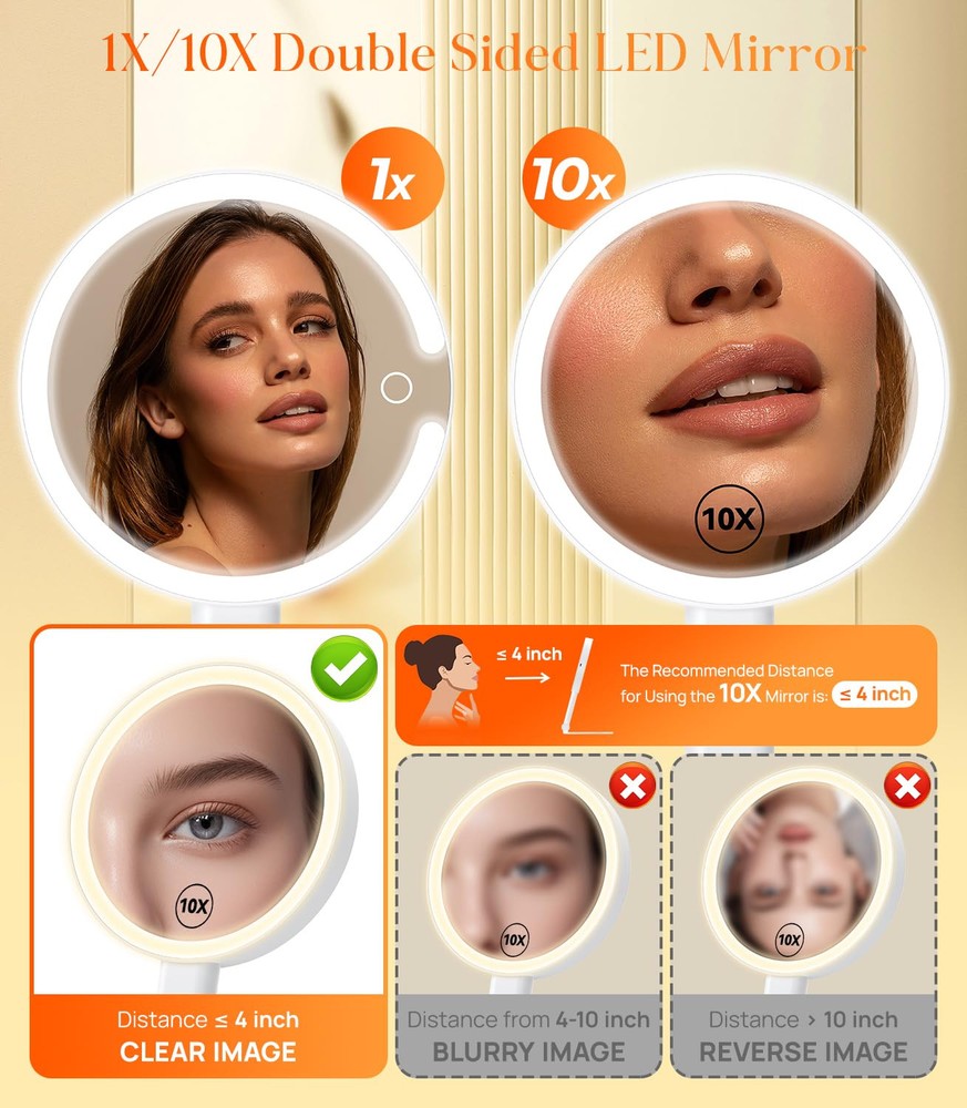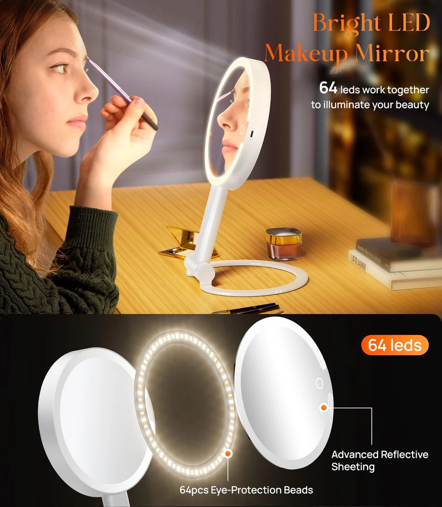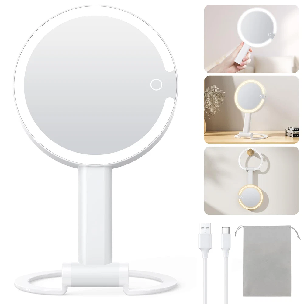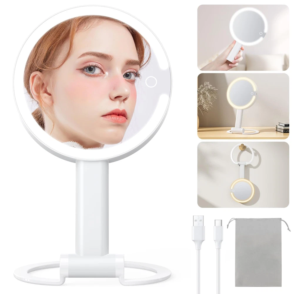 【VERSATILE 3-IN-1 MAKEUP MIRROR】Boasts a flexible foldable handle, this multifunctional lighted hand held mirror offers handheld, tabletop, and hanging options for convenient use at home or on the go 【HD 1X/10X MAGNIFYING 2-SIDES MIRROR】One side of the mirror offers a standard 1x reflection, while the other side provides a 10x magnified view. The 1x mirror is perfect for general makeup application, while the lighted magnifying mirror allows for precise focus on facial details to help achieve flawless results 【3 COLOR MODES & STEPLESS DIMMING】This light up mirror features 3 different light color options: warm, natural, and white. You can easily customize the lighting to suit any environment or occasion. The brightness of the ring light mirror is adjustable to meet your specific preferences. Additionally, it includes a smart memory function that stores the brightness level from your last use, ensuring convenience for your next use and eliminating the need for frequent adjustments 【2000MAH BATTERY & 30 MINS AUTO TURN OFF】Equipped with a built-in 2000mAh rechargeable battery, this mirror can be used continuously for 3-12 hours when fully charged. The convenient type-C rechargeable design frees you from the hassle of battery replacement. To save energy, the lights will automatically turn off after 30 minutes of inactivity. (Charger not included) 【LIGHTWEIGHT & PORTABLE TRAVEL COMPANION】This travel mirror with light weighs just 1.03 pound and includes a detachable base and a velvet storage bag. Whether you're on the go, at a party, or traveling for business, this versatile mirror is the ideal choice for you 【BEST GIFT & 100% SATISFACTION GUARANTEE】This beautiful mirror makes a wonderful gift for Christmas, Birthdays, Anniversaries, Mother's Day and Valentine's Day. Our customer service team is always available to assist you with any issues you may have with your cosmetic mirror. Please feel free to reach out to us at any time and we will get back to you within 12 hours