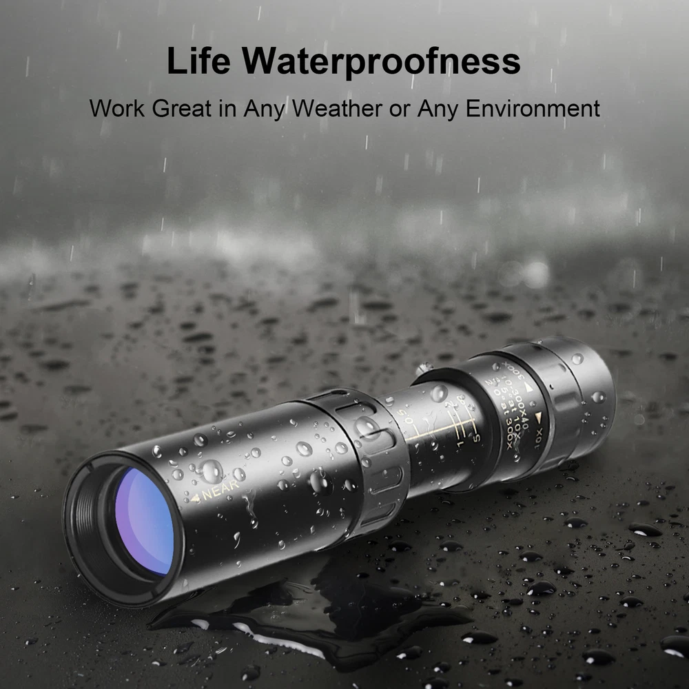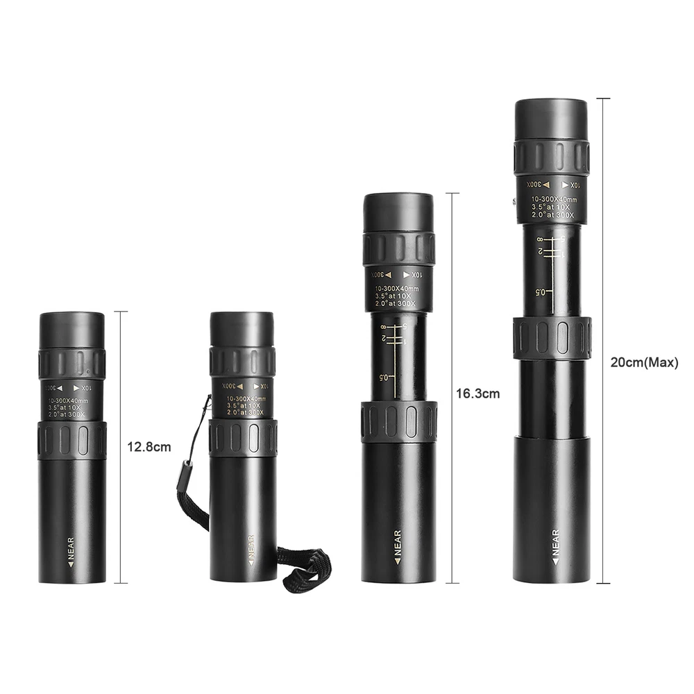 Features: 10X-300X Zoom: this 10X to 300X high power magnification monocular telescope, provides you a better and clear observation. Quality Lens & Prisms: BAK4 prism, FMC lens are used, which ensures superior light transmission and brightness. Easy Usage: monoculars is available to connect tripod and smartphone(both not included) for shooting, convenient adjustable in zooming by hand wheel, to see a target. Well-built Monoculars: ultra-compact lightweight monoculars, with zinc alloy housing, features rugged construction and daily water-resistance. Wide Application: it is suitable for bird watching, ball games, concerts, watching wildlife and scenery, etc. to see this wonderful world. Specifications: Material: Metal + Rubber Color: Black Magnification: 10X-300X Eye Lens Diameter: 12mm Objective Lens Diameter: 25mm Field of View: 4.4/2.1 View Angle: 2.0°-3.5° Exit Pupil Distance: 40mm Item Size: 12.8*4*4cm / 5.03*1.57*1.57in Package Weight: 153g / 5.39oz Package Size: 13.7*5.7*5.5cm / 5.39*2.24*2.16in Note: Monocular telescope set only, other accessories in the pictures are not included. Due to manual measurement, there may be deviation, please in kind prevail. Due to lighting or other reasons, the picture and material object may slightly differ. Packing List: D9959 1 * Monocular Telescope 1 * Carrying Bag 1 * Hand Strap 1 * Cleaning Cloth Hello,welcome to the store,what can I help you?