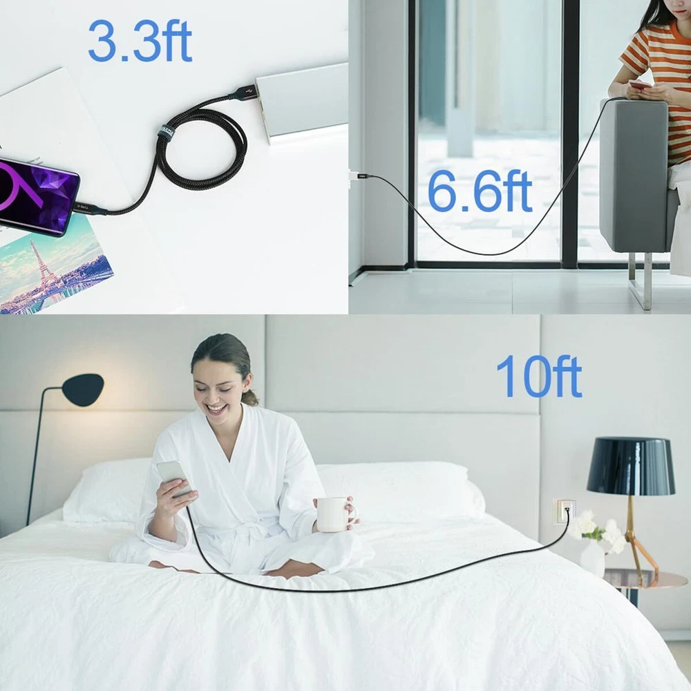 USB Type C Cable, 3-Pack (10ft+6.6ft+3.3ft) USB A to USB-C 3.1A Fast Charger Nylon Braided Cord Compatible with Galaxy Note 9 8 S8 S9 S10 10 Plus,LG V50 V40 G8 G7 Thinq,Moto Z Z3,Swi,Black AkoaDa Super Fast Charging and Data Transmitting Durable Data Cable High Speed Backup Charging Use any phone charger, portable charger or multi-port USB charger to charge your new MacBook, ChromeBook Pixel,or other USB-C devices via this cable. Smart Design The reversible design of the USB C connector helps you insert the cable in a right way all the time. Premium Nylon Braided Fiber Durable Design: The Stylish & Tangle Free Design, which is easy to storage and durable for use. Features Tough yet Flexible Nylon Braided Jacket, Gold Aluminum Connectors. Compatible Devices Include: (Partial List) Samsung Galaxy S8, Samsung Galaxy S8 Plus LG V20 LG G5 LG G6 Google Nexus 5X ,Nexus 6P Google Pixel XL,Pixel Google ChromeBook Pixel (2015) USB C Cable 3.1A Fast Charging : The USB C cable Supports safe high-speed charging (3.1A) and fast data transfer (480Mbps).The type c charger cable conforming to the USB Type C Specification version 1.1, 56kilohm. USB C CABLE Reversible Connector: The USB C cable usb c charger keeps up with the latest trend of USB interface. This type c charger cable user-friendly design. High Quality USB C Charging Cable : USB C charger cable encased with Triple-Braided Nylon fiber, type c charger cable make it have excellent anti-twisting.High quality double woven nylon C-type cables have a longer service life and never break. Certified Safety & High Quality Assurance : This USB-C cable has electronic safety certifications that comply with appropriate standards, you have no need to worry about this cable quality at all. Upgraded 3D aluminum connector and exclusive laser welding technology, which can ensure the metal part won't break. Wide Compatibility : We provide this 3-Pack Nylon Braided USB Type-C Cable . This type c charger Cable can fast charge and sync well compatible with iPhone 15/15 Plus/15 Pro/15 Pro Max, Samsung Galaxy S20/S20+ Ultra S10 S10E S9 S8 Note 20 10 9 8,Moto Z/Z2, LG G5/G6/V20/V30 and other USB-C devices. Shipping from the USA All of our products are shipped from the USA, ensuring quick delivery to your destination. Payment We offer the following payment methods: PayPal, credit card, bank transfer, and eBay's secure payment system. Free Shipping & Free Returns Shipping within the USA is FREE. Additionally, any return is absolutely free for you. Risk-Free Purchase You have the option to return an item within 30 days without any justification. We cover the return shipping costs! Fast Shipping We ship immediately upon receipt of payment. Generally, the package is delivered within 2-3 days in the USA. If it takes longer, we will contact you. Quality and Costs Made in Europe, USA, China No customs fees or additional charges Total satisfaction guarantee Invoice with declared VAT available upon request in .pdf format Feedback Your feedback is very important to us. After you pay for your purchase, you will automatically receive positive feedback from us.