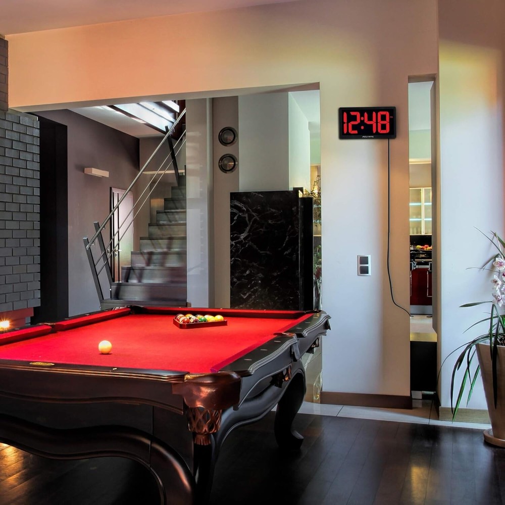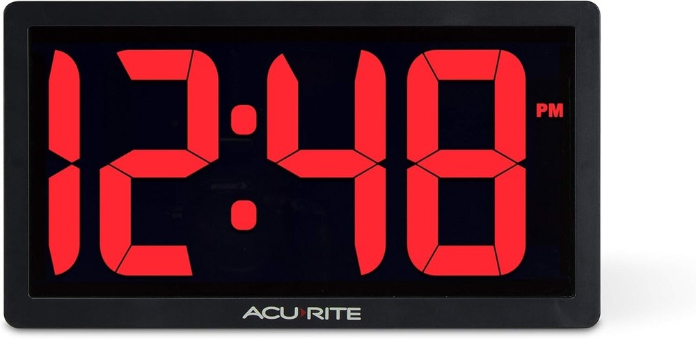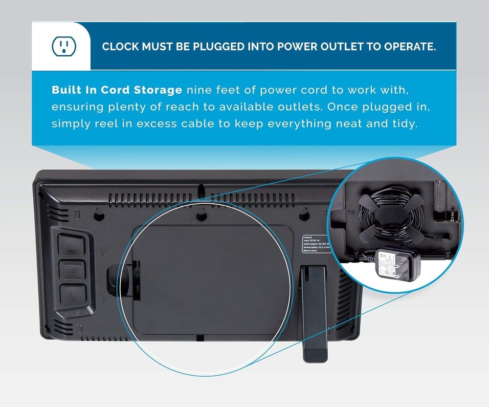 75099M 10-inch LED Digital Clock with Auto Dimming Brightness Red Six different lightning settings includng auto-dim mode Oversized tall digits allow for easy-viewing from across the office, classroom, or living room Easy to mount as a digital wall clock using the integrated keyholes, or use the fold-out stand for desk placement Powered by 9-foot power adapter (REQUIRED) with integrated cord storage Battery operated back up keeps the time in the event of a power outage The 10-inch LED digital clock is the perfect addition to any home, office or classroom. Its large numbers make viewing from across the room simple so that you always know the time. The clock also features 6 different lighting options including an Auto-dim mode so that the Clocks bright lights don't keep you up at night. It is powered by a 9-foot power adapter and features cord storage to secure excess cord. Integrated keyholes for easy wall-mounting and sits upright for tabletop use with its fold-out stand.