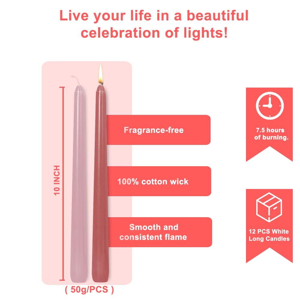 These pink taper candles are absolutely stunning! The color is vibrant, and they burn beautifully for hours without smoke or scent. Perfect for adding a romantic touch to dinners, weddings, or any special occasion. The set of four is a great value, and the long burn time makes them ideal for extended use. Love how they create a cozy, elegant atmosphere!