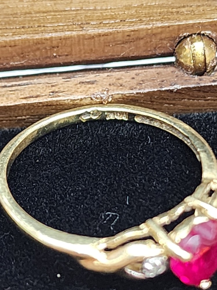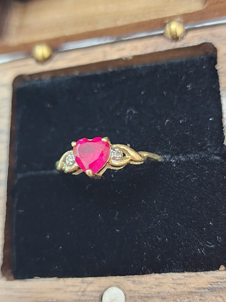 This 10k Yellow Gold Ring features a Ruby heart as the main stone with a prong setting and two diamond accents. The ring is vintage and has excellent cut grade, making it a stunning piece of fine jewelry. The combination of the red ruby and yellow gold create a vibrant and eye-catching design, perfect for any occasion. Total weight: 1.53 grams