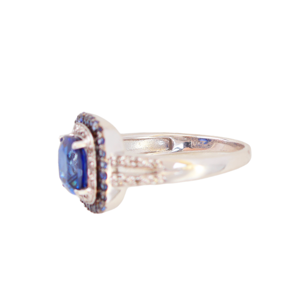 Beautiful 10k white gold ring featuring a stunning cushion-cut blue sapphire as the center stone, framed by an elegant double halo design. One halo sparkles with diamonds and delicate white gold beading, while the outer halo is accented with rich blue sapphires for added depth and contrast. The band has a graceful split-shoulder style adorned with diamond and beaded details for a refined finish. This piece has been professionally tested and certified as 10k gold, and the inside of the band is marked "10KT - FD". Measurements Ring size: apx. 7.5 Band width: apx. 1.6mm Main sapphire: apx. 7mm x 7mm Diamond weight: apx. 0.10 ct tw Total weight: apx. 3.53 grams Why Buyers Love This Style Cushion-cut sapphire centerpiece with vibrant deep blue color Double halo design adds brilliance and luxury presence Diamond accents and beaded detailing create a high-end look Perfect statement ring for special occasions or September birthstone wear 10k white gold sapphire ring cushion cut blue sapphire halo ring diamond accent ring double halo sapphire ring September birthstone jewelry beaded white gold ring split shoulder statement ring fine gemstone ring Item #2167