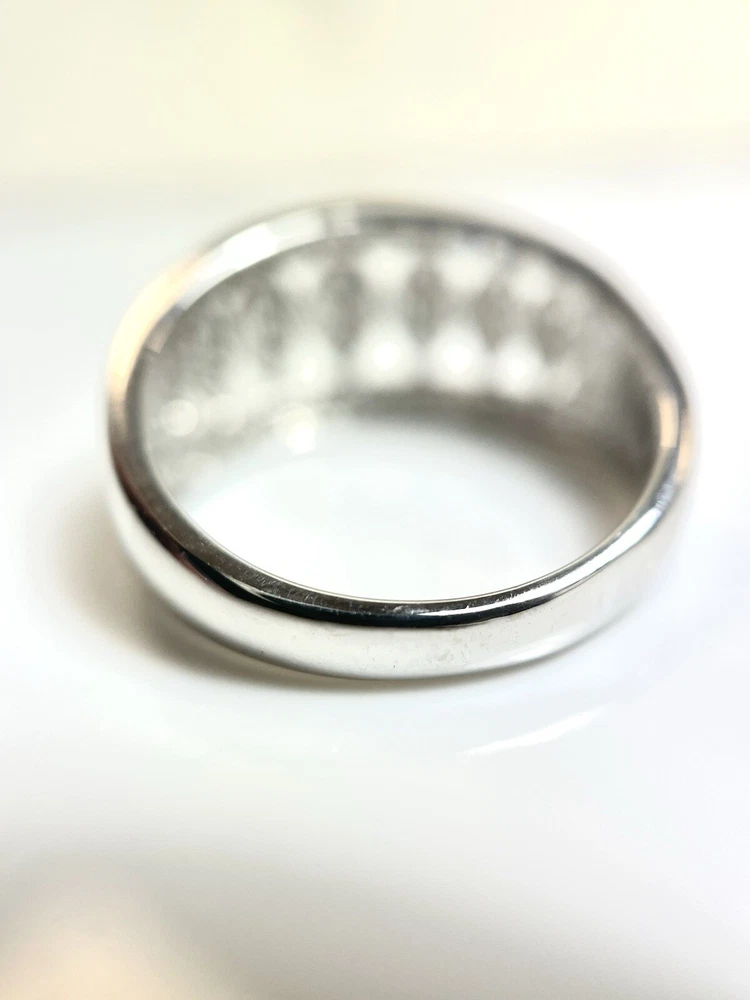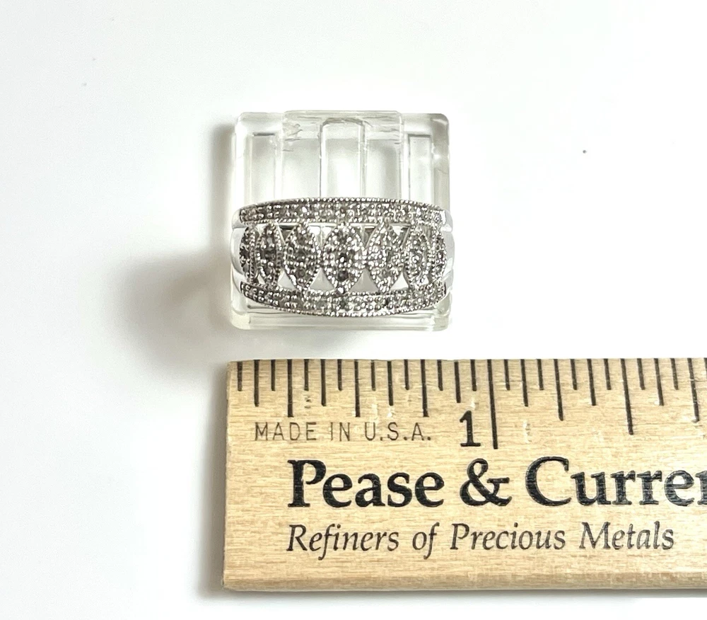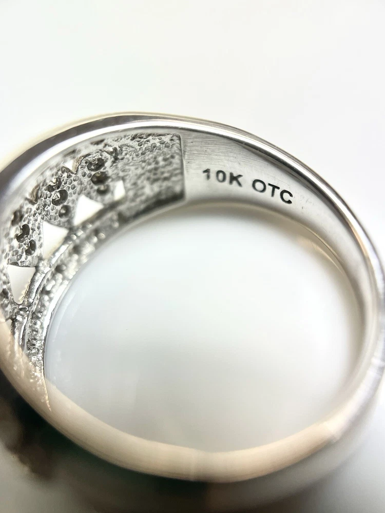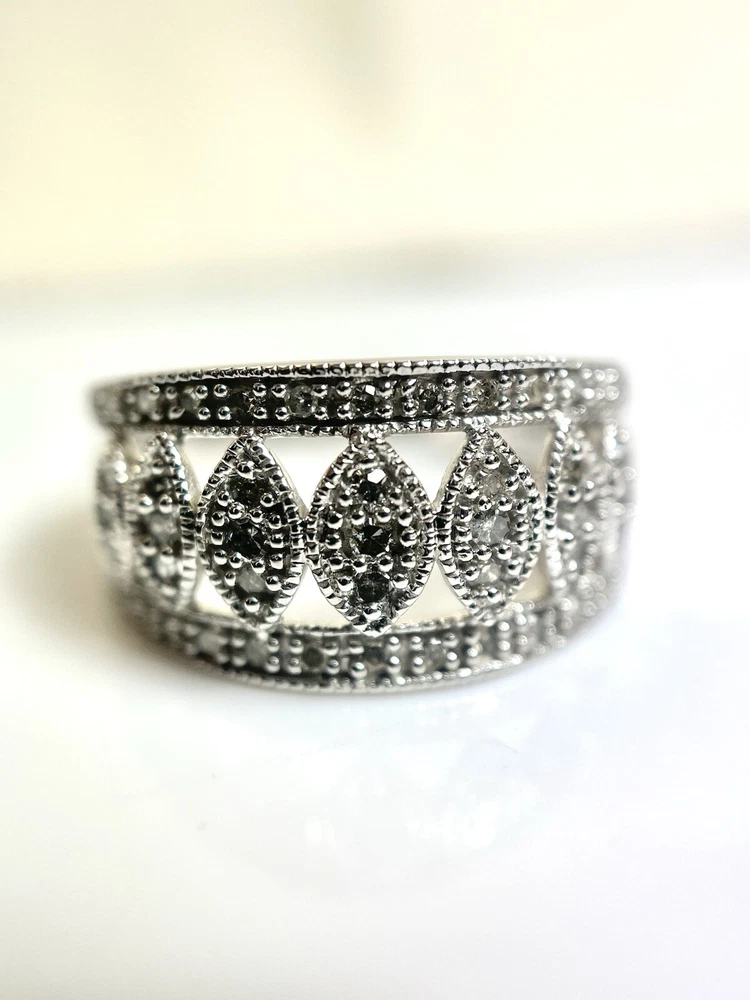 This stunning 10kt white gold ring is adorned with 43 sparkling natural diamonds, totaling .40ct in weight. The round diamonds are bead-set in a beautiful design, perfect for any occasion, whether it be a special event like a wedding or anniversary, or even just to show someone you care on Mother's Day. The ring is a size 7 and has a band width of 10.5. The diamonds in this ring have a J color grade and an included (I2) clarity grade. The main stone is white/near colorless and has a natural creation. This ring is made of 10k white gold, with a metal purity of .400. It is a perfect addition to any fine jewelry collection and is sure to make a statement. Ring weighs 4.2 grams.