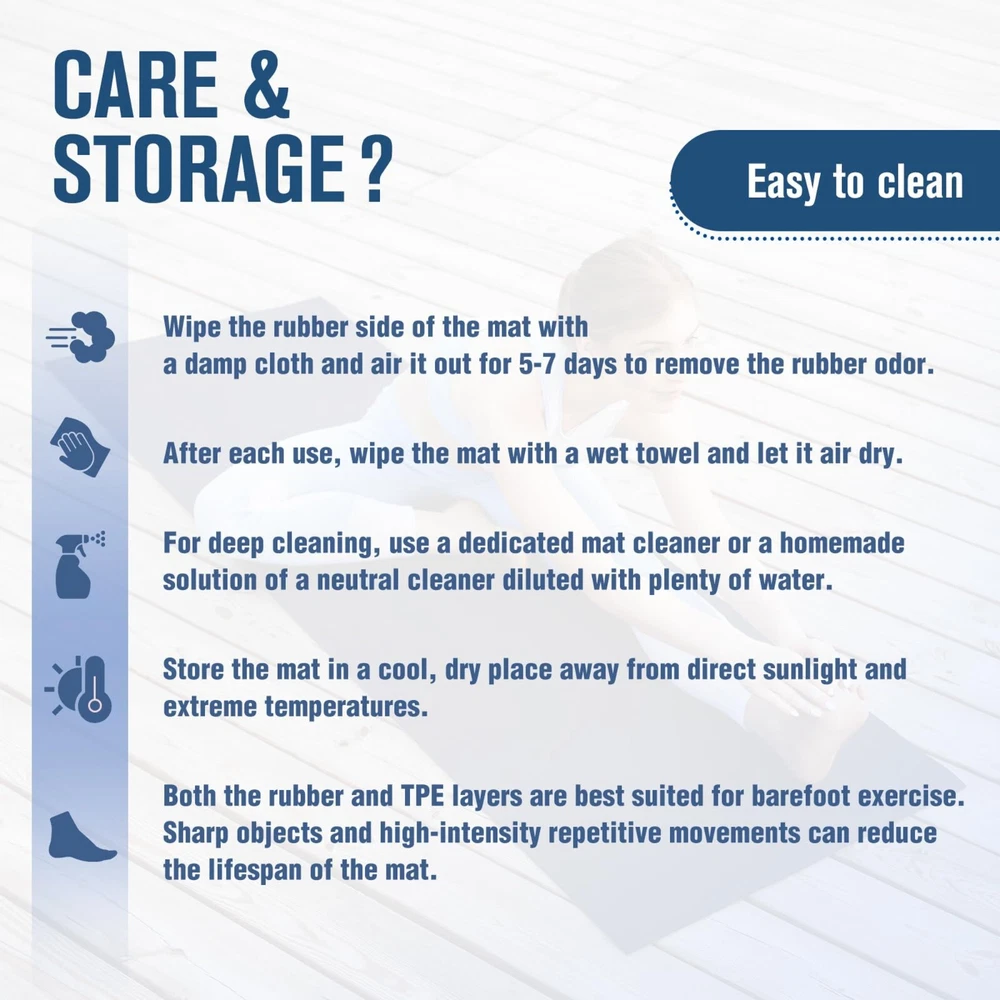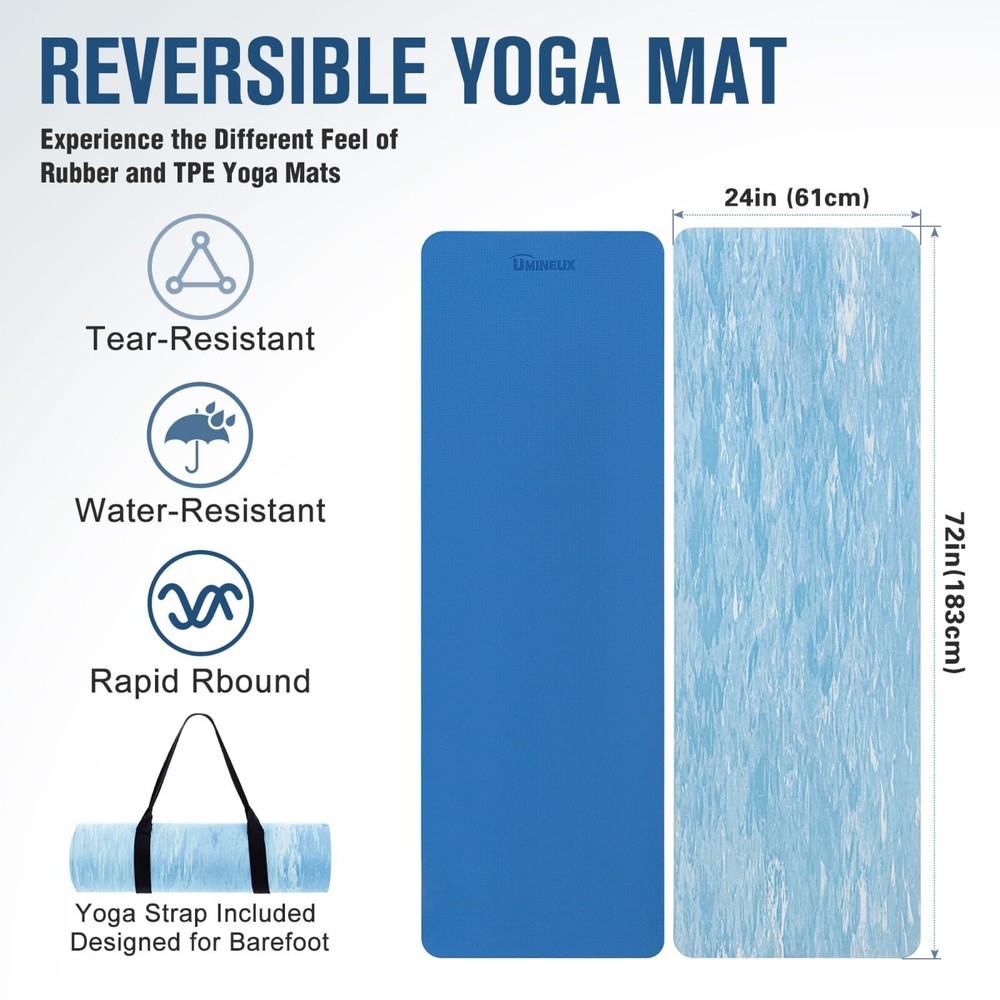 Features: Eco-friendly, Extra thick, Non-Slip Department: Unisex Adults Care Instructions: Hand wash only, Wipe clean with damp cloth, unroll, and air dry, Store out of direct sunlight, Designed for barefoot exercise, Your shoes or your pets' paws may tear the mat Material: Rubber, TPE Sport/Activity: Yoga Country/Region of Manufacture: United States Brand: UMINEUX Type: Yoga Mat Item Weight: 5.44 lb Product Dimensions LxWxH: 24.00 x 5.50 x 5.50 Inches Color: Blue