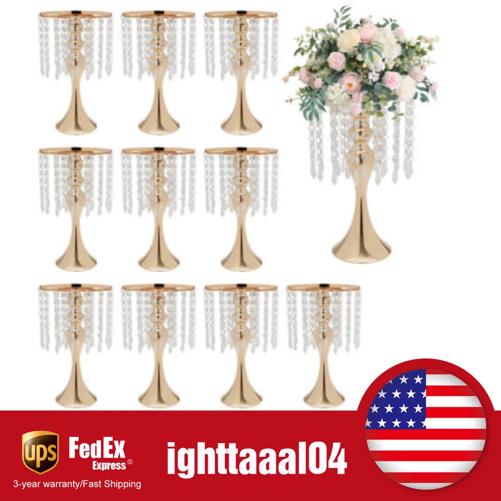 Description Embellished with glass beads, this piece will complement your flowers and add a luxurious and elegant atmosphere to your party or wedding venue. It is also hand-beaded to provide you with better quality. The tall and beautiful piece will leave a lasting impression on your guests. Key Features Atmosphere Maker: Shiny glass beads with beautiful flowers can create a romantic and gorgeous atmosphere for your party scene. It will add a beautiful glow to your tabletop and impress your guests. High-quality Material: This product is made of high-quality iron, acrylic, and glass beads and the surface is electroplated, with high hardness, corrosion resistance, and rust prevention properties. 10pcs Crystal Flower Vases Gold Flower Stand for Wedding Table Centerpieces Gold Description Embellished with glass beads, this piece will complement your flowers and add a luxurious and elegant atmosphere to your party or wedding venue. It is also hand-beaded to provide you with better quality. The tall and beautiful piece will leave a lasting impression on your guests. Key Features Atmosphere Maker: Shiny glass beads with beautiful flowers can create a romantic and gorgeous atmosphere for your party scene. It will add a beautiful glow to your tabletop and impress your guests. High-quality Material: This product is made of high-quality iron, acrylic, and glass beads and the surface is electroplated, with high hardness, corrosion resistance, and rust prevention properties. Stylish Appearance: The surface of the product is embellished with glass beads, which add an extra sparkle to the entire flower stand and make it more attractive. The unique mermaid-shape design makes vases for centerpieces absolutely elegantly and beautiful. Easy to Store: When you're not using it, you can simply dismantle it into smaller parts and store it in tight spaces, it won't take up too much of your storage space. Pack of Ten: With ten pieces included in this package, you don't have to worry about your tabletop being too empty with only one flower vase. You can put them in various places at the party or wedding site to bring you unforgettable memories. Fine Finishing: Hand-beading makes the connection between glass beads stronger and more delicate. Fine craftsmanship provides you with better quality. Easy to Clean: The smooth electroplated surface and removable design make it easy to clean, you just need to wipe it gently with a dry/wet rag to clean it up. Easy to Install: The simple structure of the product and the complete installation parts can help you install them more accurately and quickly. Details Enlarged Chassis: With a diameter of 5.1 inches, the enlarged chassis area helps to increase the stability of the product, thus making it less likely to wobble. Ring Clasp: The ring clasp design is not only compact and easy to conceal, but also allows the glass beads to be strung together more tightly. Application This product is suitable for wedding aisle decor, wedding reception, event centerpieces, crystal centerpieces flower road leads, and bling centerpieces. Specification: Material: Iron, Acrylic, Glass Beads Color: Gold Process: Electroplated, Hand Beaded Installation Type: Centerpieces, Tabletop Assembly Required: Yes Number of Pieces: 10 Maximum Load: Approx. 5kg / 11.02lbs Gross Weight: 7.3 kg/ 16.09 lbs Net Weight: 5.5 kg/ 12.13 lbs Overall Height: 35cm/13.8in Top Diameter: 20cm/7.9in Bottom Diameter: 13cm/5.1in Package Size: 35*32*26 cm/ 13.8*12.6*10.24 in Package Included 10 * Crystal Flower Stands All Accessories for Installation Notes This product does not include flowers. Please allow the slight color difference caused by the shooting light and the 1-3 cm error due to manual measurement, and make sure you do not mind before ordering. Payment Delivery details Terms of sales About us Contact us Payment We accept ebay payment 。 Fees such as import duties, taxes are not included in the item price or shipping costs. These charges are the buyer's responsibility. Delivery details Shipping: 2-9 working days to: USA Terms of sales We maintain high standards of excellence and strive for hundred percent customer satisfaction. Feedback is very important to us. We hope that you contact us immediately before you give neutral or negative feedback, so that we can address your concerns. It is impossible to address issues if we do not know about them! About us Your satis faction is our ultimate goal. We work hard to earn your trust and future business. Our certified technicians have tested each item before shipping. The unit comes with 1 year limited warranty on all manufacturing defects. a) If you receive a defective item, you may return it or ask for a discount. Please contact us within 14 days after you receive the package. b) What you returned must be intact and in its original packaging as re? u. Customer is responsible for shipping costs of the returned item. c) We will cover the cost of shipping back t with the shipping rate indicated in the registration page. We will send you a new unit or refund the full payment you paid. Thank you. Contact us Business Hour Business Hour: Monday To Friday: 8:30 AM to 5:00 PM (Beijing China time) Due to time zones, our reply to your questions may not be immediately. But within above working time, we will reply your email within 24 hours. If it's non-workdays, please kindly be patient and wait till Monday. Please contact us with ebay message. Please feel free to contact us if you have any questions. Monday To Friday: 8:30 AM to 5:00 PM (Beijing China time) Due to time zones, our reply to your questions may not be immediately. But within above working time, we will reply your email within 24 hours. If it's non-workdays, please kindly be patient and wait till Monday. Please contact us with ebay message. Please feel free to contact us if you have any questions. 1.Feature* Unique Appearance,Great Durability 2.Feature* Compact Design,Convenient Use Materials1: Unique Appearance,Great 