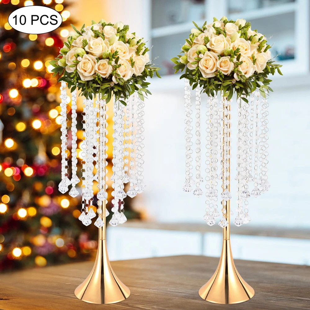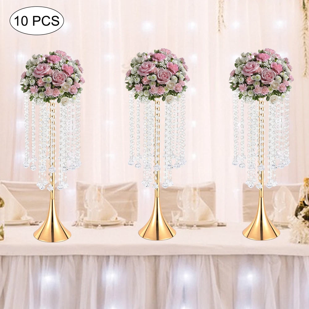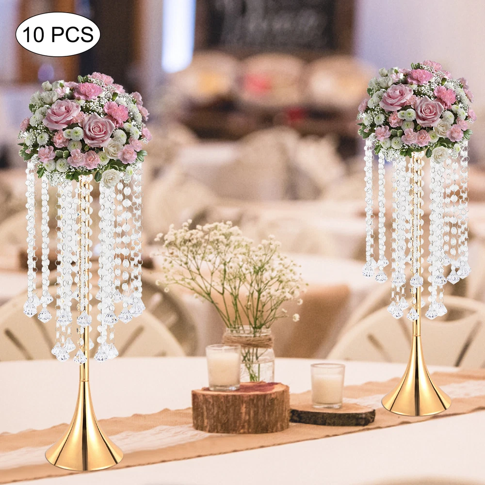Specification Color: Gold Shape: Trumpet Treatment: Electroplating, Polishing, Hand-strung, Drilling, Welding Material: Iron, Acrylic Beads Style: Romantic, European Number of Pieces: 10 Assembly Required: Yes Installation Type: Centerpieces, Tabletop Number of acrylic Pendants: 24 Number of Octagonal Beads: 16 (Inner Ring), 12 (Outer Ring) Top Diameter: 20cm/7.9inch (Each) Base Diameter: 14.2cm/5.6inch (Each) Flower Vase Height: 55.6cm/21.9inch (Each) Package Size: 35*35*25cm/13.78*13.78*9.84inch Net Weight: 11kg/24.25lbs Gross Weight: 12.5kg/27.55lbs Package Included 10Pcs* Crystal Flower Vases All Accessories for Assembly 10pcs Crystal Flower Vases Golden Flower Stand Wedding Table Centerpieces Decor Description If you need some great flower vases to build a romantic wedding, a creative party, or a fantastic celebration, our product will be your best choice. Equipped with acrylic pendants with hand-strung beads, this flower vase can spice up the dull decor and create an eye-catching and dreamy atmosphere. And it uses high-quality iron and acrylic material with various processes such as electroplating, making it durable and reusable. Key Features Durable and Reusable: Each flower vase is made of high-quality iron with various exquisite processes such as electroplating, polishing, drilling, and welding, making it hard, durable, and reusable. Hand-strung Beads: The natural dangling of these hand-strung, elaborate beads adds so much beauty and elegance to the vase, showing your guests your elegant taste. Elegant Appearance: Its trumpet shape design, simple and smooth streamlines, and charming crystal beads present its uniqueness, novelty, creativity, and delicacy, adding an extra aestheticism to the scenes you need to decorate. Fascinating Backdrop: The acrylic crystal beads design can present a shimmering effect and spice up the dull decoration, especially under the sunshine or light, making it ideal for displaying as a fabulous backdrop for weddings, birthday parties, and other occasions. Easy to Assemble: For its simple structure and all accessories we provide, you can assemble this product easily and quickly. Easy to Clean: Due to its iron material with polishing and electroplating process, you can use a soft cloth to clean and dry, which is very simple. Easy to Store: Due to the segmented design and 24.25 lbs of total weight, these flower vases are easy to carry and store. Buy with Confidence: We aim to provide high-quality products and services. If you have any problems, please feel free to contact us. We will reply and solve the problem for you as soon as possible. Detail Top Flower Plate: The top flower plate is designed with two circles and three bars, together with drilling and welding processes, making it stable and unique. Stable Base: Its enlarged trumpet-shaped base has a diameter of 5.6 inches with good stability so that the entire vase firmly on the ground even if there are many flowers on it. Application These flower vases are suitable for wedding aisle decors, wedding receptions, event centerpieces, lower road leads, and daily home decoration. You can use them for housewarming, anniversaries, birthdays, weddings, engagements, etc. Specification Color: Gold Shape: Trumpet Treatment: Electroplating, Polishing, Hand-strung, Drilling, Welding Material: Iron, Acrylic Beads Style: Romantic, European Number of Pieces: 10 Assembly Required: Yes Installation Type: Centerpieces, Tabletop Number of acrylic Pendants: 24 Number of Octagonal Beads: 16 (Inner Ring), 12 (Outer Ring) Top Diameter: 20cm/7.9inch (Each) Base Diameter: 14.2cm/5.6inch (Each) Flower Vase Height: 55.6cm/21.9inch (Each) Package Size: 35*35*25cm/13.78*13.78*9.84inch Net Weight: 11kg/24.25lbs Gross Weight: 12.5kg/27.55lbs Package Included 10Pcs* Crystal Flower Vases All Accessories for Assembly Notes 1.Please note that flower balls are not included. 2.To extend its service life, do not use abrasives for cleanup. You can use a soft cloth to clean and dry. 3.Please allow the slight color difference caused by the shooting light and the 1-3cm error due to manual measurement. Please make sure you do not mind before you order. Payment Delivery details Terms of sales About us Contact us Payment We accept ebay payment 。 Fees such as import duties, taxes are not included in the item price or shipping costs. These charges are the buyer's responsibility. Delivery details Shipping: 2-9 working days to: USA Terms of sales We maintain high standards of excellence and strive for hundred percent customer satisfaction. Feedback is very important to us. We hope that you contact us immediately before you give neutral or negative feedback, so that we can address your concerns. It is impossible to address issues if we do not know about them! About us Your satis faction is our ultimate goal. We work hard to earn your trust and future business. Our certified technicians have tested each item before shipping. The unit comes with 1 year limited warranty on all manufacturing defects. a) If you receive a defective item, you may return it or ask for a discount. Please contact us within 14 days after you receive the package. b) What you returned must be intact and in its original packaging as re? u. Customer is responsible for shipping costs of the returned item. c) We will cover the cost of shipping back t with the shipping rate indicated in the registration page. We will send you a new unit or refund the full payment you paid. Thank you. Contact us Business Hour Business Hour: Monday To Friday: 8:30 AM to 5:00 PM (Beijing China time) Due to time zones, our reply to your questions may not be immediately. But within above working time, we will reply your email within 24 hours. If it's non-workdays, please kindly be patient and wait till Monday. Please contact us with ebay message. Please feel free to contact us if you have any questions. Monday To Friday: 8:30 AM to 5:00 PM (Beijing China time) Due to time zones, our reply to your questions
