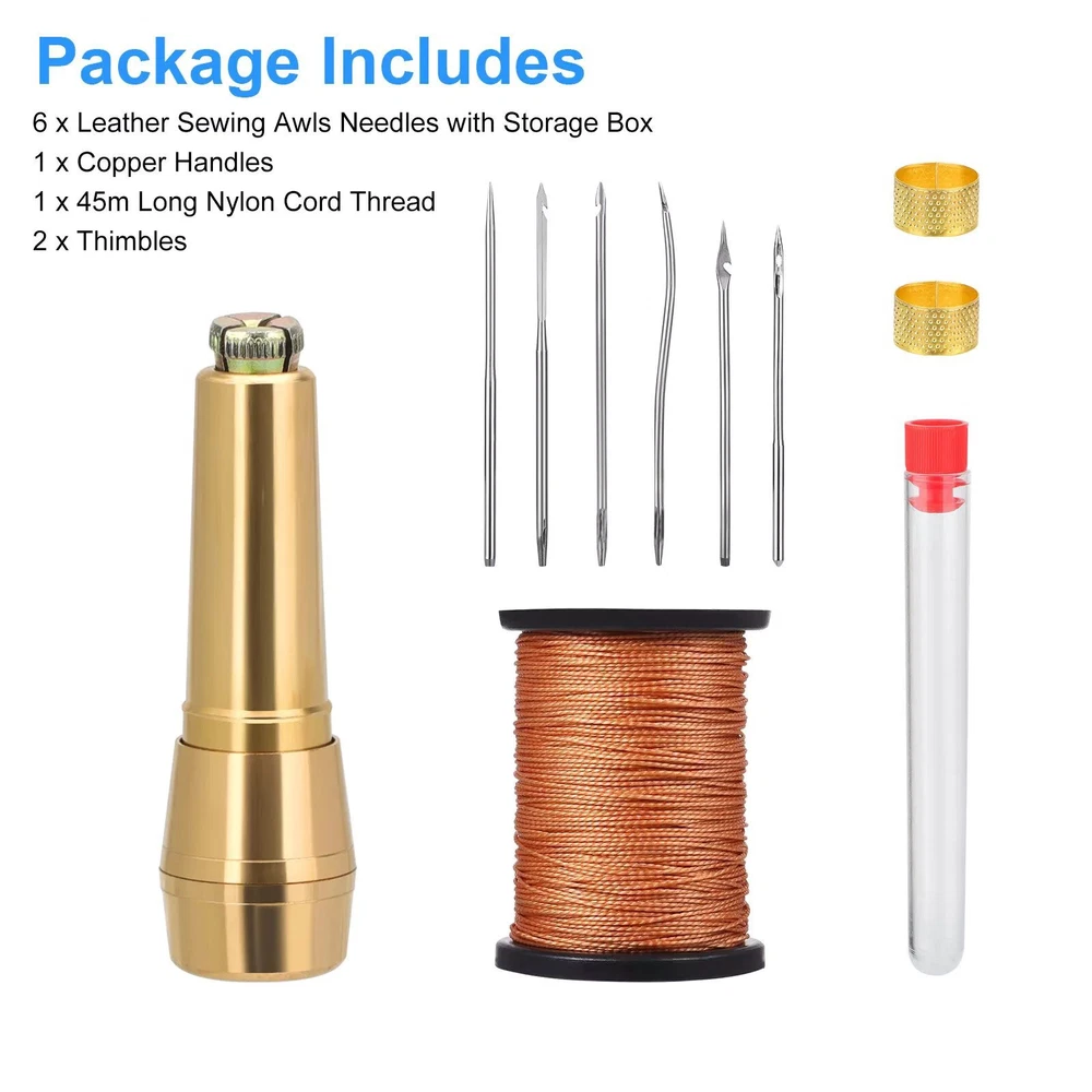 Product Description Features: 1. 6 Different Sewing Needles: The Copper Handle Can Fit For These 6 Different Sewing Needles; Just Turn The End Of The Handle To Change The Needle To Meet Your Different Needs, Convenient To Use In Daily Life 2. 45 M Nylon Rope: The Nylon Cord Thread Is Suitable For Repairing Sandals, Leather Shoes, Cloth Shoes, Other Footwear And Fishing Line For Fishing Enthusiasts; High Strength, Not Easy To Break, So It Is Also Suitable For Various Diy Handmade Projects 3. Quality Material: The Handle Is Made Of Copper, Which Is Durable And Comfortable To Hold; The Needle Is Made Of Metal, Not Easy To Rust Or Deform, Which Can Help You Deal With Various Sewing Tasks, Both Materials Can Be Applied For A Long Time 4. Easy To Store: You Can Remove The Needle When Not In Use, Which Is Lightweight And Easy To Store, Also Easy To Find When You Use It Next Time; Please Pay Attention To Pointed Objects And Keep Them Out Of The Reach Of Children 5. Package Includes: The Package Comes With 6 Pieces Of Canvas Leather Sewing Awls Needles, 1 Piece Of Copper Handles, 1 Roll Of 45 M Long Nylon Cord Thread And 2 Pieces Of Thimbles, Totally 10 Pieces Of Handmade Leather Sewing Tools Specifications: Type: Sewing Awl Needle Condition: 100% New Material: Nylon+Metal+Copper Quantity: 10Pcs Fit : For Leather Crafts Application: For Car Seat, Sofa, Umbrella, Carpets, Upholstery, Coats, Etc Packaging Includes: 6 X Leather Sewing Awls Needles With Storage Box 1 X Copper Handles 1 X 45m Long Nylon Cord Thread 2 X Thimbles If you have any doubts or uncertainty about this item, contact us with no hesitation, we are always here and will solve your problems. Thanks and wish you a nice day! About Us We dedicated to provide excellent products and services for all customers on ebay. hope we all can have a nice experiences on eBay. Payment We accept all verified payment through PAYPAL payment. Shipping Usually, Item will be shipped within 1-2 working day after full payment is received. Normally, you will receive the item in 5-7 days. Please contact us if you don’t receive the items after 10 working days after the payment If you have any questions about shipping, please feel free to contact us. Returns Always believe we can solve problems by communication if it comes to any problems about products or any others. If it comes to a return, the products must be intact and as original when you received, and should be within 30 days after you received it. Contact Us Work time: 9:00 AM to 18:00 PM Beijing Time You can contact us at anytime you want, we will reply all messages at the first time. powered by