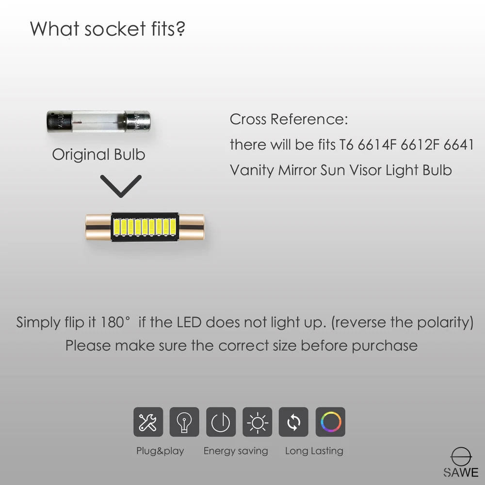 Package Contents: 10 x White T6 28MM 9SMD LED Bulb Car Vanity Mirror Light Sun Visor Fuse Lamp 6641 Pry Tool x 1 (90 days Manufacturer's Warranty directly from us!) LED Features: Voltage:DC 12V Number of Bulbs: 9 pieces 4014 LED Color: Ultra White Socket Type: Sunvisor Vanity Miror Long life-typically lasting 50,000 hours Color Temperature: 6000~6500K Condition: Brand New Length: 28mm / 1.1 inch Diameter: 7.9mm / 0.31 inch Cross Reference Bulb Sizes: T6 6612F 6614F 6641 Fuse Shape A Friendly Reminder: 10 x White T6 28MM 9SMD LED Bulb Car Vanity Mirror Light Sun Visor Fuse Lamp 6641 Package Contents: 10 x White T6 28MM 9SMD LED Bulb Car Vanity Mirror Light Sun Visor Fuse Lamp 6641 Pry Tool x 1 ( 90 days Manufacturer's Warranty directly from us!) LED Features: Voltage:DC 12V Number of Bulbs: 9 pieces 4014 LED Color: Ultra White Socket Type: Sunvisor Vanity Miror Long life-typically lasting 50,000 hours Color Temperature: 6000~6500K Condition: Brand New Length: 28mm / 1.1 inch Diameter: 7.9mm / 0.31 inch Cross Reference Bulb Sizes: T6 6612F 6614F 6641 Fuse Shape A Friendly Reminder: Non-Polarity Design & Plug and Play Socket The application varies from different vehicles, which means they may not fit all postions on one vehicle. If you don't know if this bulb fits your car, you can check in sylvania-automotive. Fitment: This LED can fit more than one car, please check the “ Compatibility Table ” before check out. (Send us a message for more questions) Item Specifics Interchange Part Number T6 6614F 6641 6612F Bulb Color White Manufacturer Part Number 10S-FT-021-T03 Placement on Vehicle Front Rear Left Right Brand SAWE Number of Bulbs 10 Warranty 90 Day Lighting Technology LED Bulb Fitment Code T6 6614F 6641 Suitable For Visor Light, Vanity Mirror Light Type Vanity Mirror Light DESCRIPTION PAYMENT SHIPPING RETURN POLICY CONTACT US Shop Category Store Home Apple iPad Case ◈ iPad Mini 1 / 2 / 3 Case ◈ iPad Mini 4 (4th Gen) Auto LED Lights ◈ T10 168 194 ◈ Resistor ◈ 1156 ◈ 31 mm LED ◈ 41 mm LED ◈ BA9S ◈ Honda Interior LED Package ◈ Acura Interior LED Package ◈ Toyota Interior LED Package ◈ Scion Interior LED Package ◈ Subaru Interior LED Package ◈ Mitsubishi Interior LED Packag ◈ Mazda Interior LED Package ◈ Hyundai Interior LED Package ◈ Lexus Interior LED Package ◈ Nissan Interior LED Package ◈ Infiniti Interior LED Package ◈ Kia Interior LED Package ◈ BMW Interior LED Package ◈ Mercedes Interior LED Package ◈ Audi Interior LED Package ◈ Chevrolet LED Package ◈ Volkswagen LED Package ◈ Cadillac LED Package ◈ Chrysler LED Package ◈ Dodge Interior LED Package ◈ Ford LED Package ◈ Porsche LED Package ◈ GMC LED Package ◈ Mini LED Package ◈ Lincoln LED Package ◈ Jeep LED Package ◈ Hummer LED Package ◈ Sun Visor LED ◈ Rigid Loop LED ◈ 44 mm LED ◈ Strobe Warning Light ▷ Reverse,Signal, Brake LED ♢ T15 921 912 LED ♢ 3156 / 3157 ♢ 7440 / 7443 ♢ 1157 Bags ◈ Zip Lock Bags ◈ Static Bags Other Hot Item 4 x Red 28mm 3SMD T6 6641 LED Bulbs Sun Visor Vanity Mirror Fuse Lights + TOOL USD 7.96 6 x White 28mm 3SMD T6 6641 LED Bulbs Sun Visor Vanity Mirror Fuse Lights + TOOL USD 8.99 20 x White 28mm 3SMD T6 6641 LED Bulbs Sun Visor Vanity Mirror Fuse Lights +TOOL USD 14.99 4 x SAWE White LED Sun Visor Vanity Mirror Lights Bulbs T6 6612F 6614F 6641 28mm USD 7.99 4 x White 28mm 3SMD T6 6641 LED Bulbs Sun Visor Vanity Mirror Fuse Lights + TOOL USD 7.99 New List Item 16 x Red LED Interior Light Package For 2007 - 2014 Cadillac Escalade + TOOL USD 14.99 11 x Green LED Interior Light Package For 1999 - 2004 VW Jetta MK4 + PRY TOOL USD 12.99 16 x Pink LED Interior Light Package For 2007 - 2014 Cadillac Escalade + TOOL USD 14.99 13 x Pink LED Interior Light Package For 1999 - 2005 VW Golf GTi R32 Mk4 + TOOL USD 14.99 11 x Xenon White LED Interior Light Package For 2005 - 2011 Cadillac STS + TOOL USD 12.99 Help & Info Payment Policy Shipping Policy Return Policy FAQ About Us 10 x White T6 28MM 9SMD LED Bulb Car Vanity Mirror Light Sun Visor Fuse Lamp 6641 Package Contents: 10 x White T6 28MM 9SMD LED Bulb Car Vanity Mirror Light Sun Visor Fuse Lamp 6641 Pry Tool x 1 ( 90 days Manufacturer's Warranty directly from us!) LED Features: Voltage:DC 12V Number of Bulbs: 9 pieces 4014 LED Color: Ultra White Socket Type: Sunvisor Vanity Miror Long life-typically lasting 50,000 hours Color Temperature: 6000~6500K Condition: Brand New Length: 28mm / 1.1 inch Diameter: 7.9mm / 0.31 inch Cross Reference Bulb Sizes: T6 6612F 6614F 6641 Fuse Shape A Friendly Reminder: Non-Polarity Design & Plug and Play Socket The application varies from different vehicles, which means they may not fit all postions on one vehicle. If you don't know if this bulb fits your car, you can check in sylvania-automotive. Fitment: This LED can fit more than one car, please check the “ Compatibility Table ” before check out. (Send us a message for more questions) Item Specifics Interchange Part Number : T6 6614F 6641 6612F Bulb Color : White Manufacturer Part Number : 10S-FT-021-T03 Placement on Vehicle : Front Rear Left Right Brand : SAWE Number of Bulbs : 10 Warranty : 90 Day Lighting Technology : LED Bulb Fitment Code : T6 6614F 6641 Suitable For : Visor Light, Vanity Mirror Light Type : Vanity Mirror Light Payment Shipping Returns Contact Us Pay securely with any major credit card through PayPal! Payment must be received within 7 days after auction closes. Please ensure that the shipping address you provide at checkout is accurate. We are not responsible for undeliverable or wrong shipped addres Pay securely with any major credit card through PayPal! Payment must be received within 7 days after auction closes. Please ensure that the shipping address you provide at checkout is accurate. We are not responsible for undeliverable or wrong shipped addres Pay securely with any major credit card through PayPal! Payment must be received within 7 days after auction clo