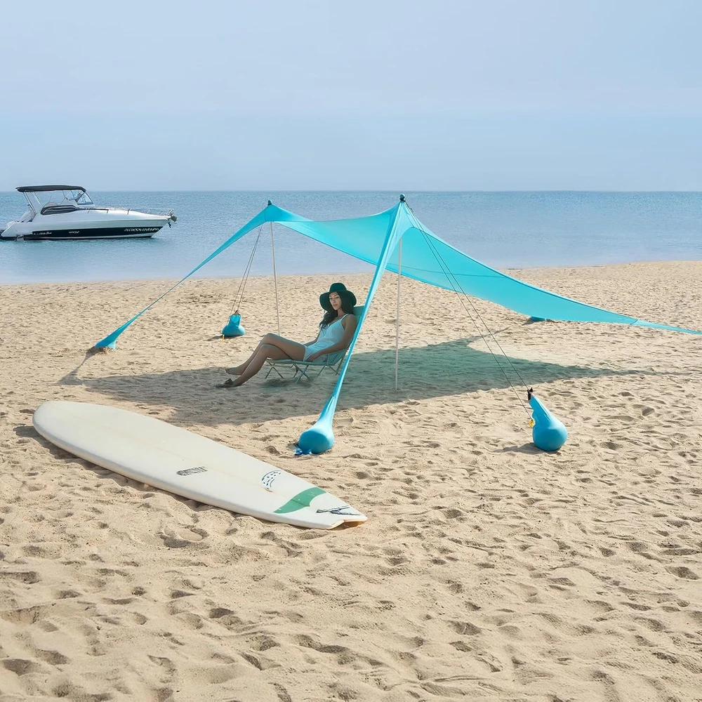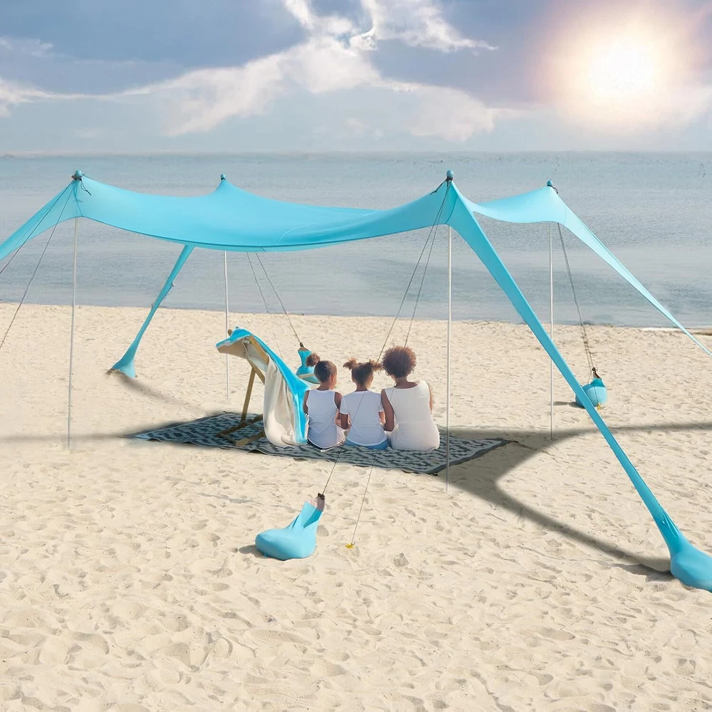 Beach Tent Sun Shelter 10 x 10FT, UPF 50+ Protection Beach Shade Canopy with 8 Sandbags, Eazy Up Portable Canopy Tent for Beach, Camping, Fishing, Backyard Stable Windproof Performance: beach tent sun shelter includes 8 sandbags and 8 adjustable Windproof Ropes, which keeps the canopy grounded during sudden gusts. Dual-layer stitching and reinforced corners prevent fraying, ensuring worry-free use at campsites, parks, or sandy shores. Advanced Sun Protection: Stay cool and protected with advanced UV-blocking Lycra fabric, rated UPF 50+ to block 98% of harmful rays. The breathable material reduces heat buildup while preventing sunburn, whether you're fishing by the lake or cheering at soccer games under the midday sun. Easy to install & Portable: sun shade for beach includes visual setup guides for stress-free installation, even 1 person can install in minutes. Pack it down just as fast into the included 22x9.5” carry bag (weighs only 10 lbs), designed to fit in car trunks, RVs, or even checked luggage. Spacious Beach Tent: Designed for families and groups, 10 x 10ft beach canopy offers generous coverage with a 6.5ft center height for comfortable movement. The lightweight yet durable steel frame withstands wind and wear, making it ideal for beach days, picnics, or backyard gatherings. Versatility Construction: Adjust poles and sand anchors to angle shade for optimal sun blocking in seconds. You can also build beach sun shelter on gardens, backyards, lawns, sand, picnic, garden, group activities, field training, summer camp, vehicle shading even rock campsites. Color Sky Blue Product Dimensions 118.1"L x 118.1"W x 78.7"H Water Resistance Level Waterproof Assembly Required Yes