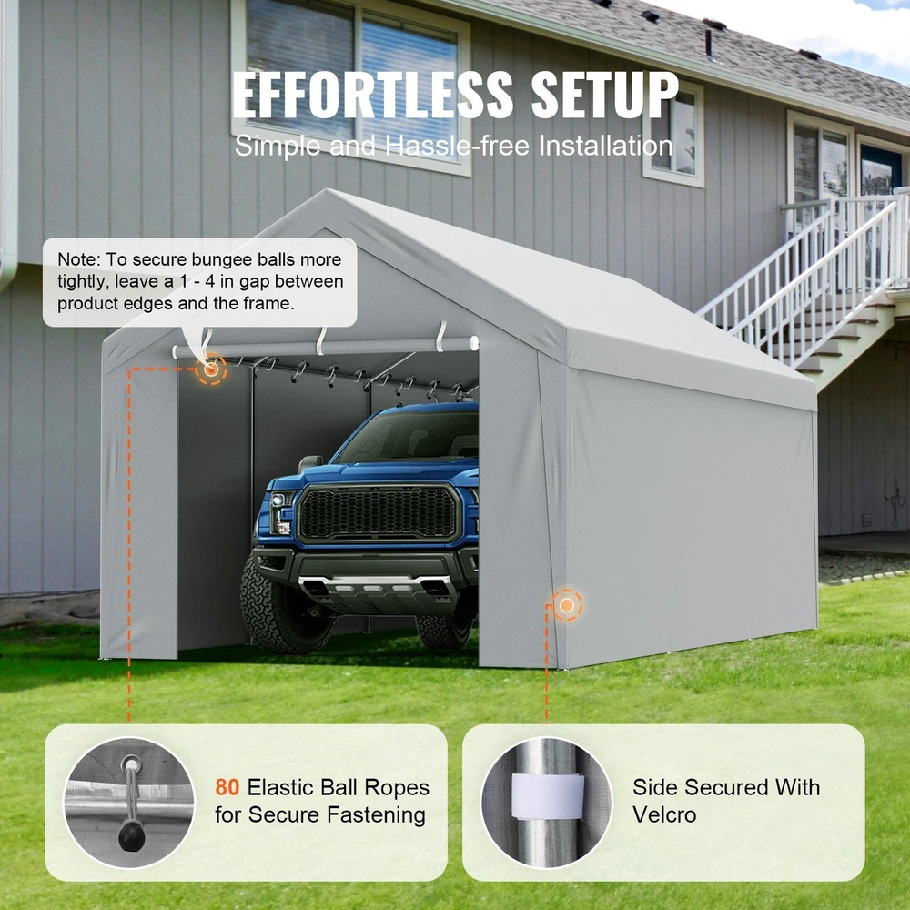 Store Categories Store Categories Easy Installation with Ball Bungees,White (Frame Not Included) Product Description Highlights 10'x20' Size: This canopy fabric, including both the top and side panels, features a 5-panel front door with a dual zipper structure. It is designed for replacing canopy fabric on 10'x20' garage frames. The space is ample, and the dimensions are perfectly fitting (this product includes only the canopy fabric, frame not included). Durable Material: The top canopy fabric is 210g PE plastic woven, while the side panels are 180g PE plastic. Both are crafted with a 16x16 weave pattern for thickness and resistance to water pooling. Double-layer heat-sealed seams and reinforced Velcro attachments ensure durability and longevity. Waterproof and UV Protection: Coated with PU+UV-resistant on both sides, this fabric offers excellent waterproofing and can withstand UV50+ ultraviolet radiation, ensuring reliable use in various weather conditions. Easy Installation: Comes with elastic ball bungees for fastening through aluminum grommets, and Velcro for side attachment, making installation simple and tool-free. Note: The carport cover is not suitable for arch-shaped frame. Wide Application: This canopy is versatile, suitable for replacing garage side canopies, setting up temporary garages, and parking various vehicles. It can also be used for parties, weddings, creating shaded areas, and more creative uses awaiting your discovery! Specification UPC: 197988386834 Dimensions: 19.89 in. * 13.00 in. * 13.00 in. Weight: 30.12 lbs Shipping Policy Returns Policy Payment Policy Customer Service Shipping Policy Handling Time: Orders ship within 1–3 business days. S hippin g From : All items are shipped from our U.S. local warehouse. C arri ers Used: We will choose the most suitable carrier based on the buyer’s location, including UniUni, Gofo, UPS, and FedEx etc. Delive ry Range : Fast and reliable deliver y within the United S tates. Not e : If you need expedited shipping, please co n tact us before placing your order. Your purchase is shipped directly to you as soon as we have received your cleared payment. We will send information on eBay or email if the parcel was delayed due to our holiday. Returns Policy We offer 30-day returns for items with quality-related issues. If the item arrives damaged, defective, or not as described, please contact us immediately for a replacement or refund. To ensure a smooth process, please keep the item in its original condition and provide photos of the issue when possible. We strive to make returns fast, transparent, and hassle-free. Payment Policy Payment must be received within 7 business days of auction closing.We ship to your eBay or Paypal address. Please make sure your eBay and Paypal addres s is correct before you pay. Your payment is always secure and protected through eBay’s trusted checkout system. Customer Service We respond to messages promptly, often immediately during business hours. In all cases, we guarantee a reply within 12 hours. Our team is committed to p roviding friendly, efficient, and professional support for any questions regarding your order, logistics, or product details. Your satisfacti o n is our top priority. Copyright © 2023 Dianxiaomi