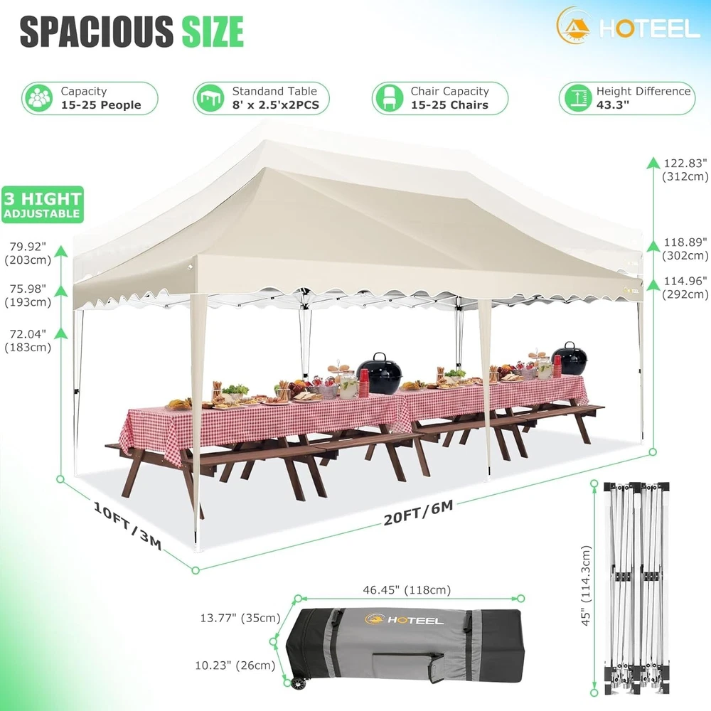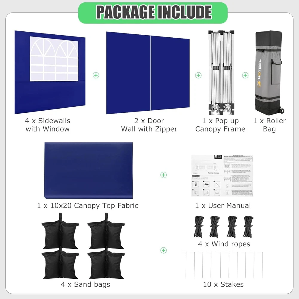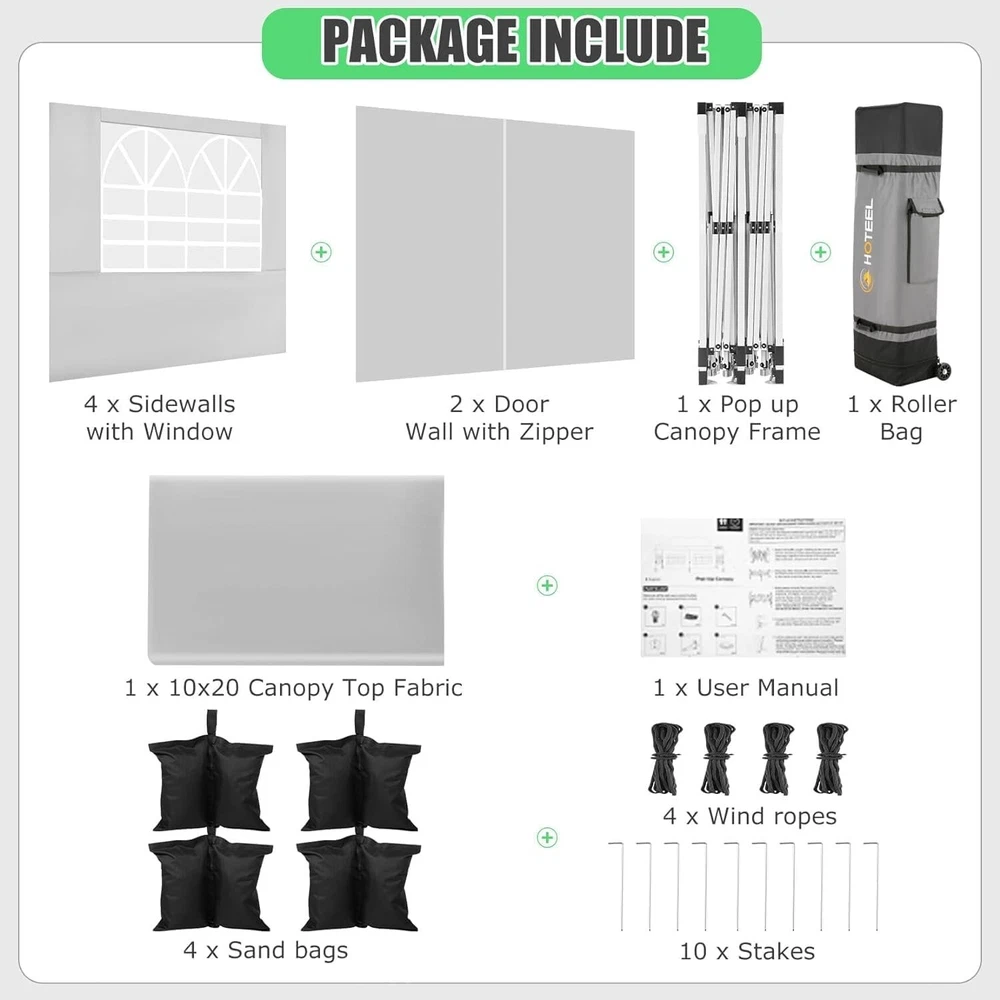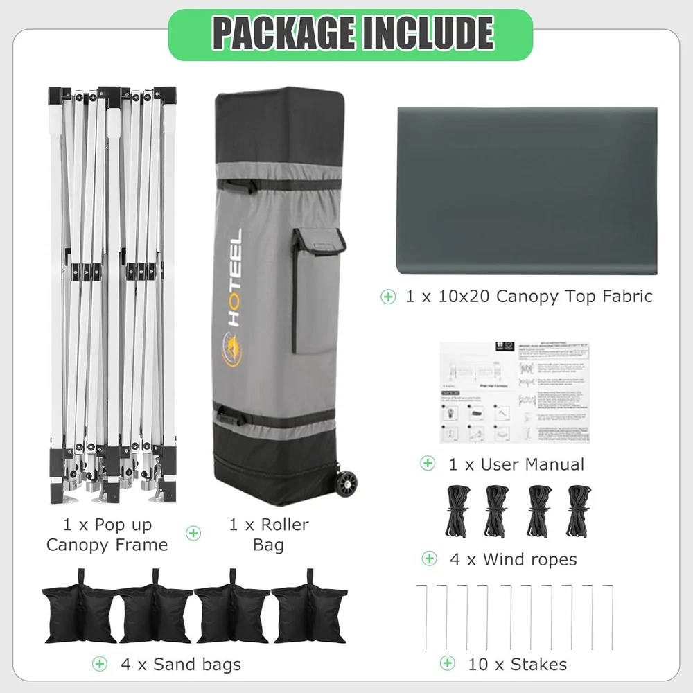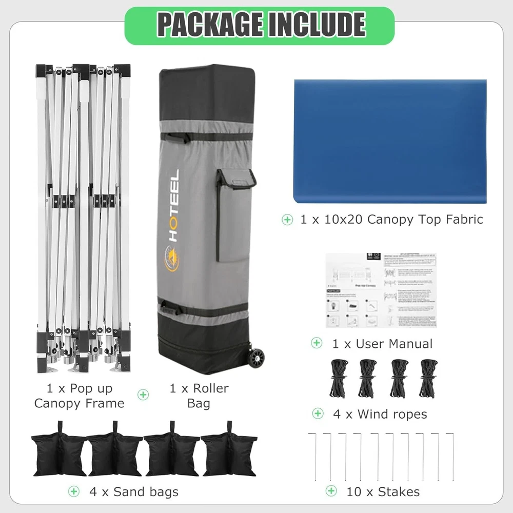 Product Description 10x20 POP UP CANOPY Tents Advantage The Hoteel 10x20 pop up canopy comes with a wheeled bag for easy transportation and portability. It features an upgraded height, with the top reaching up to 122.83 inches. The frame is made of durable powder-coated steel, with rust-proofing and thickened alloy steel frame structure for an upgraded aesthetic, robustness, durability, rust resistance, and corrosion resistance. The sturdy metal clamps reinforce the frame's telescoping connection points, providing stability and wind resistance. Frame The Hoteel 10x20 pop up canopy, enhanced for durability and stability, benefits from its 30x30 mm reinforced aluminum legs. Fabric 420D Oxford fabric with PU silver coating and waterproof strip, offering waterproof and UV Sidewall 6 210DPA coated side cloths (4 with windows,2 with zippers). Packaging includes 10x20ft pop up canopy Frame, one 800D Oxford fabric wheeled bag with PVC coating (detachable wheels), 4 sandbag,6 210DPA coated side cloths (4 with windows,2 with zippers),10 stakes, 4 ropes, Instruction Manual NOTE 1 When in use, secure your canopy using the provided stakes, wind ropes, and sandbags to ensure the stability of the tent. NOTE 2 Not suitable for heavy rain or strong winds and Before purchasing, it's advisable to ensure the length of the canopy is suitable for your car's trunk--Box length is 46.85in. Installation Size 10x20x10.23ft Package Size 46.85"L x 11.02"W x 15.35"H Height Adjustable 9.58/9.91/10.23ft Color White/Black/Blue/Khaki/Grey Net Weight 75.84LB HOTEEL 10x20 Pop Up Canopy Display HOTEEL 10x20 Pop Up Canopy Detail Display