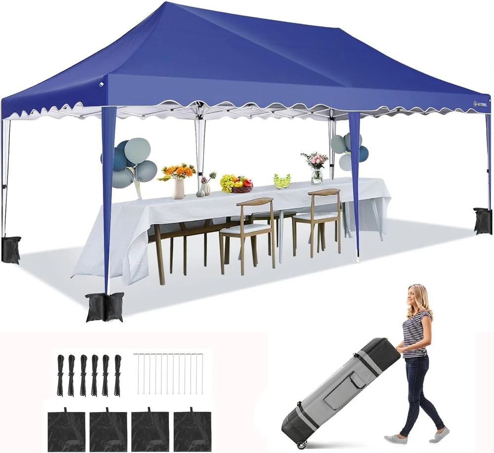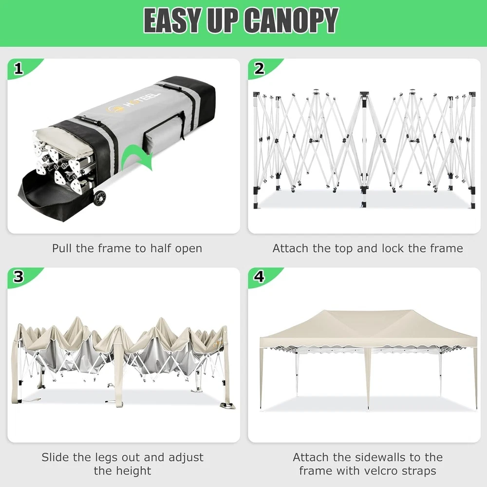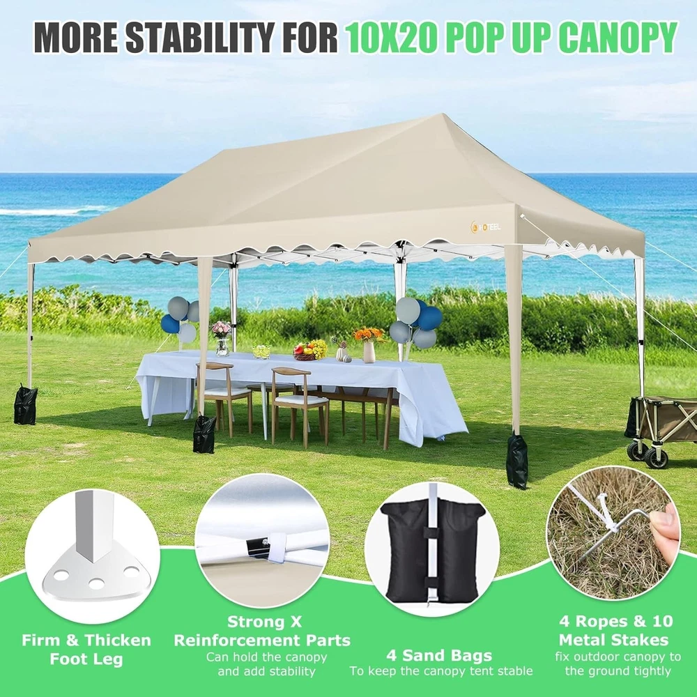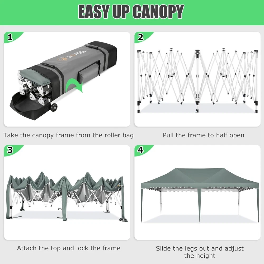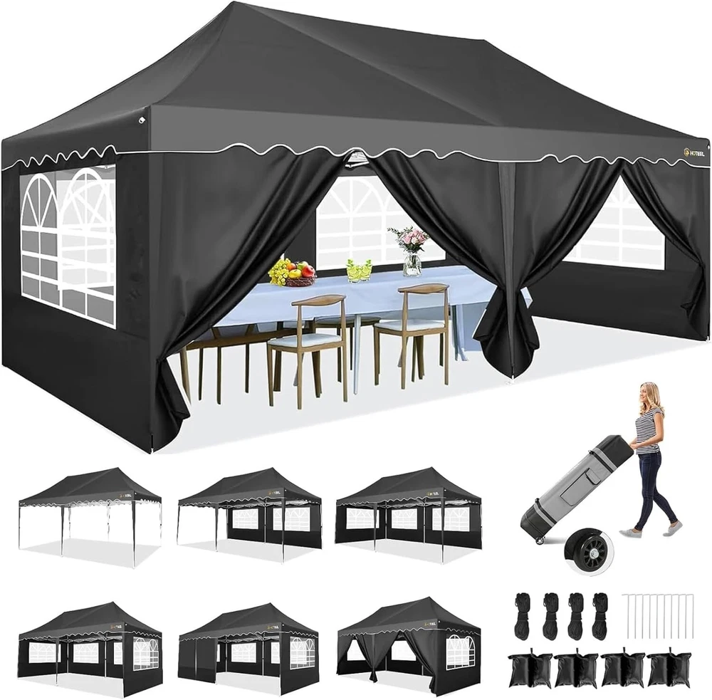 Product Description 10x20 POP UP CANOPY Tents Advantage The Hoteel 10x20 pop up canopy comes with a wheeled bag for easy transportation and portability. It features an upgraded height, with the top reaching up to 122.83 inches. The frame is made of durable powder-coated steel, with rust-proofing and thickened alloy steel frame structure for an upgraded aesthetic, robustness, durability, rust resistance, and corrosion resistance. The sturdy metal clamps reinforce the frame's telescoping connection points, providing stability and wind resistance. Frame The Hoteel 10x20 pop up canopy, enhanced for durability and stability, benefits from its 30x30 mm reinforced aluminum legs. Fabric 420D Oxford fabric with PU silver coating and waterproof strip, offering waterproof and UV Sidewall 6 210DPA coated side cloths (4 with windows,2 with zippers). Packaging includes 10x20ft pop up canopy Frame, one 800D Oxford fabric wheeled bag with PVC coating (detachable wheels), 4 sandbag,6 210DPA coated side cloths (4 with windows,2 with zippers),10 stakes, 4 ropes, Instruction Manual NOTE 1 When in use, secure your canopy using the provided stakes, wind ropes, and sandbags to ensure the stability of the tent. NOTE 2 Not suitable for heavy rain or strong winds and Before purchasing, it's advisable to ensure the length of the canopy is suitable for your car's trunk--Box length is 46.85in. Installation Size 10x20x10.23ft Package Size 46.85"L x 11.02"W x 15.35"H Height Adjustable 9.58/9.91/10.23ft Color White/Black/Blue/Khaki/Grey Net Weight 75.84LB HOTEEL 10x20 Pop Up Canopy Display HOTEEL 10x20 Pop Up Canopy Detail Display
