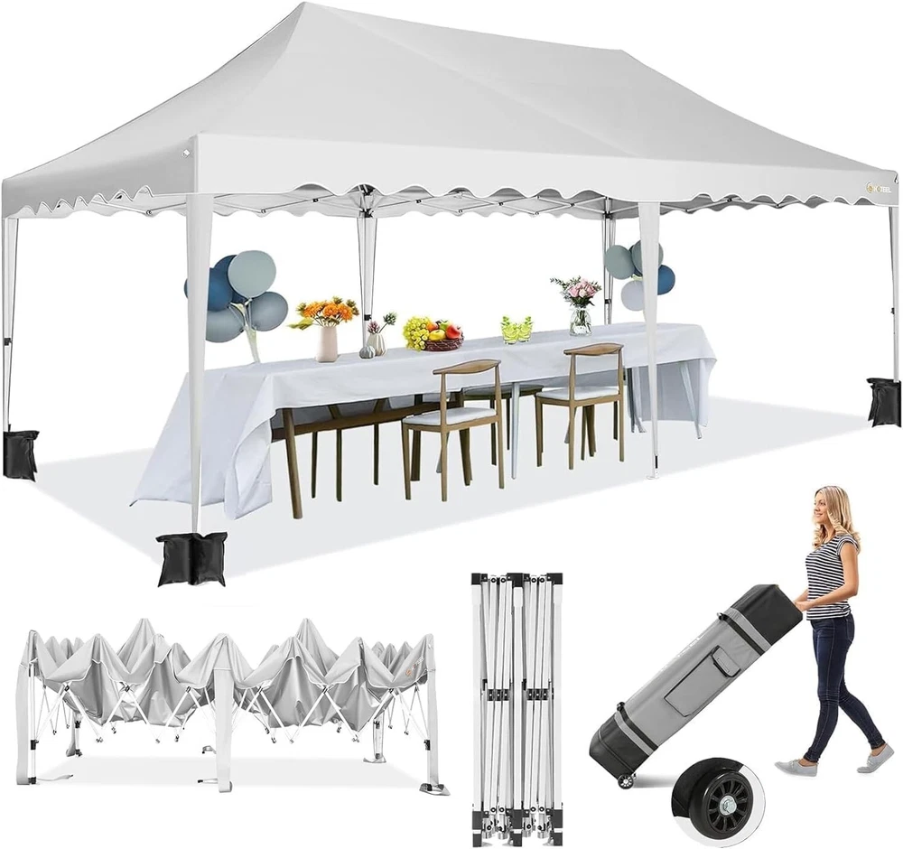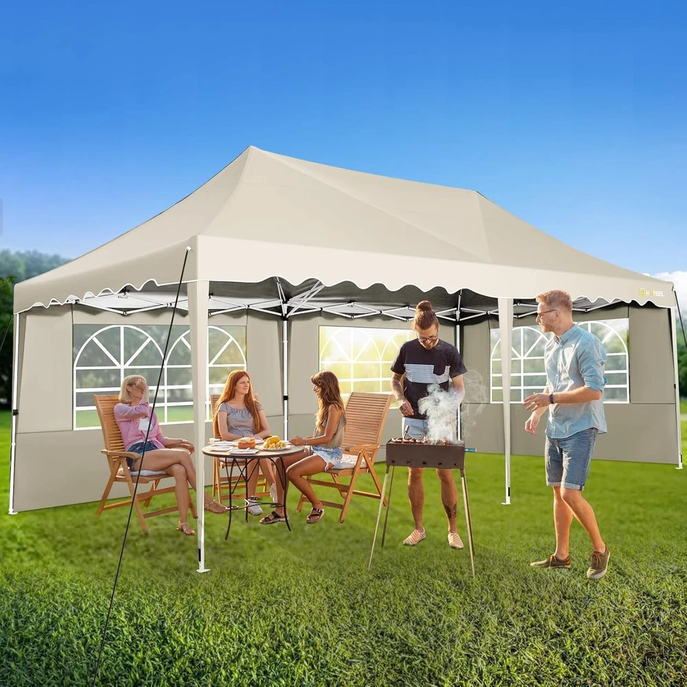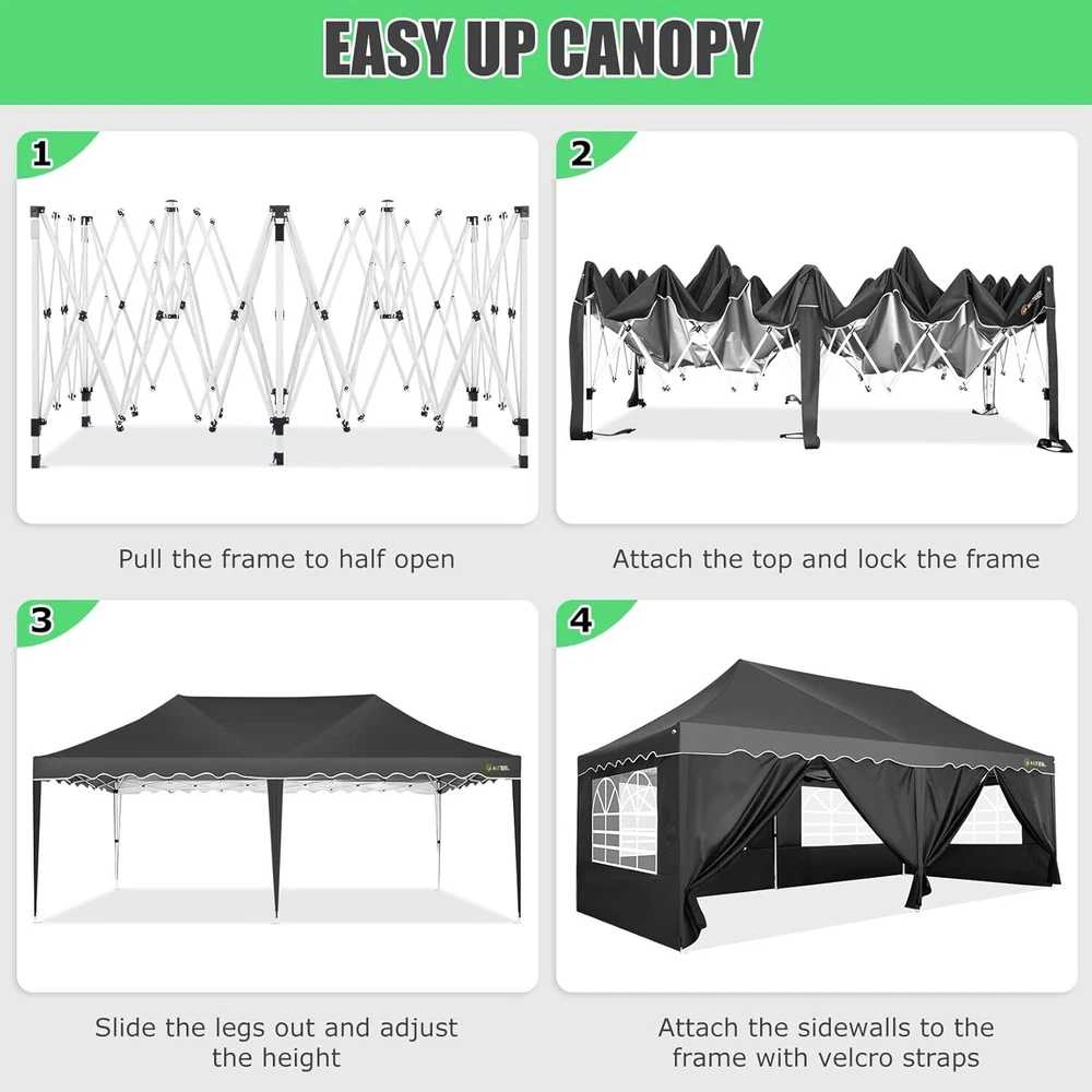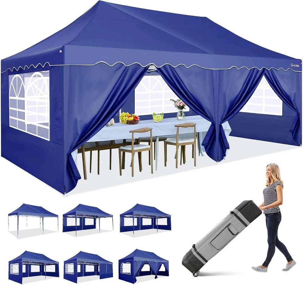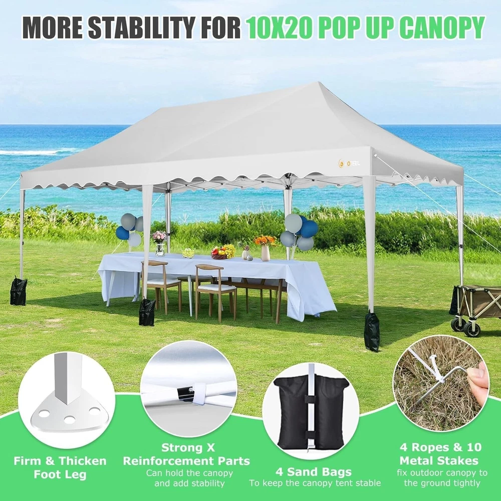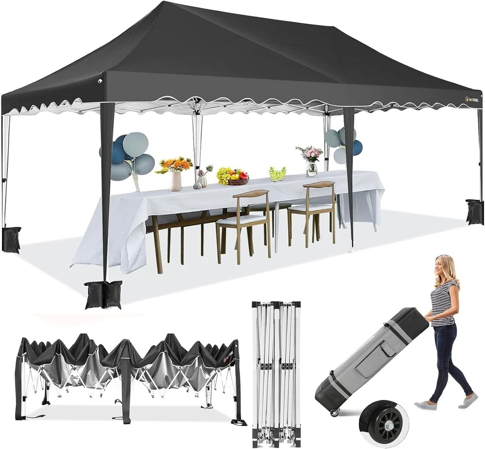 Product Description 10x20 POP UP CANOPY Tents Advantage The Hoteel 10x20 pop up canopy comes with a wheeled bag for easy transportation and portability. It features an upgraded height, with the top reaching up to 122.83 inches. The frame is made of durable powder-coated steel, with rust-proofing and thickened alloy steel frame structure for an upgraded aesthetic, robustness, durability, rust resistance, and corrosion resistance. The sturdy metal clamps reinforce the frame's telescoping connection points, providing stability and wind resistance. Frame The Hoteel 10x20 pop up canopy, enhanced for durability and stability, benefits from its 30x30 mm reinforced aluminum legs. Fabric 420D Oxford fabric with PU silver coating and waterproof strip, offering waterproof and UV Sidewall 6 210DPA coated side cloths (4 with windows,2 with zippers). Packaging includes 10x20ft pop up canopy Frame, one 800D Oxford fabric wheeled bag with PVC coating (detachable wheels), 4 sandbag,6 210DPA coated side cloths (4 with windows,2 with zippers),10 stakes, 4 ropes, Instruction Manual NOTE 1 When in use, secure your canopy using the provided stakes, wind ropes, and sandbags to ensure the stability of the tent. NOTE 2 Not suitable for heavy rain or strong winds and Before purchasing, it's advisable to ensure the length of the canopy is suitable for your car's trunk--Box length is 46.85in. Installation Size 10x20x10.23ft Package Size 46.85"L x 11.02"W x 15.35"H Height Adjustable 9.58/9.91/10.23ft Color White/Black/Blue/Khaki/Grey Net Weight 75.84LB HOTEEL 10x20 Pop Up Canopy Display HOTEEL 10x20 Pop Up Canopy Detail Display