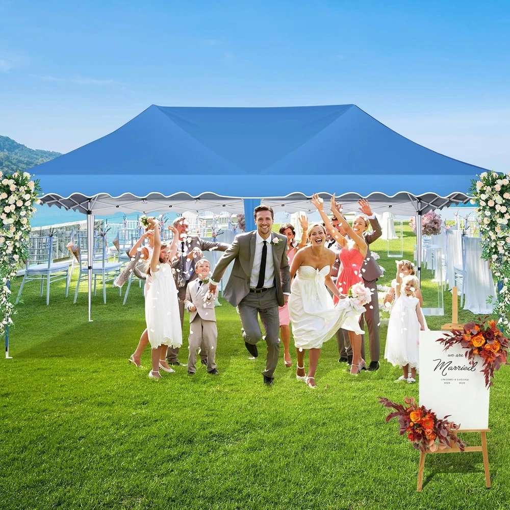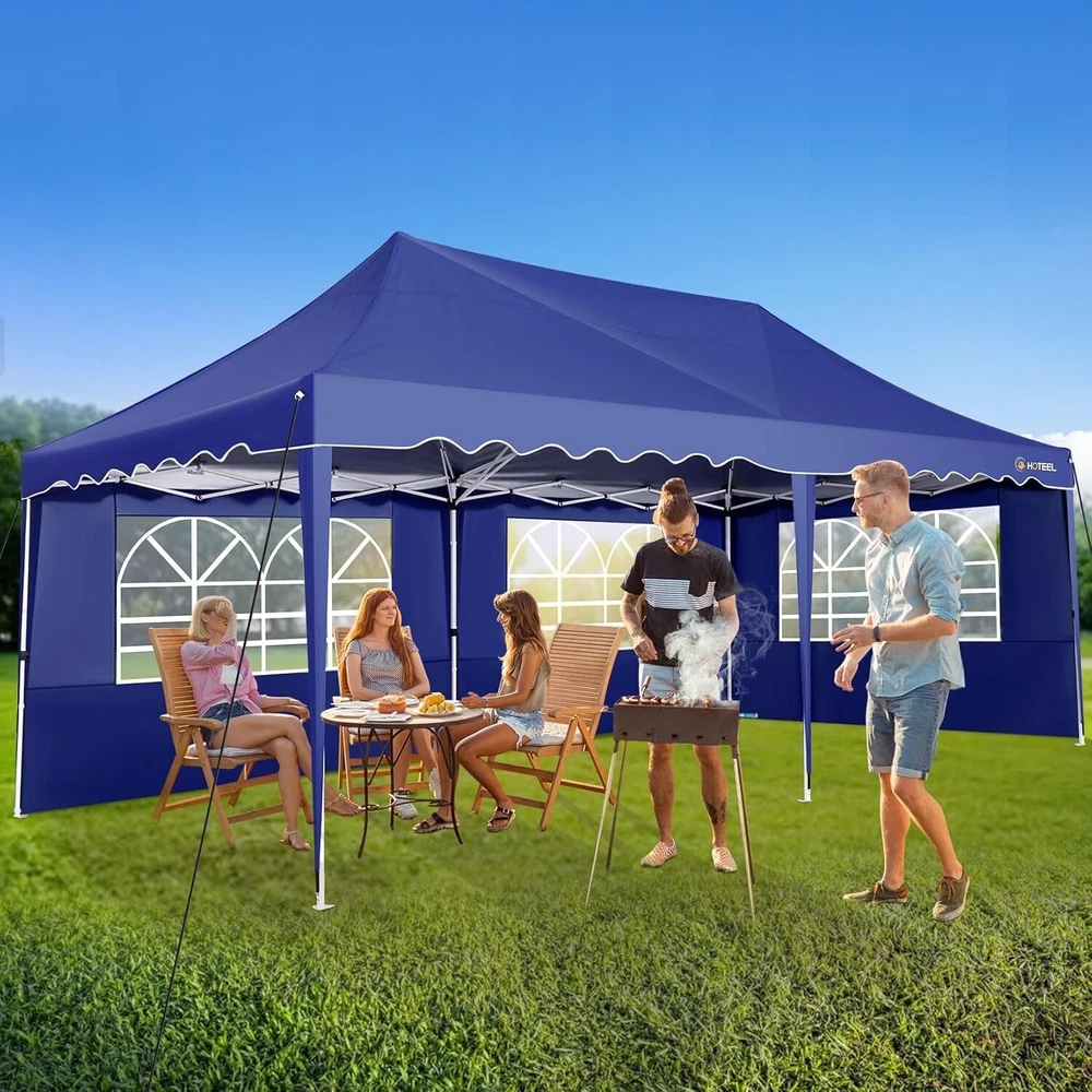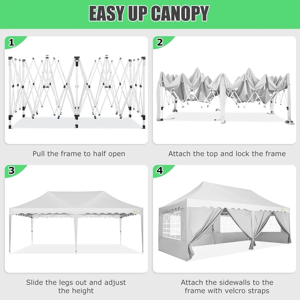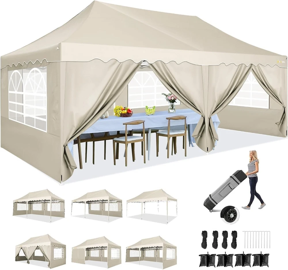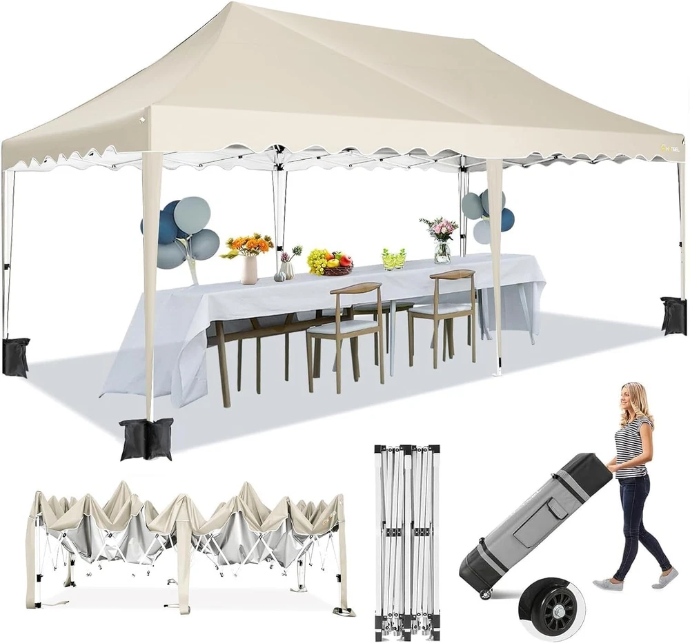 Product Description 10x20 POP UP CANOPY Tents Advantage The Hoteel 10x20 pop up canopy comes with a wheeled bag for easy transportation and portability. It features an upgraded height, with the top reaching up to 122.83 inches. The frame is made of durable powder-coated steel, with rust-proofing and thickened alloy steel frame structure for an upgraded aesthetic, robustness, durability, rust resistance, and corrosion resistance. The sturdy metal clamps reinforce the frame's telescoping connection points, providing stability and wind resistance. Frame The Hoteel 10x20 pop up canopy, enhanced for durability and stability, benefits from its 30x30 mm reinforced aluminum legs. Fabric 420D Oxford fabric with PU silver coating and waterproof strip, offering waterproof and UV Sidewall 6 210DPA coated side cloths (4 with windows,2 with zippers). Packaging includes 10x20ft pop up canopy Frame, one 800D Oxford fabric wheeled bag with PVC coating (detachable wheels), 4 sandbag,6 210DPA coated side cloths (4 with windows,2 with zippers),10 stakes, 4 ropes, Instruction Manual NOTE 1 When in use, secure your canopy using the provided stakes, wind ropes, and sandbags to ensure the stability of the tent. NOTE 2 Not suitable for heavy rain or strong winds and Before purchasing, it's advisable to ensure the length of the canopy is suitable for your car's trunk--Box length is 46.85in. Installation Size 10x20x10.23ft Package Size 46.85"L x 11.02"W x 15.35"H Height Adjustable 9.58/9.91/10.23ft Color White/Black/Blue/Khaki/Grey Net Weight 75.84LB HOTEEL 10x20 Pop Up Canopy Display HOTEEL 10x20 Pop Up Canopy Detail Display