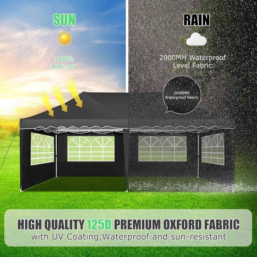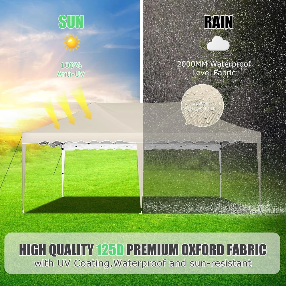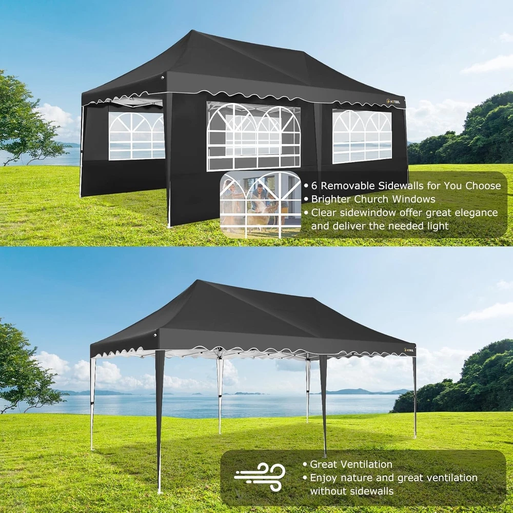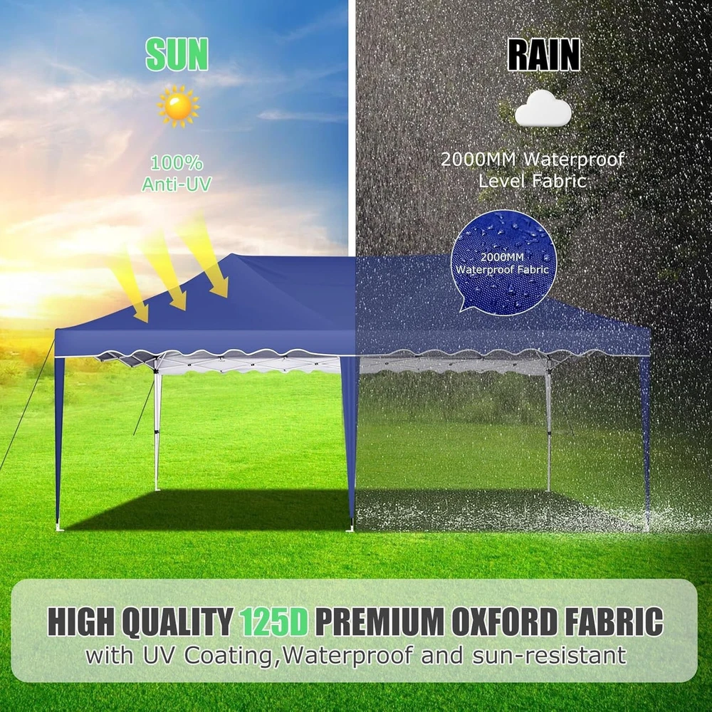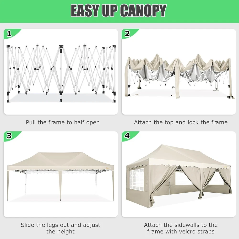 Product Description 10x20 POP UP CANOPY Tents Advantage The Hoteel 10x20 pop up canopy comes with a wheeled bag for easy transportation and portability. It features an upgraded height, with the top reaching up to 122.83 inches. The frame is made of durable powder-coated steel, with rust-proofing and thickened alloy steel frame structure for an upgraded aesthetic, robustness, durability, rust resistance, and corrosion resistance. The sturdy metal clamps reinforce the frame's telescoping connection points, providing stability and wind resistance. Frame The Hoteel 10x20 pop up canopy, enhanced for durability and stability, benefits from its 30x30 mm reinforced aluminum legs. Fabric 420D Oxford fabric with PU silver coating and waterproof strip, offering waterproof and UV Sidewall 6 210DPA coated side cloths (4 with windows,2 with zippers). Packaging includes 10x20ft pop up canopy Frame, one 800D Oxford fabric wheeled bag with PVC coating (detachable wheels), 4 sandbag,6 210DPA coated side cloths (4 with windows,2 with zippers),10 stakes, 4 ropes, Instruction Manual NOTE 1 When in use, secure your canopy using the provided stakes, wind ropes, and sandbags to ensure the stability of the tent. NOTE 2 Not suitable for heavy rain or strong winds and Before purchasing, it's advisable to ensure the length of the canopy is suitable for your car's trunk--Box length is 46.85in. Installation Size 10x20x10.23ft Package Size 46.85"L x 11.02"W x 15.35"H Height Adjustable 9.58/9.91/10.23ft Color White/Black/Blue/Khaki/Grey Net Weight 75.84LB HOTEEL 10x20 Pop Up Canopy Display HOTEEL 10x20 Pop Up Canopy Detail Display