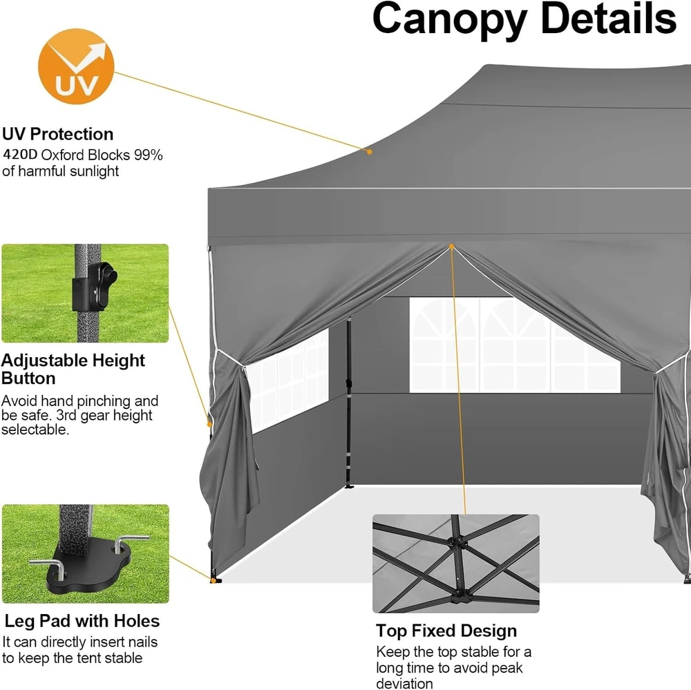 Product Description COBIZI 10x20 Heavy Duty Pop Up Canopy Tent with 6 Sidewalls Pop up party tents heavy duty can bear the weight of 7-8 people at the same time. Package Contents 1 x Pop Up Canopy Frame 1 x Canopy Tent Top Cover 1 x Wheeled Storage Bag 2 x Sidewall with Zipper 4 x Sidewall with Window 4 x Sandbag 6 x Ropes 12 x Ground Nails 100% Waterproof and UPF 50 +, Blocks 99% UV Sun Rays. Excellent load-bearing capacity, the frame can bear the weight of 7-8 people at the same time. 10x20 Heavy Duty Pop Up Canopy Tent have excellent waterproof, windproof, sun protection! Dimensions: 10 x 20 FT Adjustable Leg Height: 86.6/90.5/94.5 inch Adjustable Center Height: 122.0/126.0/129.9 inch Product Weight: 45kg / 99lbs Single Pole Max Load: 100KG Outer Leg Size: 32x32x0.7mm Inner Leg Size: 25x25x0.6mm Truss Bar Size: 13x25x0.6mm Frame Material: Alloy Steel Cloth Material: 500D PU Oxford Cloth(Water Pressure Resistance 1500mm) Frame Structure: Central Full Truss Structure Wind Resistance Level: Four Winds(<8m/s Wind Speed) Details of 10x20 Outdoor Wedding Tents for Parties Comparison of our 10x20 Pop Up Party Tent Canopy with others 10x20 canopy tent is suitable for many scenes!