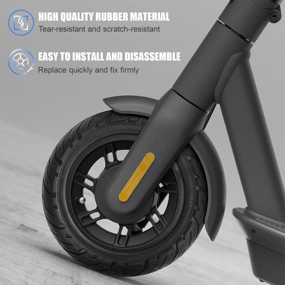 Product Description If you have any questions, please contact customer service first, do not open disputes easily, thank you! Feature: Natural rubber material: made of high quality rubber material, which can produce certain deformation under the action of external force and can recover quickly after removing the external force, with high strength, good stability and comprehensive performance. Dual Shock Absorption: internal groove damping and honeycomb shock absorption.The tire can quickly disperse pressure when subjected to unexpected pressure, improving the tire's resistance to damage and ensuring stability. Solid tire: No worries about air leaks. Our solid rubber scooter tires are puncture-proof and durable. Enjoy a smooth ride without the hassle of frequent maintenance! Compatible with: This 10x2.5 inch scooter solid tire is compatible with Ninebot by Segway Max G30 G30P G30LP /Hiboy S2 Max /Hover-1 Renegade. Note: Please make sure the size you need is 10x2.5 inches before purchasing Please note: Didn't fit model for Hiboy S2/S2R Plus/Hiboy S2 Pro/MAX Pro! Specification: Material:Rubber size: Outer diameter 239mm/9.41inch, Inner diameter 148mm/5.87inch, Tire width 63mm/2.48inch Load Capacity:440lbs Temperature Range -50°F"-104°F" Package includes: 1*Tire About Us We accept all payments authorized by eBay. About Us We accept all payments authorized by eBay. powered by