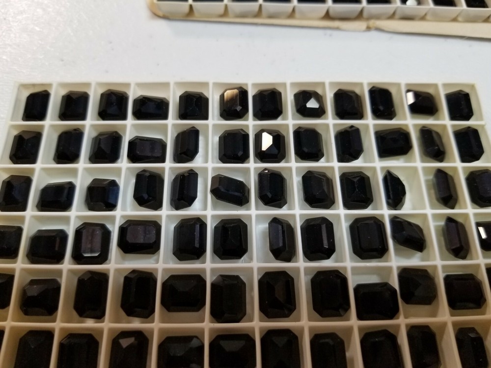 SIZE: 10x8 mm SHAPE: Octagon oblong TYPE: Faceted Solid Unfoiled Pointed Back COLOR: Sparkling Jet Black PIECES: FULL BOX of 144 pieces 1 gross COUNTRY: Austria Swarovski FOILED OR UNFOILED: unfoiled HOLE OR NO HOLE: no hole CONDITION: Never used in excellent condition Vintage old stock never used. BUY AS MANY ITEMS AS YOU LIKE IN MY STORE AND SHIPPING WILL NEVER GO UP ON MOST ITEMS LISTED Excluding poundage lots BE SURE ALL IS ON 1 INVOICE BEFORE YOU PAY OR REQUEST A TOTAL SO USE A COMPUTER TO ADD TO CART THEN CHECK OUT AS SOME CELL PHONES DO NOT ALLOW YOU TO COMBINE