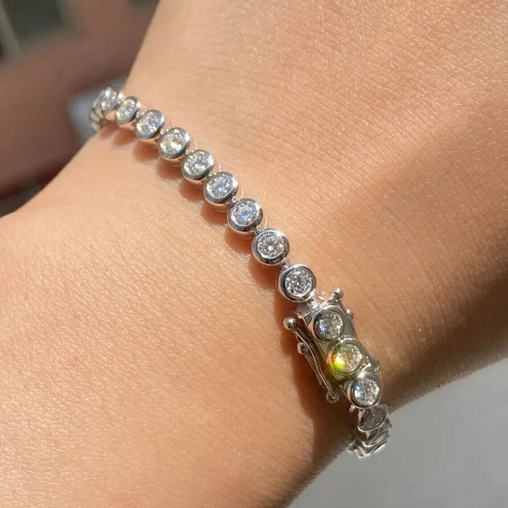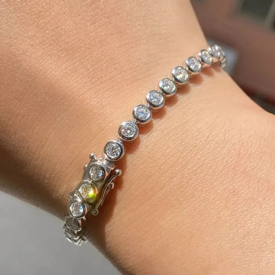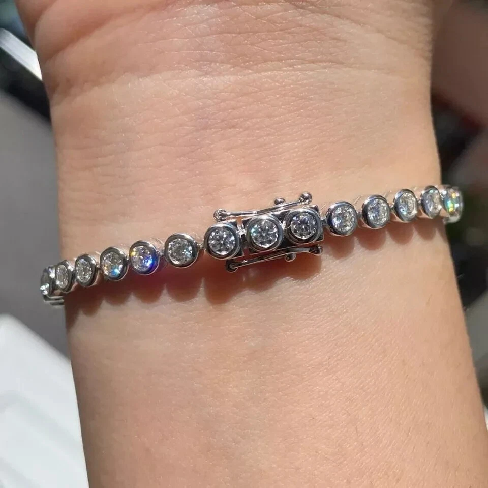 Elevate your style with this stunning 11 CT Real Moissanite Women's Bracelet, perfect for any occasion from engagement to graduation, wedding to Valentine's Day. The bracelet features a round link chain with a box closure and a bezel setting style. The main stone is a lab-created moissanite with a white gold plated metal, measuring 4mm in width and 0.9mm in depth. This handmade charm bracelet is customizable and comes with a certification from GRA. The bracelet is nickel-free and made with 925 silver. The eye-clean gemstone clarity grade and flawless diamond clarity grade add to the brilliance of this piece. This bracelet is a timeless addition to any jewelry collection and is sure to sparkle.