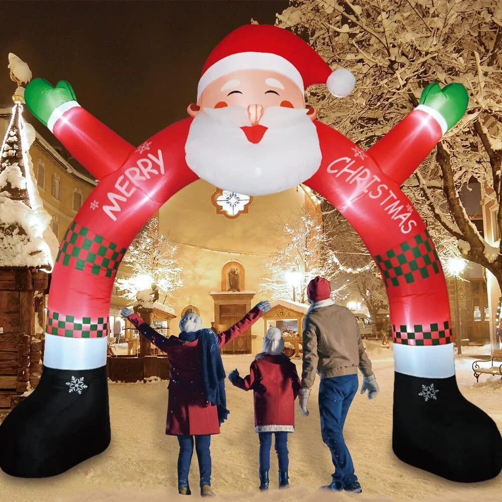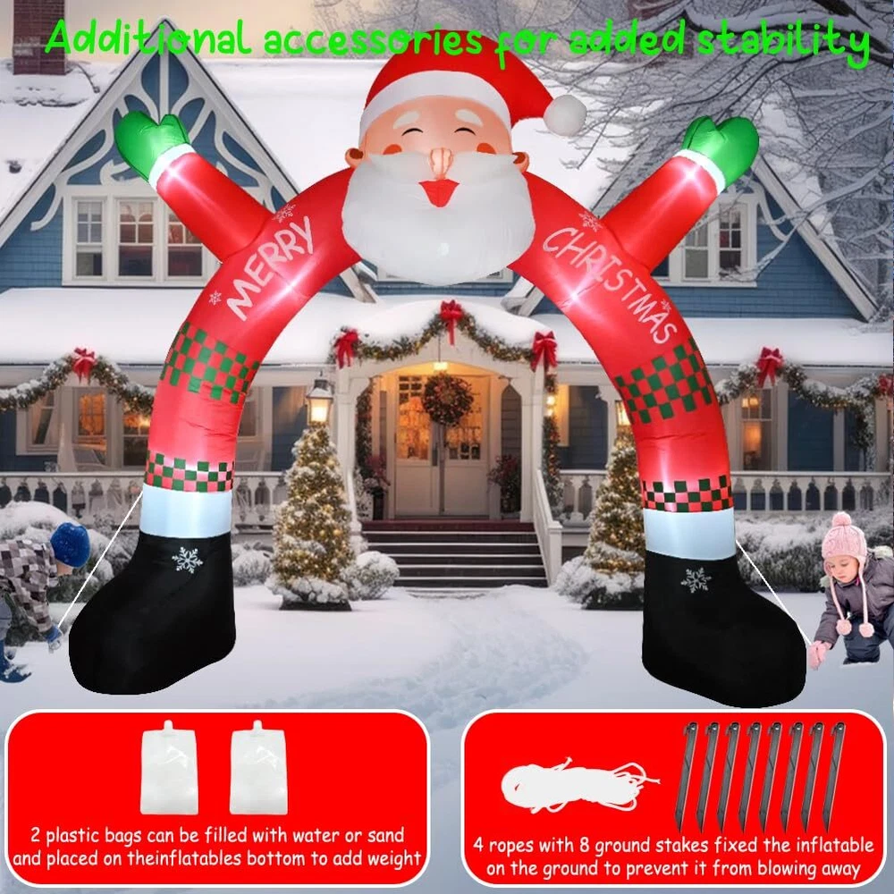 11 FT Christmas Inflatable Archway Decorations, Christmas Inflatable Santa Claus Arch Blow Up Yard Decorations with Built-in Led Lights for Xmas Holiday Party Indoor Outdoor Garden Lawn Winter Decor Perfect Christmas Decorations: Each package includes 1 inflatable fan, 1 adapter, 8 plastic ground stakes, 2 water bags, 4 ropes and instructions. The ground stakes can help you secure the decoration to the ground. What’s more, the power cord also gives you more freedom to place this Christmas decor around your home. Eye-catching LED Light: Christmas archway inflatable decoration comes with bright built-in LED lights. How awesome is that! That inflatable Christmas yard decorations will definitely surprise your neighbors and friends! High Quality: Our santa arch inflatable products use high-strength waterproof polyester fabric, built-in fixed water bag, four tethers and eight ground stakes, which are more stable for outdoor use. Make it work well in different weather,perfect for Christmas outdoor yard decorations. Easy to Set up: Connect to the power supply to inflate, make sure the blower is facing outwards, and it will blow up within minutes. Additionally, unplug the power and it will also deflate so quickly that you can easily fold it up when not in use. Festive Holiday Spirit: The Christmas inflatable archway decorations will bright the cheerful atmosphere of Christmas night. It's nice and good for festival celebration, you can also send it to your children and friends as christmas gifts, having a good enjoyment during the christmas festival.