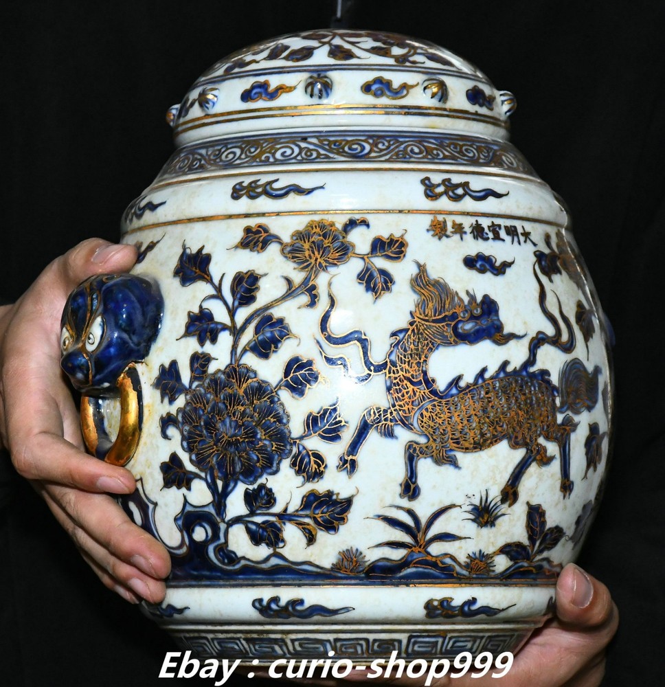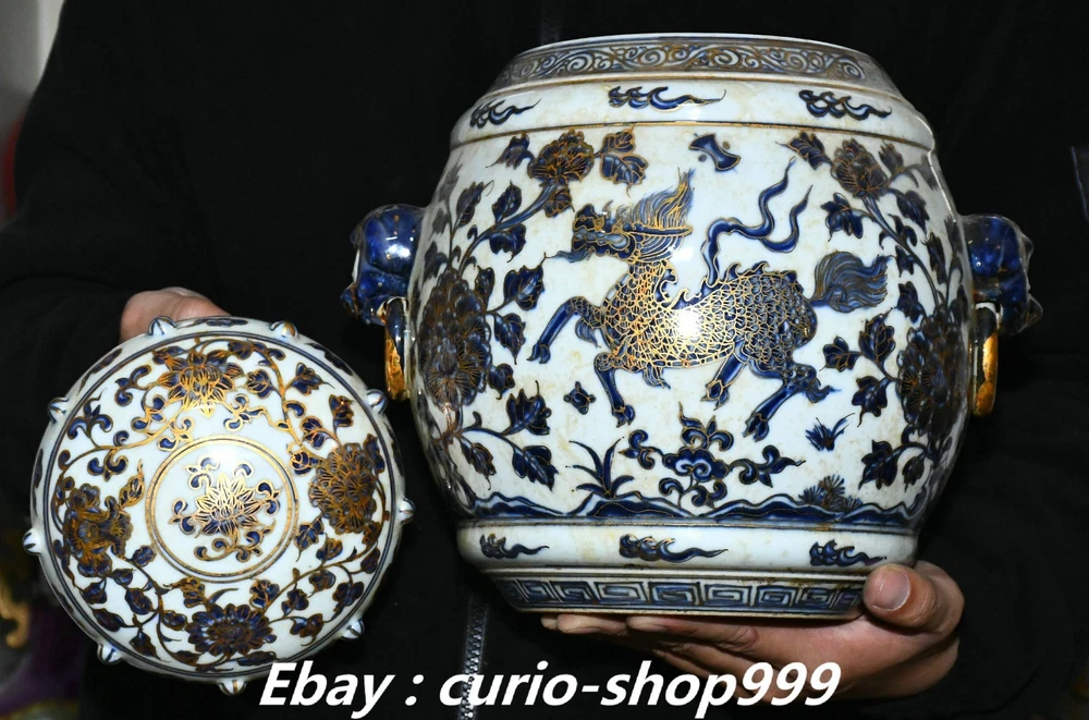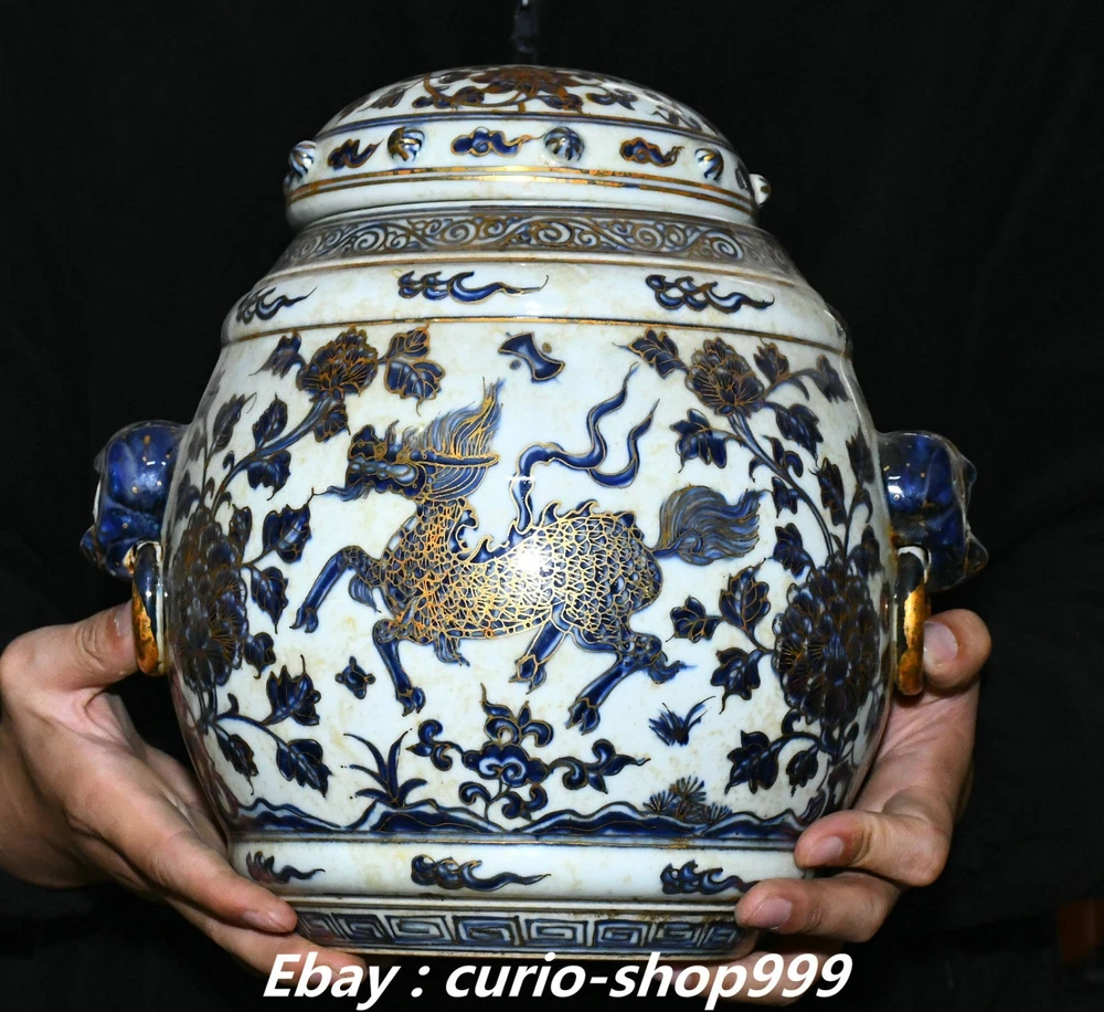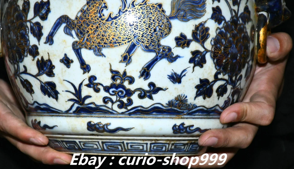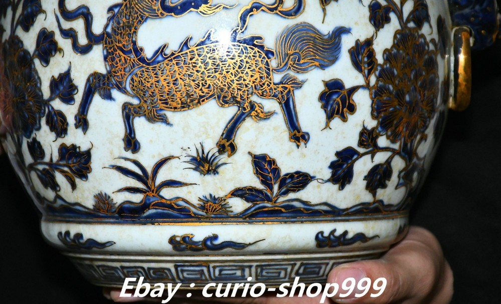 **** Welcome to our antique & Collectable Shop : Porcelain**** Description: Here is 11" Ming Xuande Marked Blue White Porcelain Gilt Kylin Qilin Beast Crock Pot Jar . It is in good condition, and was created by skilled craftsmen in traditional style with fine handcrafts.This is a great piece of valuablellection, a valuable personal alter or a very good present. the handwork is very fine with incredible detailling. Don't miss out this chance to get it.Wish you good luck! Material : Blue White Porcelain Gilt Size: Heigh 11.4 Long 10.2 breadth 8.2 (inch) Condition Perfect Condition. Perfect, with no scratc hes, flaws or repairs. Weight: 7.6 KG----included the weight of packing materials Shipping cost to all over the world countries in Free Honored Customers: We are selling the collectibles products and crafts in Beijing ,China since 1993 and collected them all over the world all the time . In our shop the bronze sculpture, animal, vase, urn, flowerpot,Incense Burner.Table chair sets. Militaria goods. buddha statues, Bodhisattva Statues, Buddhist Ritual Items etc is our speciality .Many of the items we sell come from our own personal collection and have been in our family for a very long time .My great-grandfather was the first in this family to start collecting art & antiques when he still lived in San Xi and Tibet around 1922 ,some of the paintings he once collected can now be seen in museums around the globe.We won't make money from t he shipping cost, if you dislike the item when you receive it,we can refund all of your money to you within thirty days. Please confidence for bidding . We recommend the combine shipping and offer you an big price discount if you order more items together ! 2025.10.17 四 号