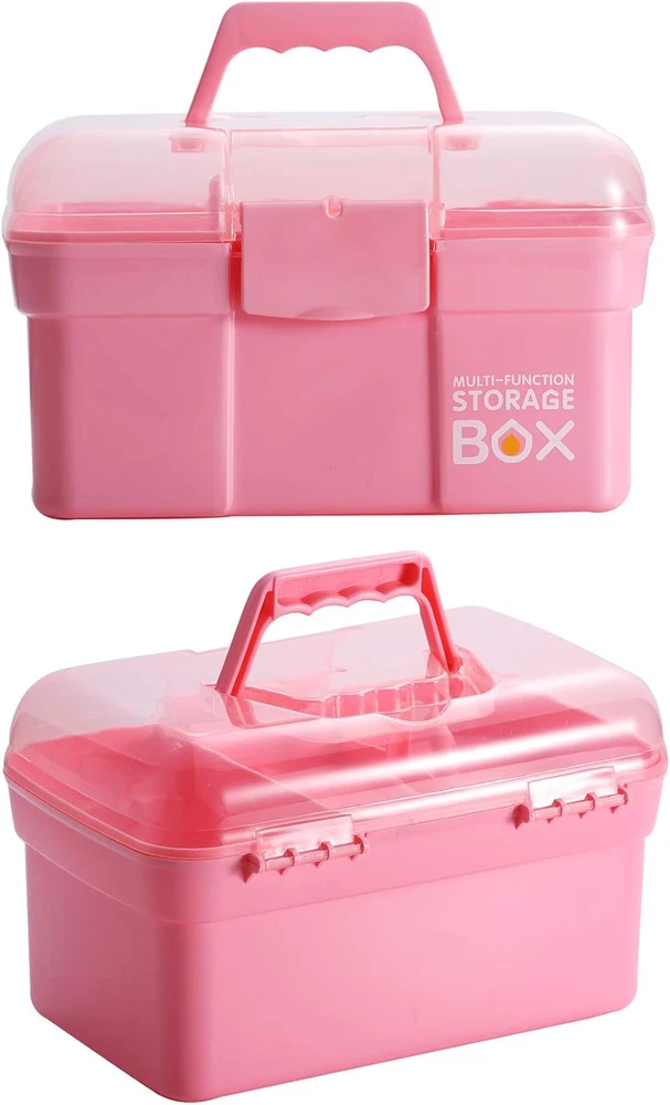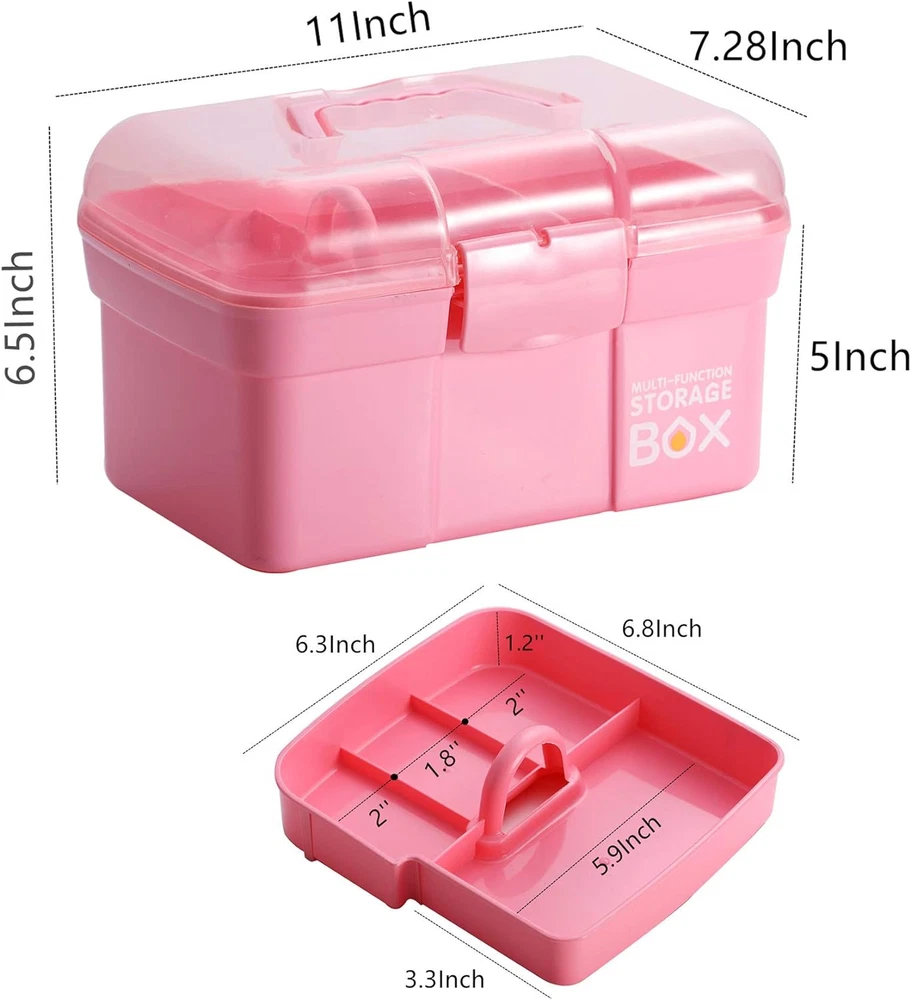 The storage box set is a versatile, well-designed set. Latch with geometric lock for smooth and easy use The storage case features a handle for easy transporting and a removable tray with small compartments Approximate Dimensions: 10.63" L x 7.48" W x 6.5"H Clear, handy storage box with handle to keep your essentials organized The pink color is fun and attractive to bring anywhere. Perfect for art and craft supplies, tools, medicine, sewing kit, cosmetics or fishing supplies Product Description About This Item Material: Plastic Color: Pink Brand: Kinsorcai Approximate Dimensions: Exterior - 11 x 7 x 6.5 inches Multiple compartment design is suitable for storing items of different sizes Upgrade quality ABS material Very lightweight but durable