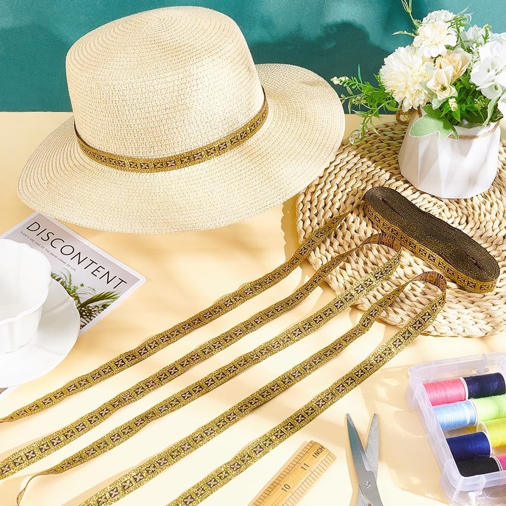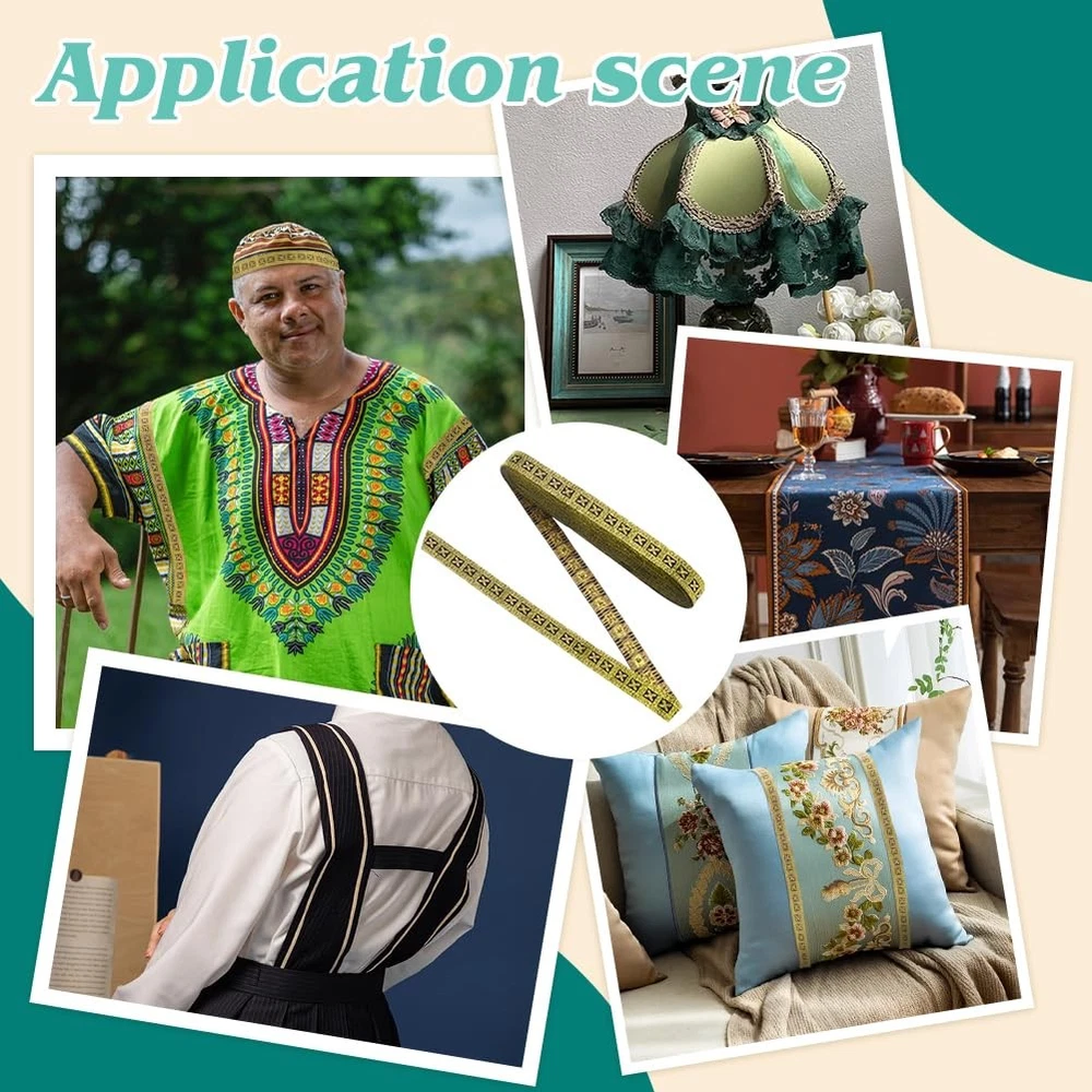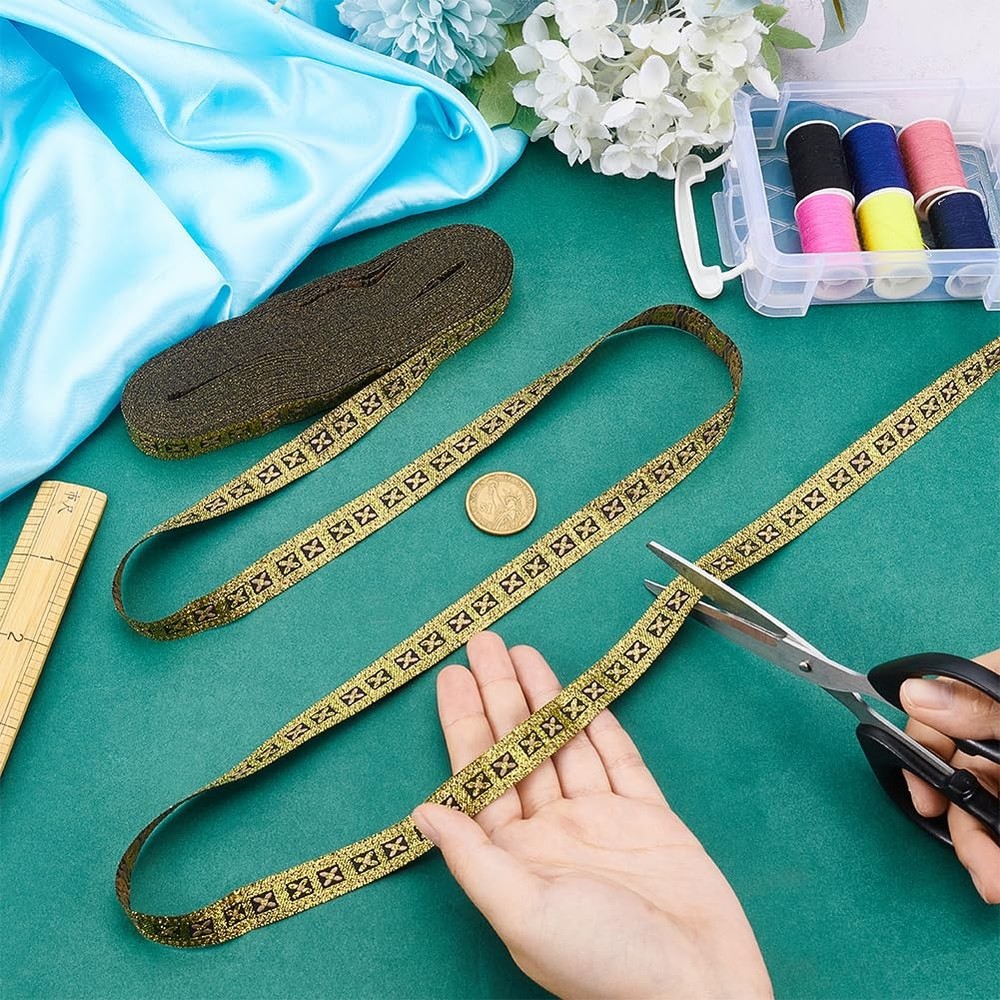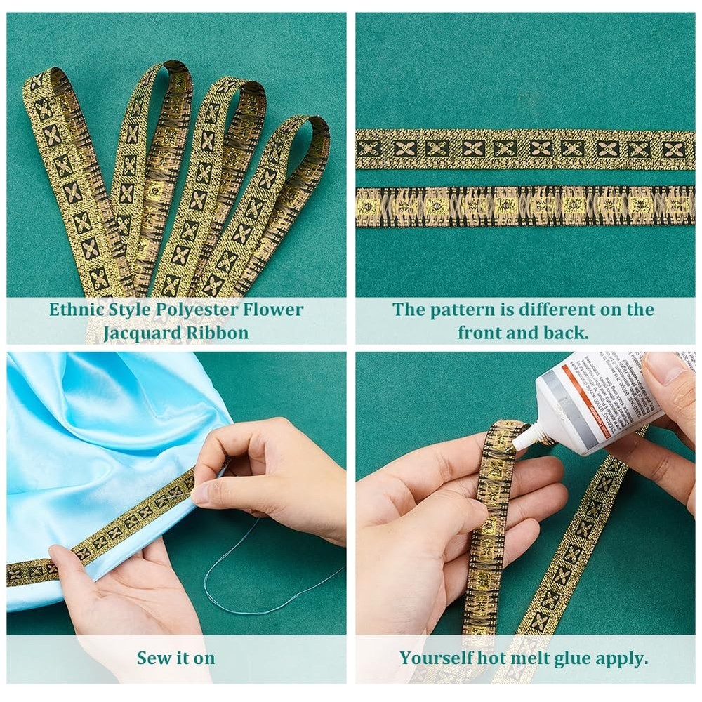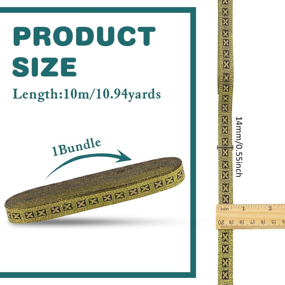 11 Yard Vintage Flower Metallic Jacquard Ribbon 1/2" Wide Floral Gold Woven Trim Polyester Ethnic Style Webbing Strap Retro Decor Sewing Ribbon for Sewing Clothing Wedding Gift Wrapping Package & Size: You will receive about 11 yards /10m gold vintage jacquard ribbon with ethnic style which is about 1/2 inch(14mm) wide. The enhanced look and added appeal that comes from using jacquard helps to make your craft stand out. Delicate Design: The jacquard ribbon is black in color, with dotted light brown lines depicted on both sides of the ribbon, which are outlined with gold thread in a wide-bordered lattice, and in each lattice resides a small four-leafed flower, with two types of florets residing interspersed, one with a gold core and light brown petals, and the other with a light brown core and gold petals. Reliable Material: This jacquard trim is made of high quality polyester, smooth workmanship and neat embroidery, machine washable with no color fade, strong and durable, can be used for long time. DIY Crafts: Perfect for making clothing, purses, scrap booking, headbands, hair accessories, greeting cards, holiday cards, invitations, picture frames, placemats, quilts, table runners, pillowcases, wallets, clutches, watchbands, jewelry making, trims for bags or vests. Gift Wrapping: Good decoration ribbons on your DIY craft projects for gift wrapping, bridal, wedding, birthdays, valentine, anniversary to be more unique, national characteristics and retro atmosphere. Specifications: Material: Polyester; Color: Gold; Style: Ethnic Style; Shape: Flower; Size: about 1/2 inch(14mm) wide, 11 yards(10m); Package List: 11 yards(10m) Jacquard Geometric Ribbon; Shipping We offer FREE shipping on all orders! We ship within Three business days of payment, usually sooner. We use a selection of shipping services such as UPS, FedEx, USPS etc. We only ship to the lower 48 states, no APO/FPO addresses or PO Boxes allowed. Local pickups and combined shipping options are not provided at this time. Return You can return a product for up to 30 days from the date you purchased it. Any product you return must be in the same condition you received it and in the original packaging. Please keep the receipt. Payment We accept payment by any of the following methods: PayPal Please pay as soon as possible after winning an auction, as that will allow us to post your item to you sooner! Feedback Customer satisfaction is very important to us. If you have any problem with your order, please contact us and we will do our best to make you satisfied. Contact Us If you have any queries, please contact us via ebay. We usually respond within 24 hours on weekdays. Please visit our eBay store to check out other items for sale! Thank you for shopping at our store.