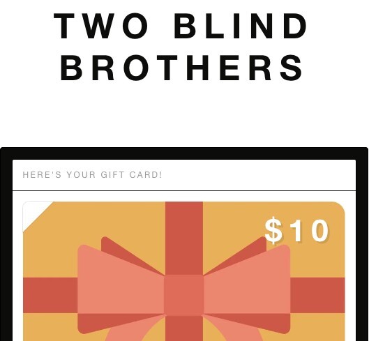 Gift Cards For Sale: $110 Gift Card Value for Two Blind Brothers. You will be buying two Gift Cards valued at $100 & $10 for a total value of $110. Online Shop: http://twoblindbrothers.com/
