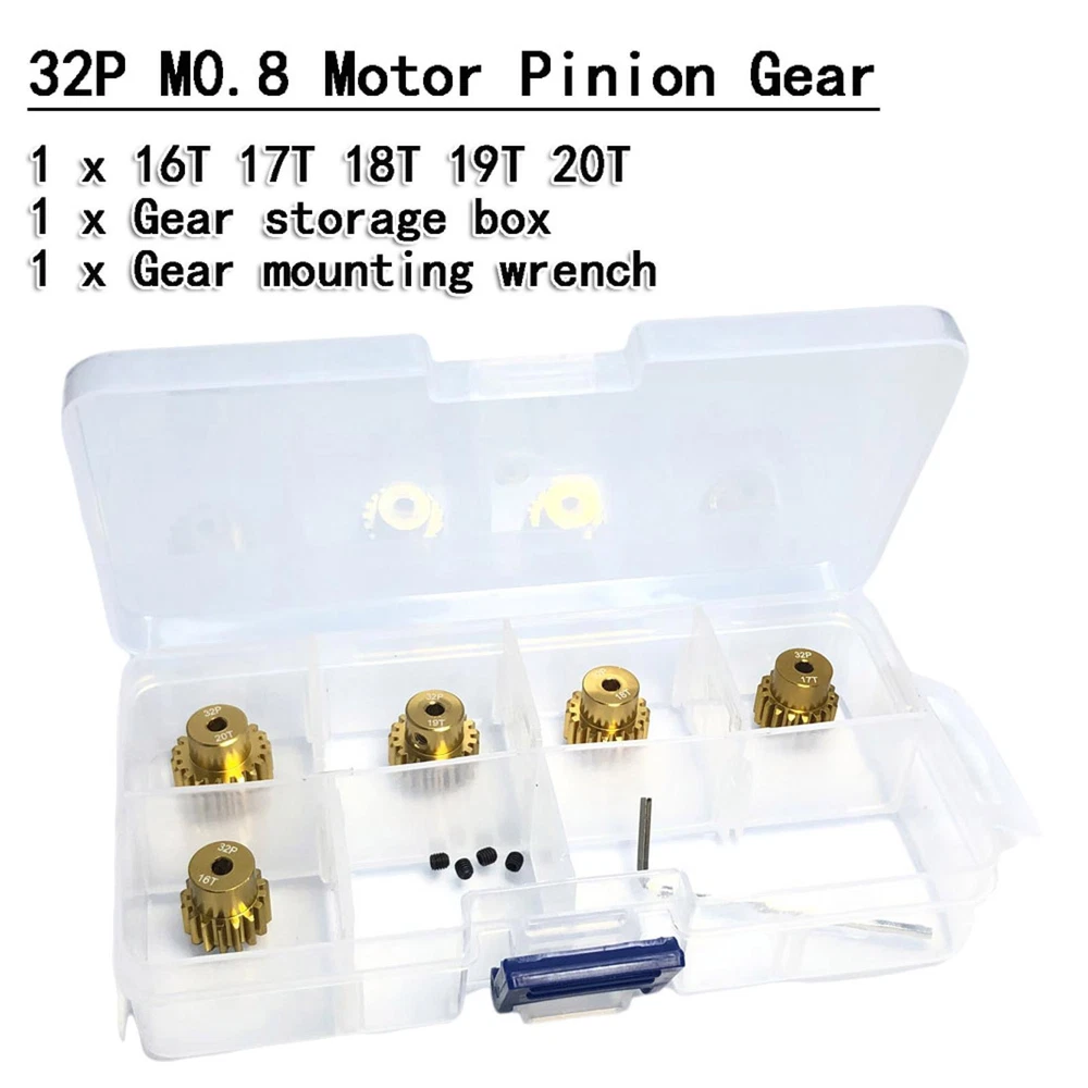 NEW-00023 1/10 RC Car 16-20T 0.8M 32P 3.175mm Assorted Motor Pinion Gears w/ Wrench&Screws PRODUCT DESCRIPTION Features: Aluminum metal material provide with longer life, more durable and wear-resistant With wide thick gear teeth and deep gear groove, can withstand more force which is not easy to sweep the teeth. 5 different specifications of motor gears provide more choices for your RC car. A M3 set screw has been added to each pinion gear 32P compatible with 0.8 metric (0.8M) pitch. Suitable for 1/10 RC Car truck brushed brushless motor Specifications: Material: 7075 Aluminum metal Diametral Pitch: 32 DP Suitable Shaft Diameter: 3.175mm Model: 16T-20T Package includes: 5* Metal Gear 5* Screw 1* Wrench Shipping Contact Us Our products have been sent to the US warehouse. All items will be shipped via WINIT CORPORATION. In 2-5 working days, you will receive your items. Thank you and have a nice day. If you have any question about us or items, please contact us, we will reply it as soon as possible. Shipping Our products have been sent to the US warehouse. All items will be shipped via WINIT CORPORATION. In 2-5 working days, you will receive your items. Thank you and have a nice day. Contact Us If you have any question about us or items, please contact us, we will reply it as soon as possible. PaymentShippingReturn policyAbout usContact us Copyright © - Tongtool All rights reserved | Design:Tongtool
