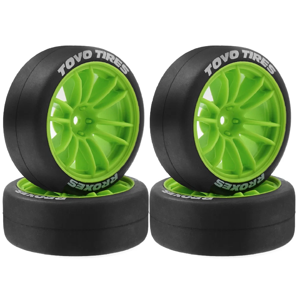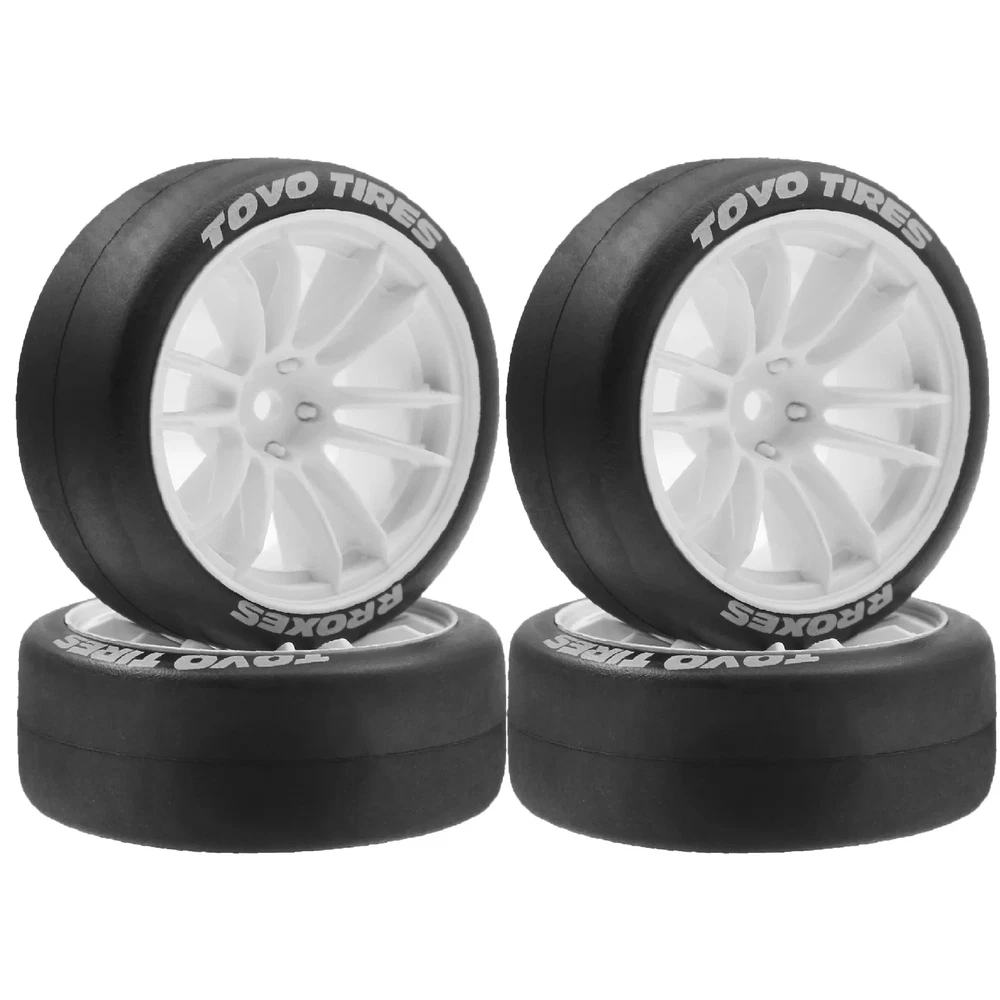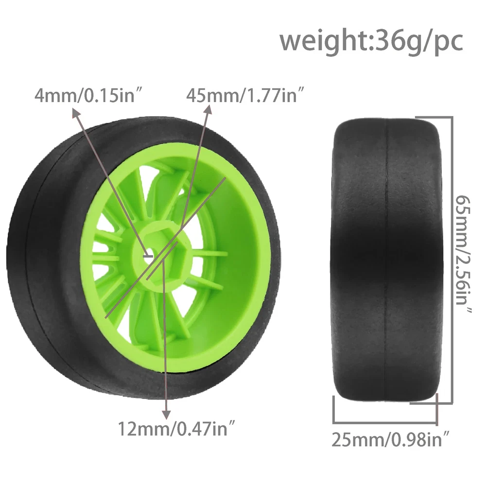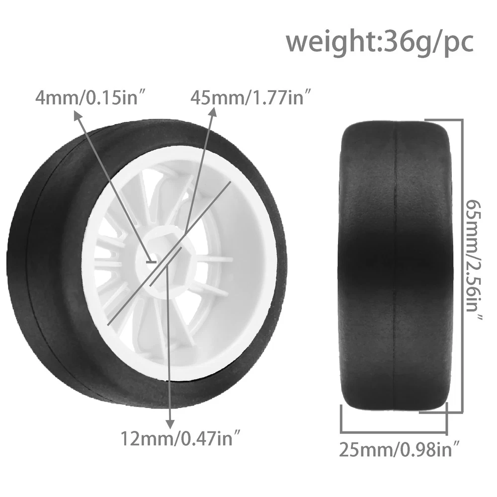 Features: The 1:10 scale tires of 12mm hex are for 1/10 rc drift racing car Tamiya XV01 XV02 TA06 TT01 TT02 PTG2 144001 A959 HPI KYOSHO. This 1/10 rc drift tires of size,Drive Hex:12mm(0.47in);Outer Diameter:68mm(2.8in);inter Diameter:52mm(2.05in);Width:27mm(1.06in); This 1/10 drift car tires designed for rc rally racing car or rc on road racing car.it are designed with special textures, which provide strong anti slip and grip. This 1/10 rc drift tires and wheels is small size easy to replace. The 1/10 rc drift car tires are not pre glued on rims, please clean the joint surface of the rim and tire before gluing.Gluing the tires is also a way for players to experience the fun of rc. Specifications: Rim colour: White or Black Quantity: 4Pcs/set Weight: 153g/set Material: Rubber tires / plastic wheels Width:26mm/1.02in Outside diameter:65mm/2.56in Inter diameter:51mm/2.00in Wheel Drive Hex:12mm/(0.47in) Please make sure our 1/10 rc rally tires and wheels are the correct size you are looking for to avoid returning the product and save you time. Package List: 4 * 1/10 rc drift tires and wheels rims Note: Light shooting and different displays may cause the color of the item in the picture a little different from the real thing. The measurement allowed error is +/- 1-3cm. We highly recommend using the professional tools to mount it, otherwise, the rc rally tyres adapter will be severely worn! The wheels and tires are not glued together and must be glued before use. Please carefully check the tire size before purchase, whether it is the same as your model tire size, and confirm it again before payment, so as not to return the refund, thank you, wish you a happy shopping.