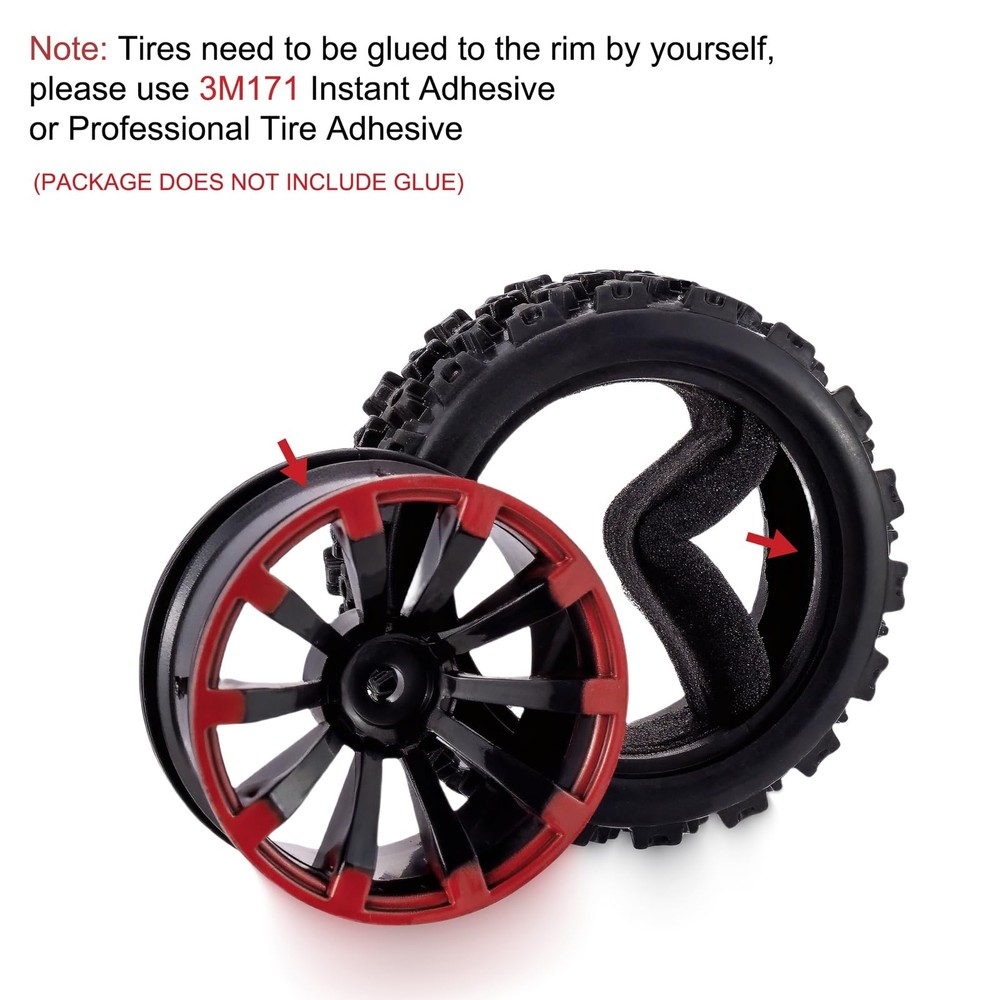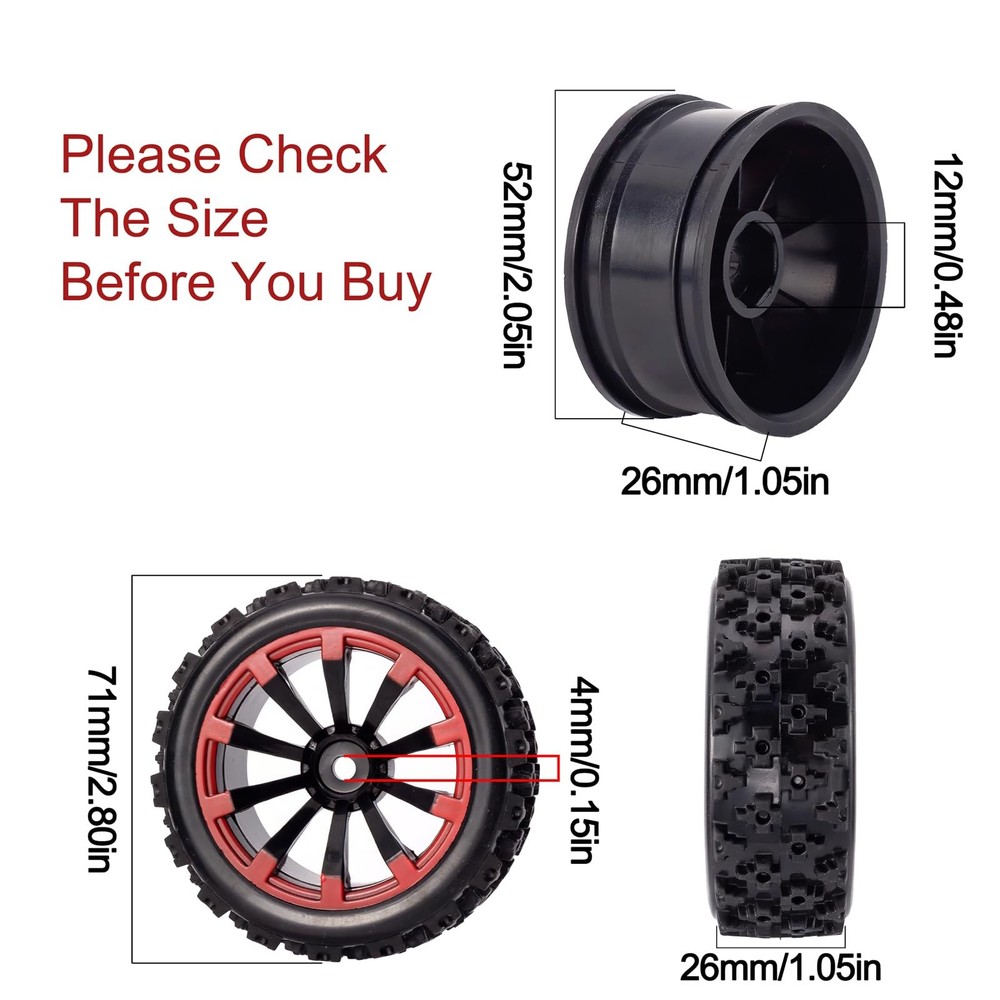 Features: Material: plastic wheel rim, soft rubber tyre with foam insert; Need to glue before using. It’s suitable for RC 1/10 on road car, also can be used for 1/14, 1/16 off road buggy with 12mm hex. Not for 1/10 Scale Off Road Truck / Buggy. Dimensions: Tire outer diameter: 72mm/2.83" Wheel diameter: 45mm/1.77" Tire width: 27mm/1.06" Wheel hex: 12mm/0.47" Axle hole diameter: 4mm/0.15" Please must check size before buying. How to Strengthen Wheel Rims: (1) First, make sure the wheel center hole size matches the original OEM rims. Sometimes you may need to drill out the center hole slightly so the rims fully fit over the axle shaft. (2) It is best to use nylon insert lock nuts with flanges. (3) To add a washer. Adding a washer to the outside of the rim will evenly distribute the force over a wider area. For extra strength, can glue the washer to the rim.(This is not necessary, up to you) Package Contents: 4 x Wheel Rims 4 x Tires with Foam Inserts Tire Outer Diameter: 72mm/2.83",Tire Width: 27mm/1.06"; Wheel Diameter: 45mm/1.77"; Wheel Drive Hex: 12mm/0.47"; Axle Hole Diameter: 4mm/0.15" Application: Suitable for 1/10 On Road Rally or Touring Car; NOT for 1/10 Off Road Truck / Buggy; Also Can Run on 1/14, 1/16 Off Road Buggy With 12mm Drive Hex Widely Used: Compatible for Tamiya TT02 Subarus, MF-01X, XV-01, Kyosho Fazer, Wltoys 124018, 124019, 144001, A959B, Mini-b 2.0, Mini T 2.0, Reflex 14R, Latrax Teton, HBX 18859, XLF F16, etc. Material: Soft Rubber Tires & Foam Inserts, 10-Spoke Plastic Wheel Rims; Rally Block Tire Tread with Nice Grip and Traction on Most Flat Road and Off Road Surfaces Note: The Tires are NOT Pre Glued on Rims, Please Clean the Joint Surface of the Rim and Tire Before Gluing; 3M171 Instant Adhesive or Professional Tire Glue are Recommended (NOT INCLUDED IN PACKAGE)