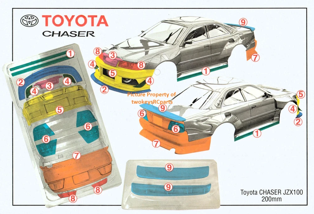 AS ALWAYS - before purchase - check the specs given below to ensure this body shell is suitable for your needs. CLEAR UNPAINTED LEXAN BODY SHELL to suit a 1:10th scale race, drift or touring car. Body shell is as per pics #3 ~ #8 --Toyota JZX100 Chaser- Supplied with decals pics #9. Also supplied are body enchacement parts, double sided tape and mounting hardware -see pic #8. Instructions to aid assembly are also included -see pic #10. Pic #1 is for reference only- to show the general shape of the body and as an aid for decal placement. So please check the pics out and read the ad. Body shell is for a chassis (wheelbase) of 258 mm and a wheel track of 200mm.( manufacturers specs quoted) Item is new. Body is well finished and made of strong Lexan. Shells are covered with clear spray film. This item will be sent in a box (for safety) not a bag. Body shell may be trimmed for postage purposes so excess plastic may be less than shown in pics. Part # 100 Check out other great bargains in my E b a Y store , including more body shells. I am not a "drop shipper", all products are in stock in Australia being sold by an Australian seller POSTAGE - AUSTRALIAN CUSTOMERS . If you want to use the Express Post service please buy one item and select Express post, then buy any other items you want with regular post (the default option). All items will be sent together via Express Post service……… INTERNATIONAL CUSTOMERS . For post quotes for multi item orders please message me. Thanks. All duties and taxes (if applicable) are the responsibility of the buyer. If you have any questions or special requests regarding this please feel free to message me. Manufacturers are constantly improving products and changes are made without prior notice. This means that changes can be made to products (including slight colour changes) from time to time. These changes in no way constitute any intent to change the basic description of an item, nor do they constitute a reason for an items return or warranty replacement. Return Policy: Any returns will be handled as per Ebay’s return policy. Returned items must be new, unopened and undamaged. Opened returns will attract a 50% “reduced value” fee. Any unrecoverable costs and fees incurred (by me) will be deducted from any refund issued. Warranty: items have a 30 day warranty, except drift wheels – which is ‘dead on arrival’ only. Warranty doesn’t cover crash damage, poor maintenance, misuse or incorrect assembly. Warranty covers sold items only.
