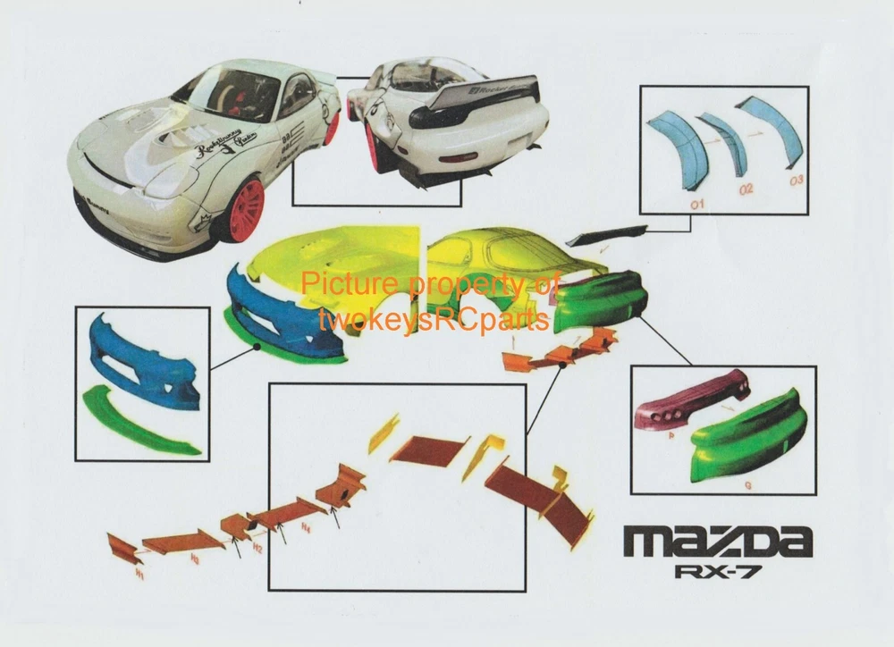 AS ALWAYS - before purchase - check the specs given below to ensure this body shell is suitable for your needs. CLEAR UNPAINTED LEXAN BODY SHELL to suit a 1:10th scale touring or race car. Body shell is as per pics #4 ~ #9 -- Pandem Mazda RX7 FD3S. Supplied with decals pics #11~#13. (Mukka and Pandem decals are included). Also supplied with plastic rear view mirrors,many body enhancement parts-splitter,wings, light buckets etc etc -see pic #10. Window paint masks also supplied -pics #3 & #4. Instructions are also supplied -pic #14. Pic #1 is for reference only -just to give you an idea of the general shape of the car and possibly decal placement. Body shell is for a chassis (wheelbase) of 258 mm and a outer wheeltrack of 195mm (manufacturers specs quoted). Item is new. Shells are covered with clear spray film. Note that often shells are often trimmed for freight purposes so excess plastic may be less than shown above. This item will be sent in a box (for safety) not a bag. Part #RX7 FD3S Check out other great bargains in my E b a Y store , including more body shells and accessories. I am not a "drop shipper", all products are in stock in Australia being sold by an Australian. POSTAGE - AUSTRALIAN CUSTOMERS . If you want to use the Express Post service please buy one item and select Express post, then buy any other items you want with regular post (the default option). All items will be sent together via Express Post service……… INTERNATIONAL CUSTOMERS . For post quotes for multi item orders please message me. Thanks. All duties and taxes (if applicable) are the responsibility of the buyer. If you have any questions or special requests regarding this please feel free to message me. Manufacturers are constantly improving products and changes are made without prior notice. This means that changes can be made to products (including slight colour changes) from time to time. These changes in no way constitute any intent to change the basic description of an item, nor do they constitute a reason for an item’s return or warranty replacement. Return Policy: Any returns will be handled as per Ebay’s return policy. Returned items must be new, unopened and undamaged. Opened returns will attract a 50% “reduced value” fee. Any unrecoverable costs and fees incurred (by me) will be deducted from any refund issued. Warranty: items have a 30 day warranty, except drift wheels – which is ‘dead on arrival’ only. Warranty doesn’t cover crash damage, poor maintenance, misuse or incorrect assembly. Warranty covers sold items only.